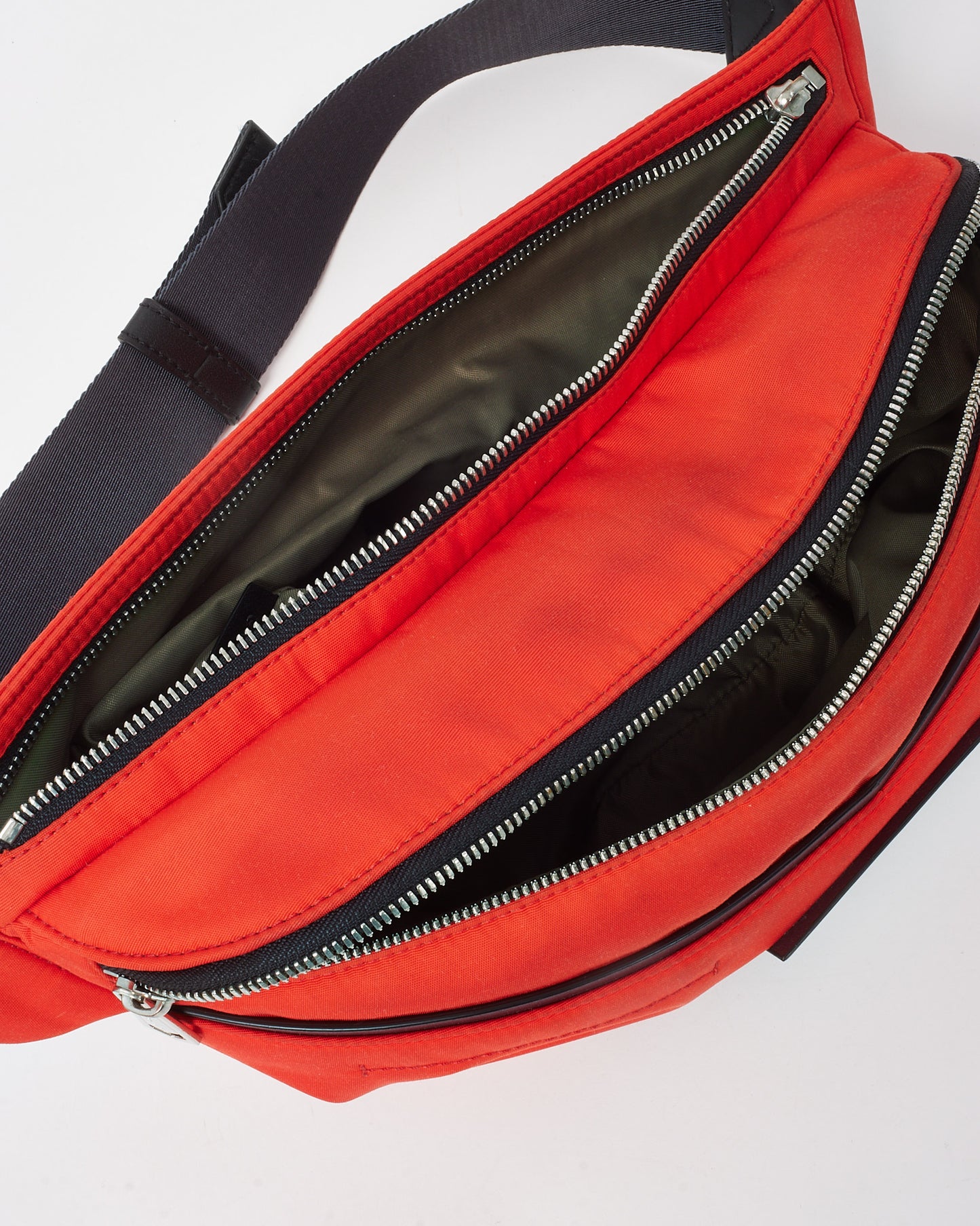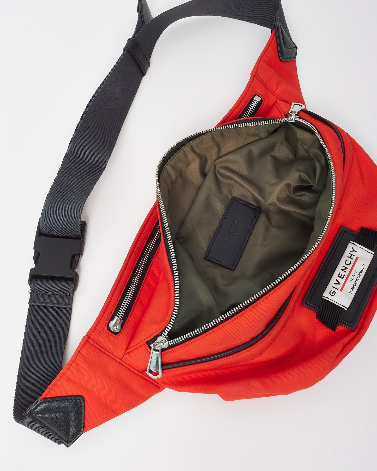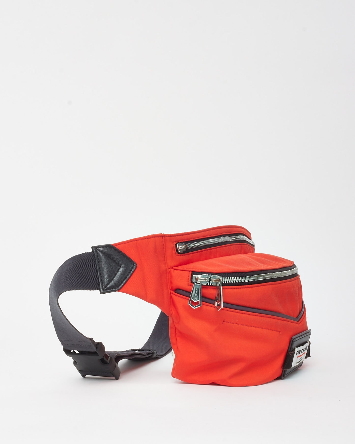 Sporty with a high-fashion twist, this pre-owned authentic Givenchy Downtown Belt Bag is crafted from durable red nylon and finished with the bold Givenchy logo across the front. The oversized silhouette features multiple zip compartments and an adjustable strap, allowing it to be worn at the waist, crossbody, or over the shoulder.