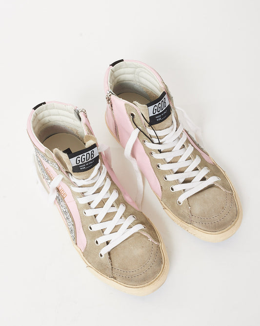 Pink Suede/Beige/Silver Sparkle High-Top Star Sneakers - 38