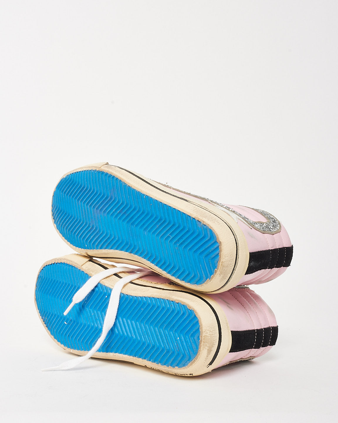 Bold, playful, and unapologetically cool, the pre-owned authentic Golden Goose Pink Suede/Beige/Silver Sparkle High-Top Mid-Star Sneakers bring streetwear edge with a glamorous twist. Crafted from blush pink suede and beige leather, these high-tops are accented with silver glitter detailing and the brand’s signature distressed finish for that effortlessly lived-in look.