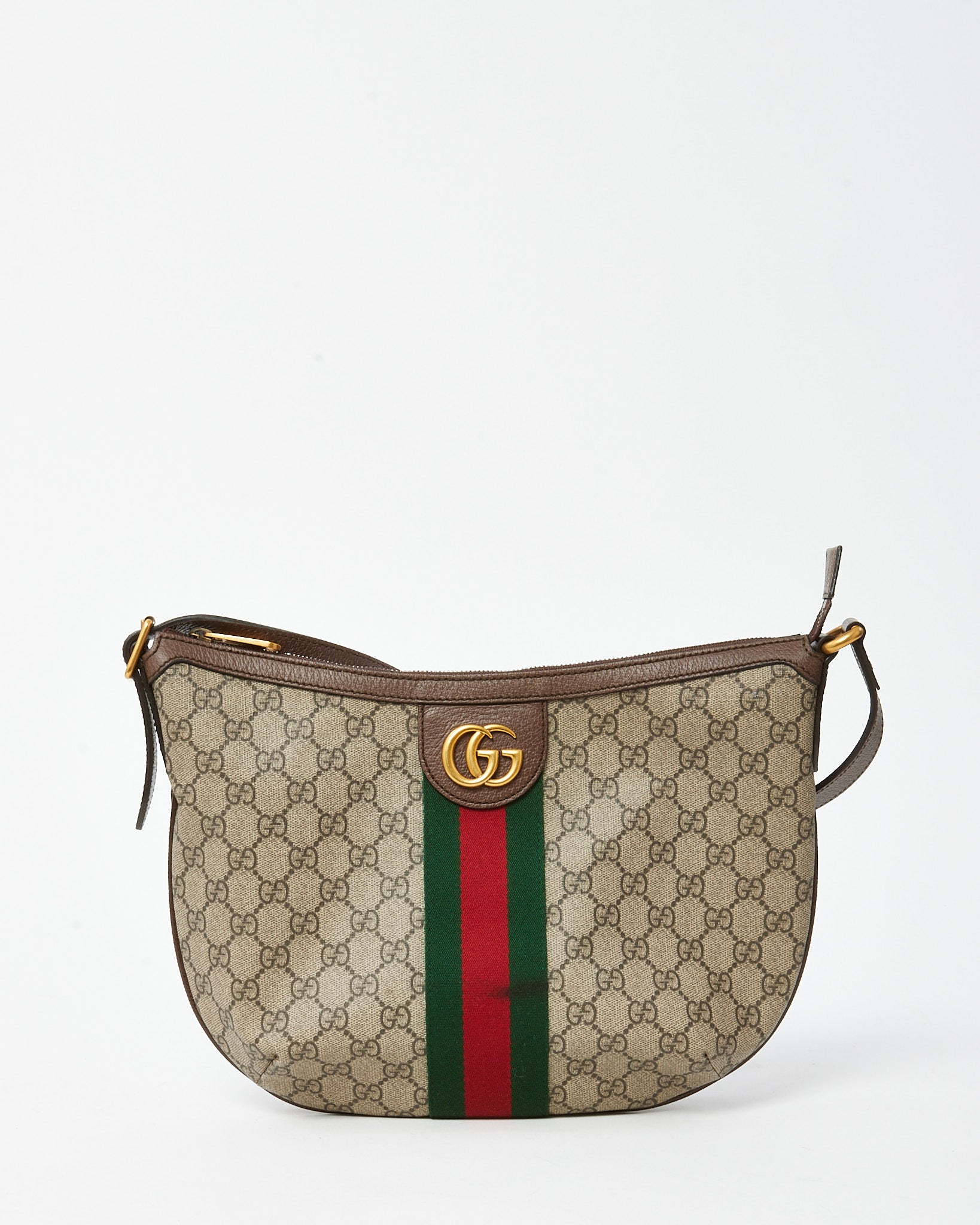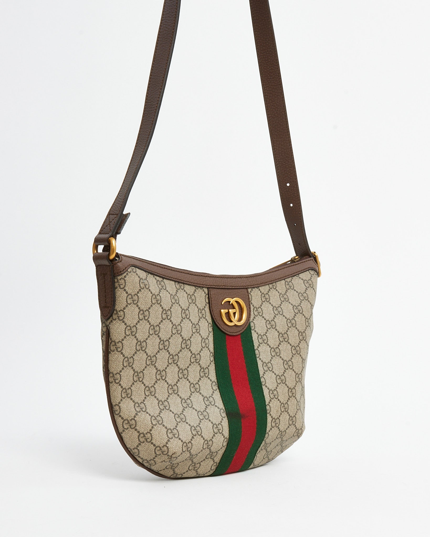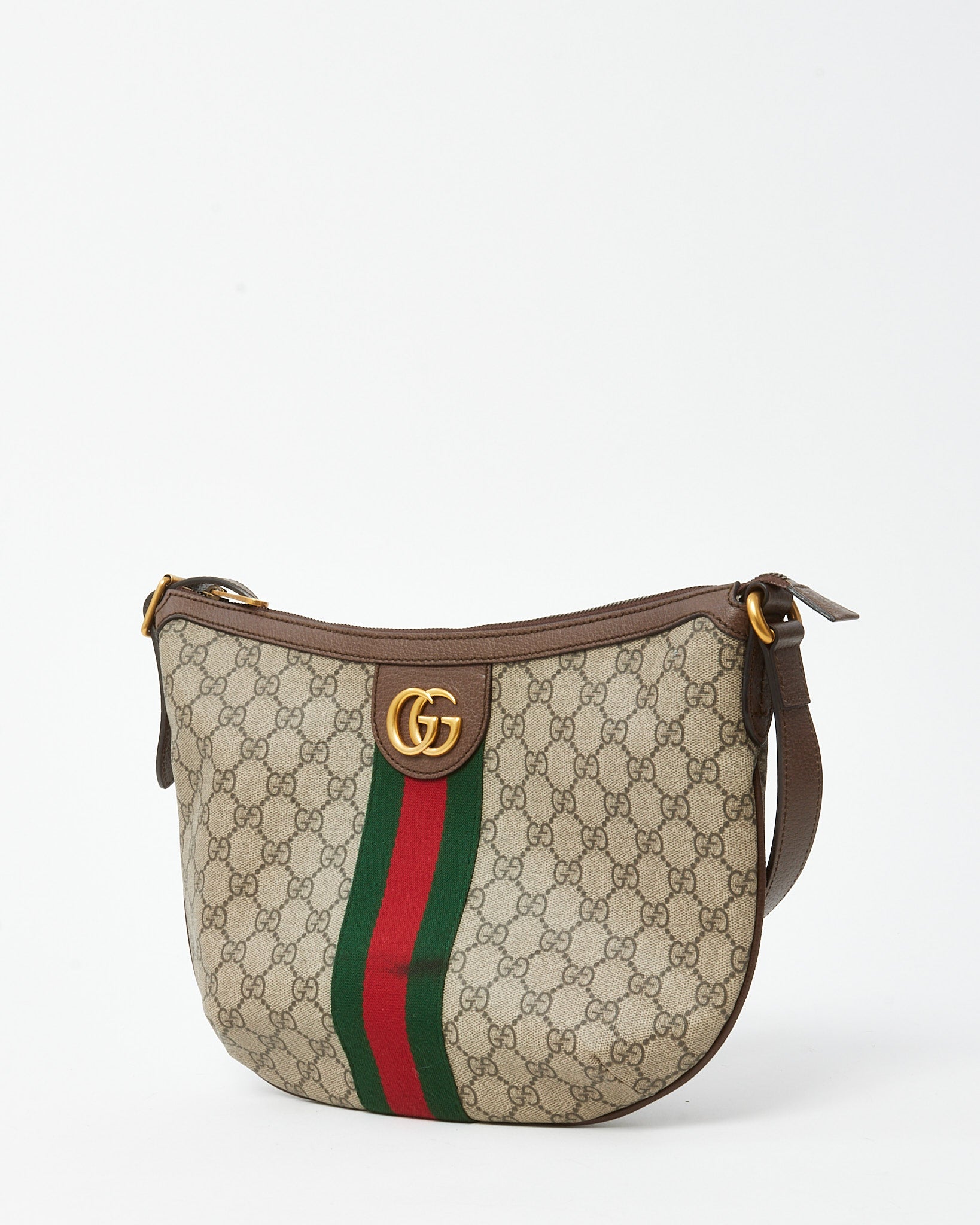 Add effortless heritage style to your collection with this pre-loved authentic Gucci Beige and Beige Monogram GG Supreme Canvas Small Web Ophidia Half Moon Hobo Bag, crafted in durable GG Supreme monogram canvas with refined leather trim. The curved half-moon silhouette is accented with the iconic green and red Web stripe and finished with the signature double G logo for unmistakable Gucci identity. Designed with a comfortable shoulder strap and compact interior for everyday essentials, this Gucci Ophidia hobo bag blends vintage-inspired branding with modern versatility. A timeless designer handbag that captures classic Italian craftsmanship and effortless luxury styling.