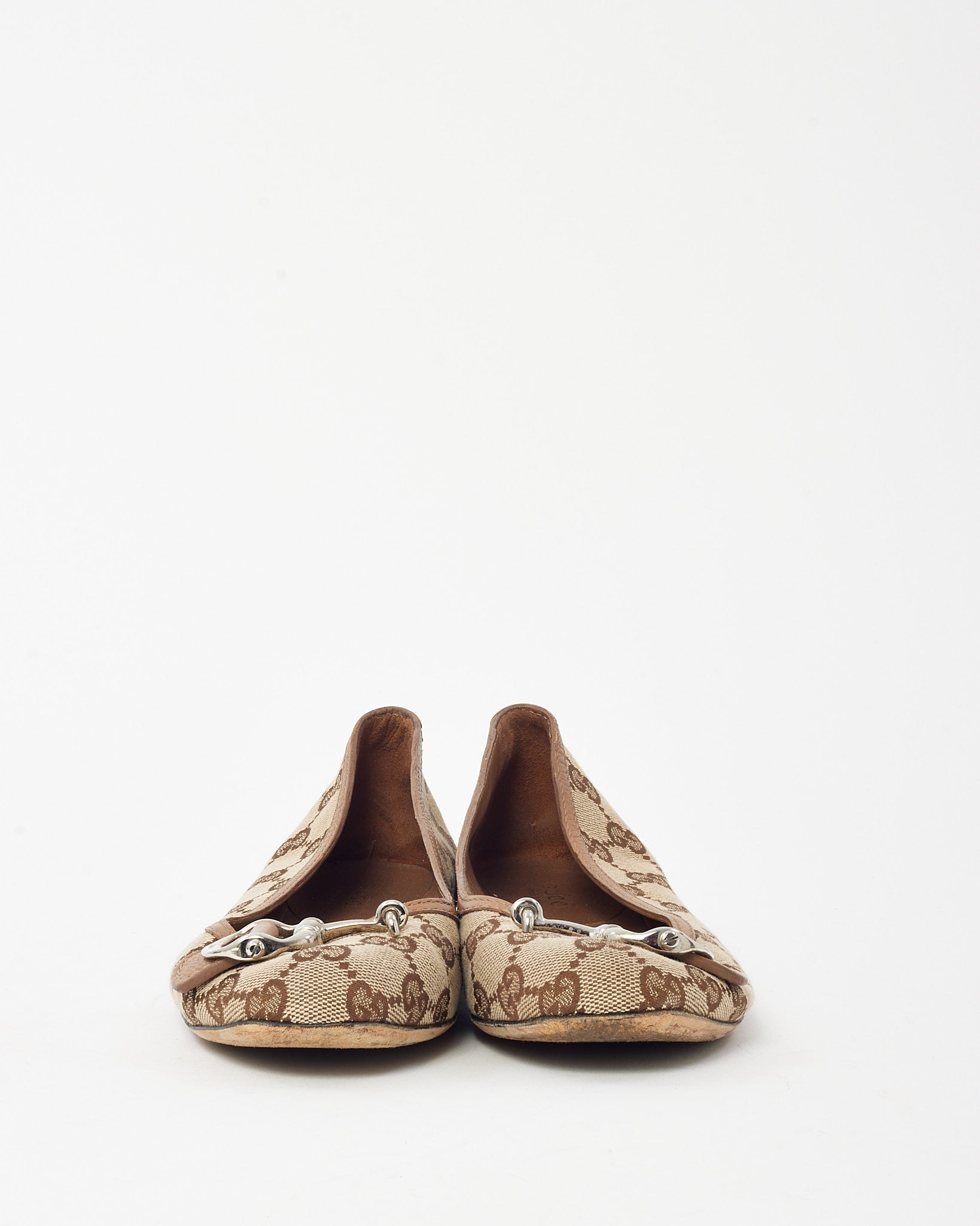 Beige and Brown GG Monogram Canvas Horsebit Flats - 36