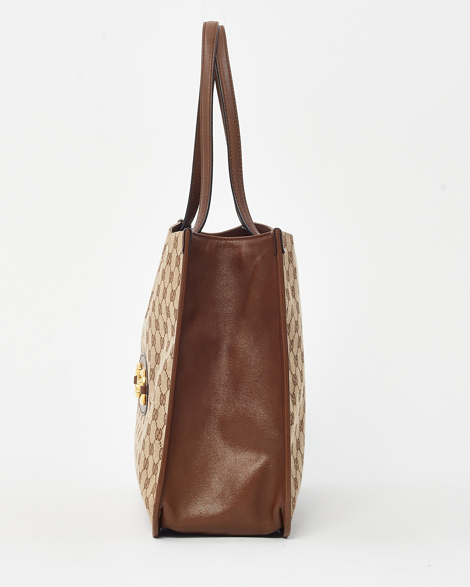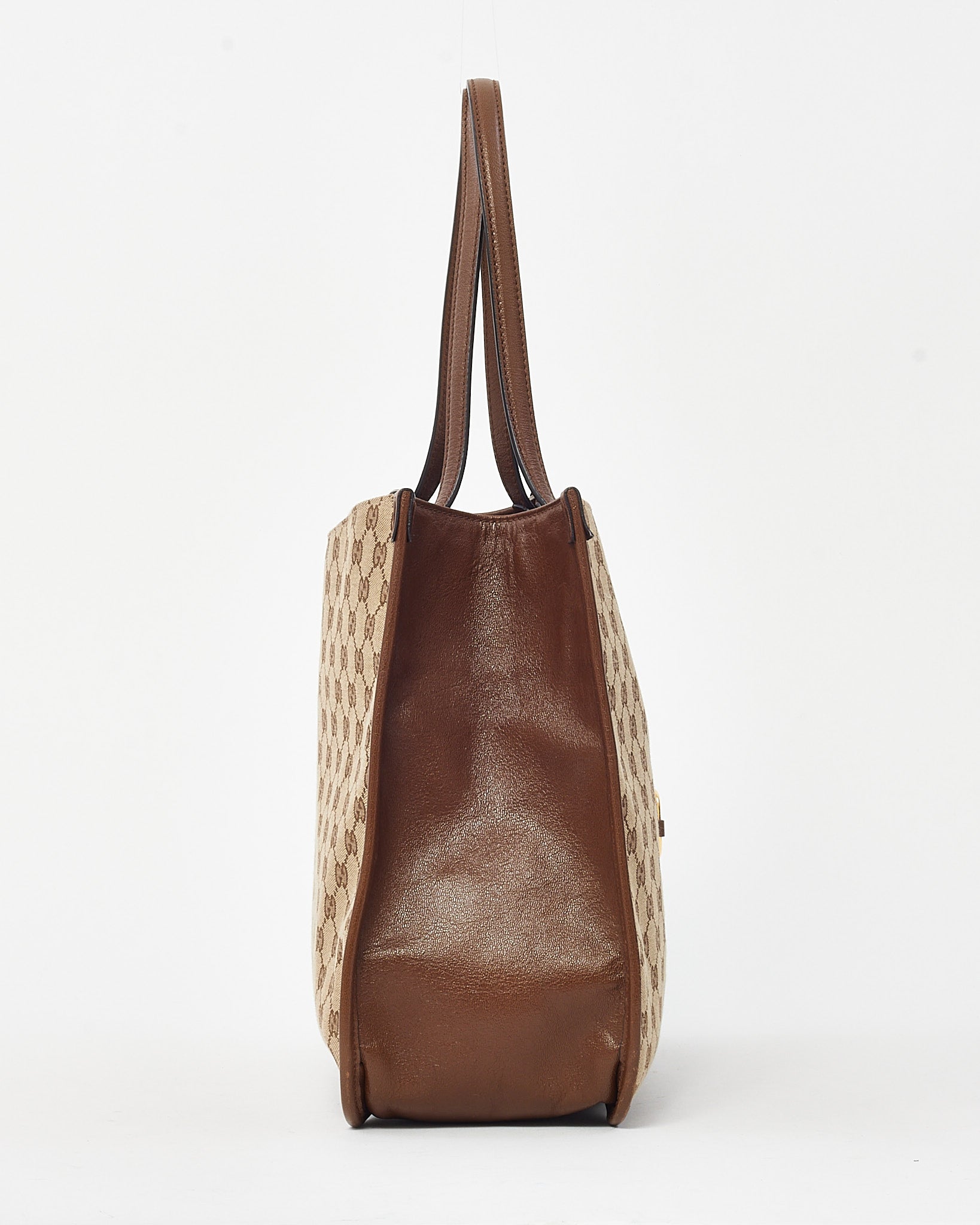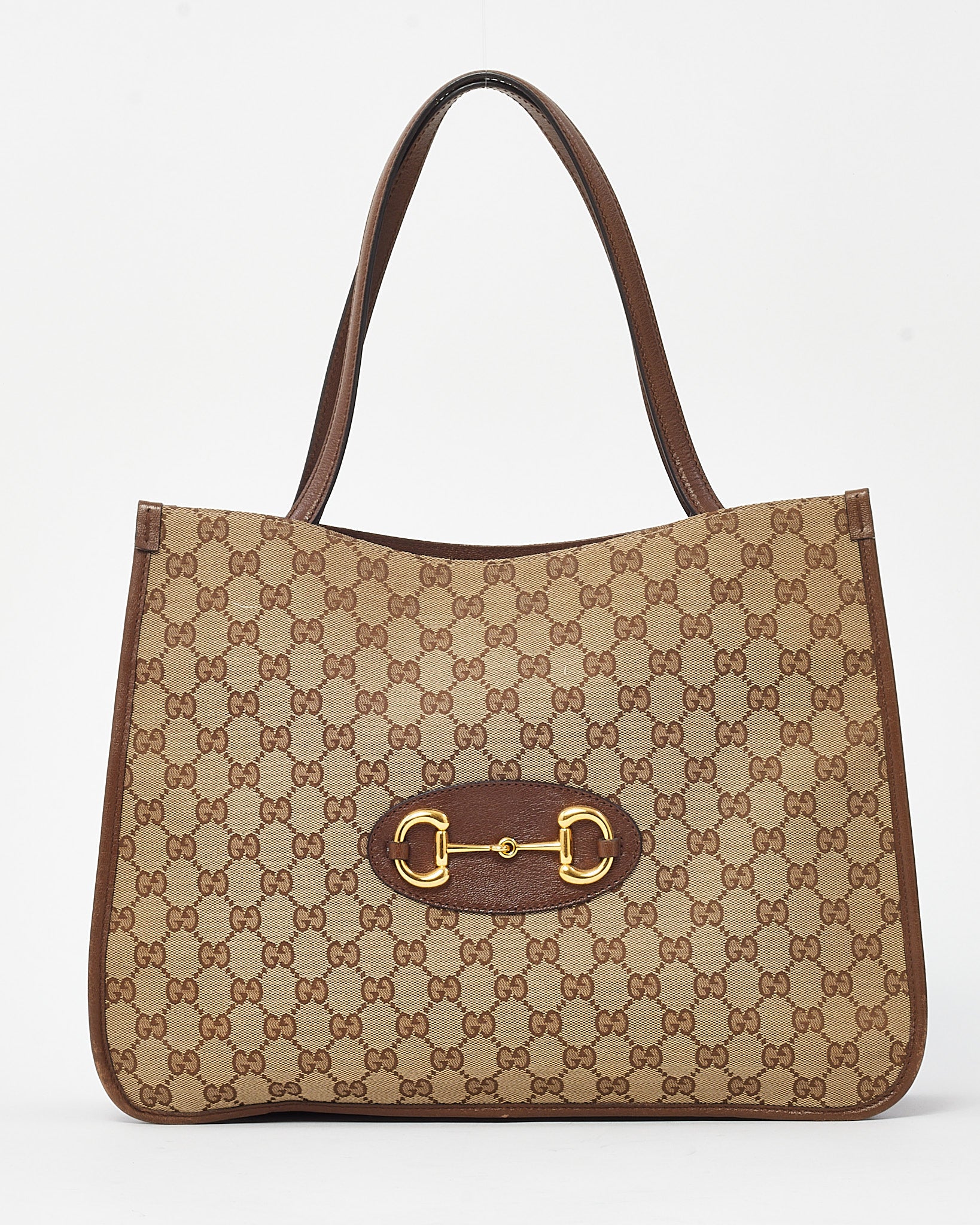 Step into timeless elegance with this pre-loved authentic Gucci Horsebit 1955 Tote Bag, crafted in classic beige and brown GG monogram canvas with refined brown leather trim. A tribute to Gucci’s equestrian heritage, this structured tote showcases the iconic gold-tone Horsebit detail front and center. The spacious interior and comfortable leather top handles make it a versatile choice for workdays or weekends. Finished with subtle vintage charm and modern functionality, this bag is the perfect blend of heritage design and everyday practicality.