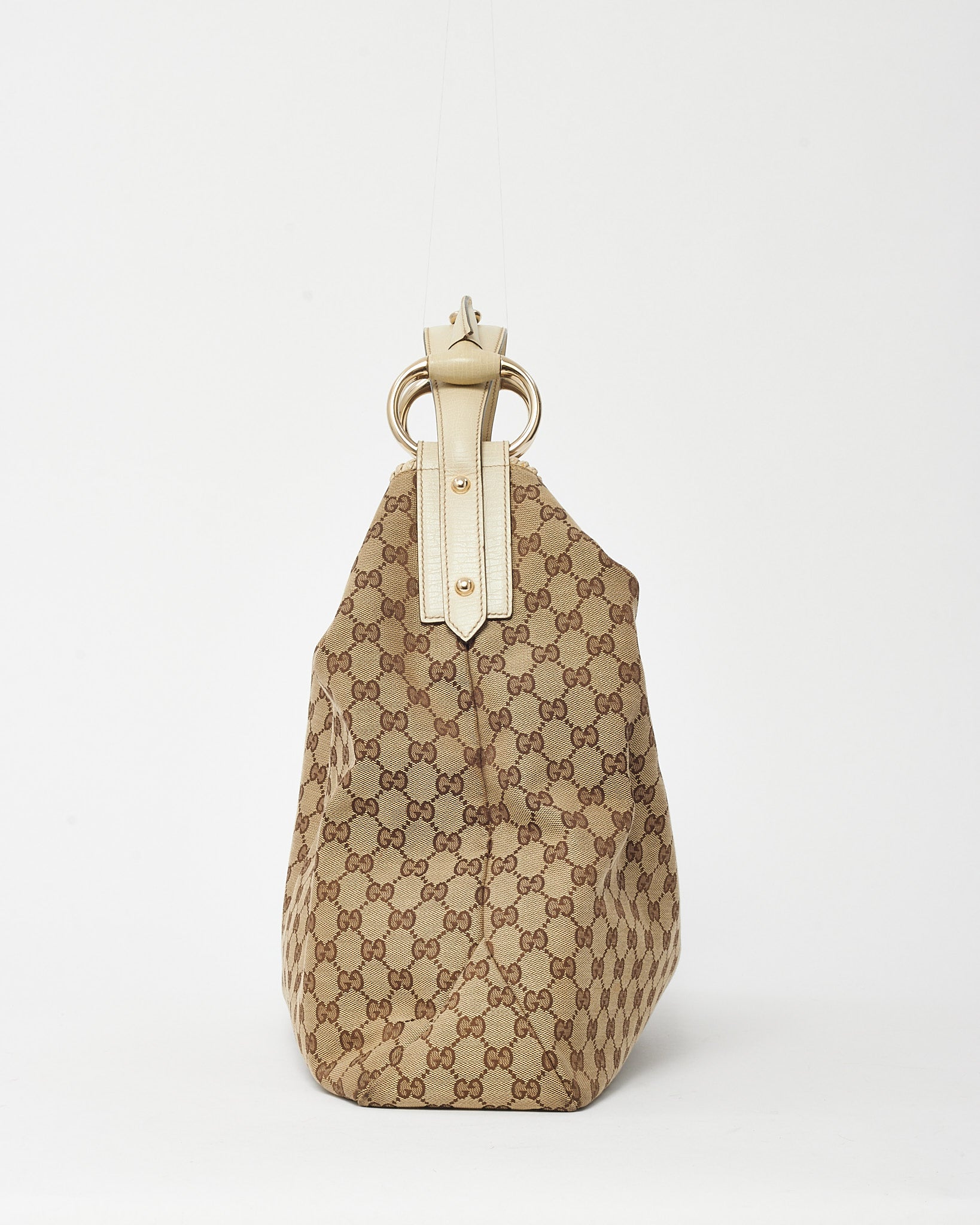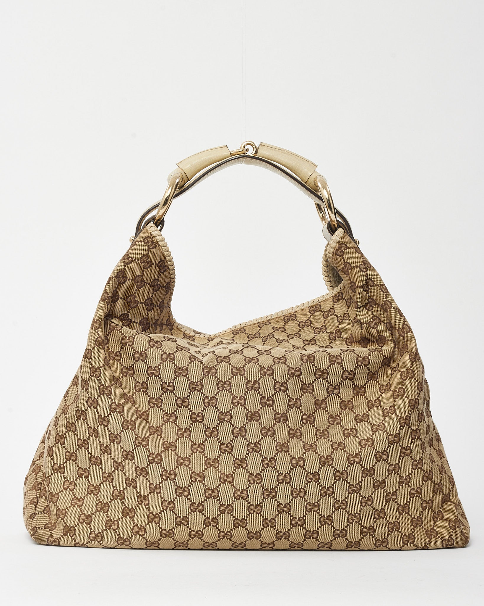 Beige and Brown GG Monogram Canvas White Leather Horsebit Hobo Shoulder Bag