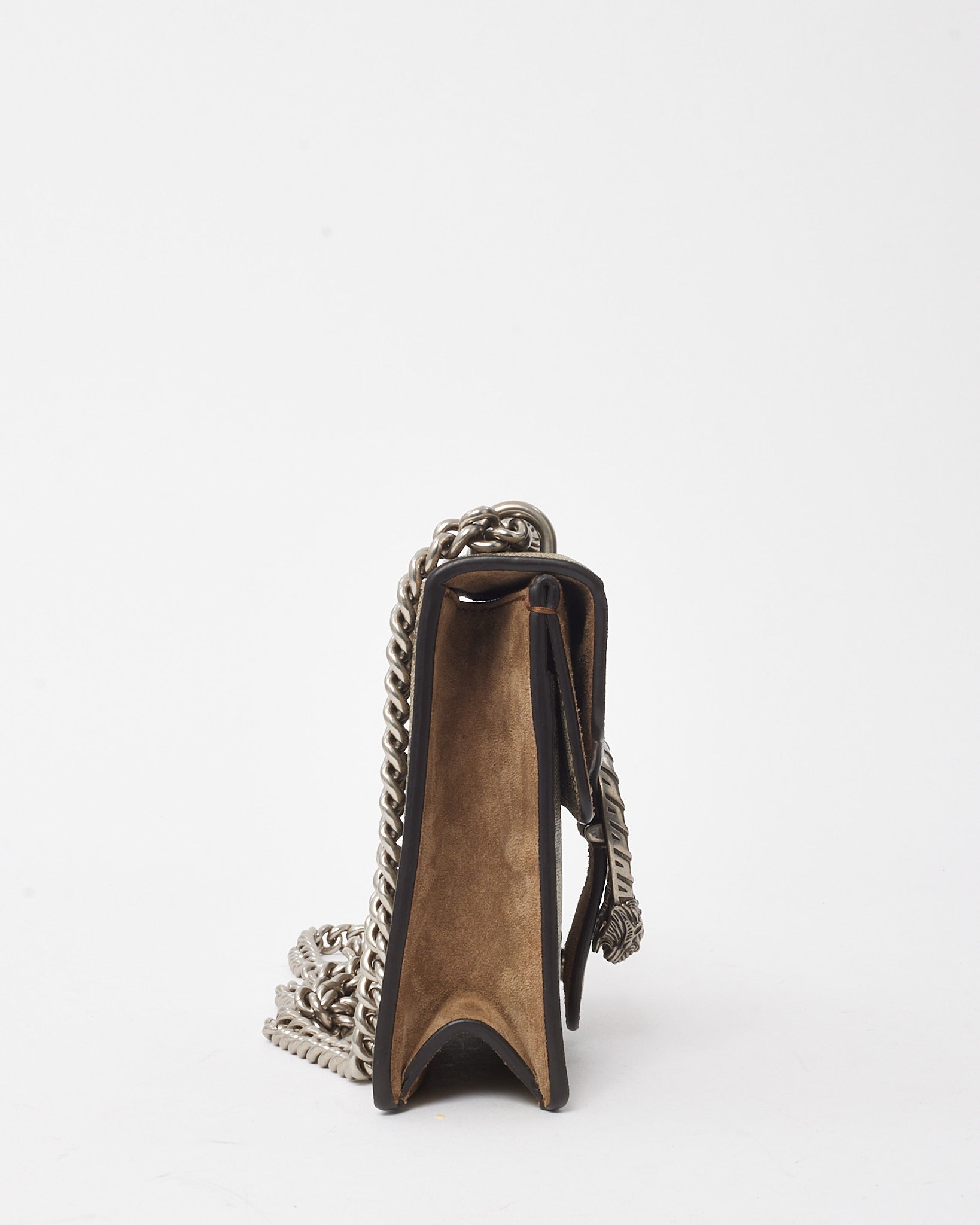 Elevate your everyday style with this pre-loved authentic Gucci Dionysus Mini Square Shoulder Bag, rendered in iconic beige and ebony GG Supreme canvas. This compact silhouette is trimmed with textured taupe suede and features the signature Dionysus tiger head spur closure — a striking symbol of Gucci’s mythological heritage. The sliding chain strap allows for versatile wear as a shoulder or crossbody bag. Perfectly sized to carry essentials, this structured piece delivers a timeless blend of elegance, craftsmanship, and contemporary edge.