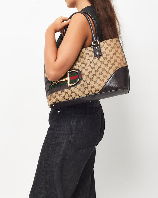 Beige/Brown GG Monogram Canvas Horsebit Web Tote Bag