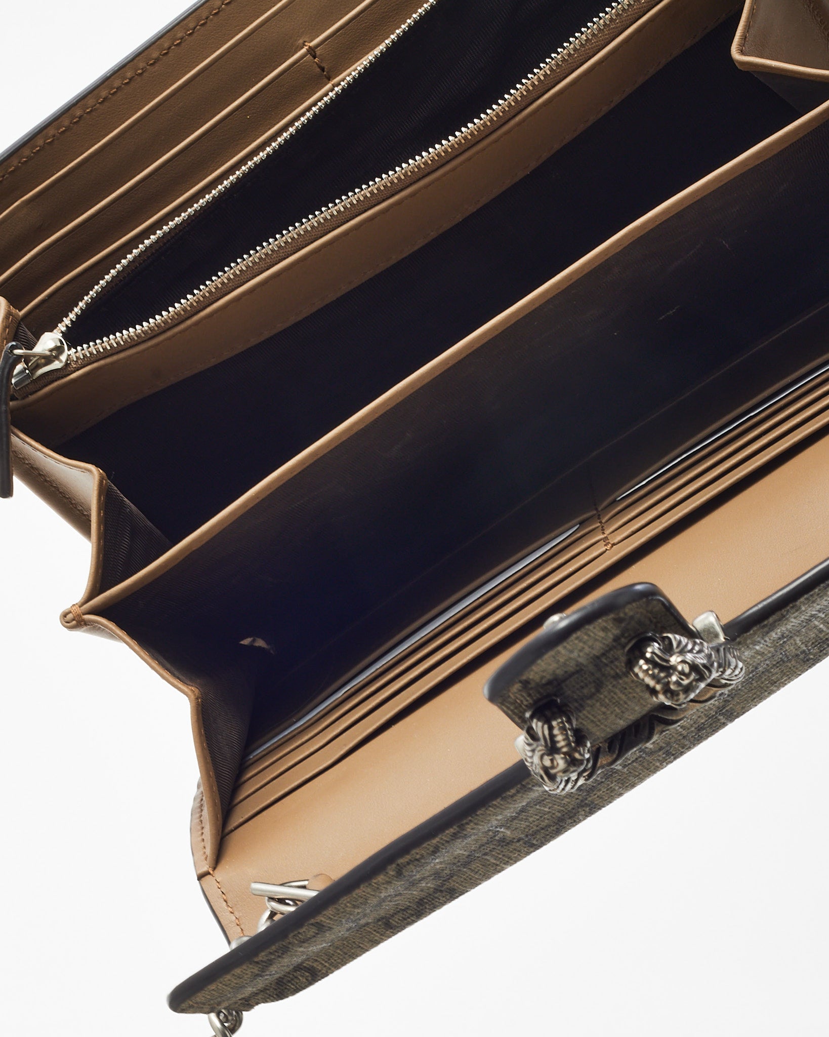 Compact yet iconic, this pre-loved authentic Gucci Dionysus Wallet on Chain crossbody bag is crafted from GG Supreme canvas in classic beige and ebony tones. Featuring the signature textured tiger head spur closure, this sleek silhouette opens to a well-organized interior with card slots and space for essentials. The chain shoulder strap adds a touch of elegance while allowing hands-free versatility. Perfect for day-to-evening styling, this Gucci piece brings together timeless design with modern utility in a truly elevated accessory.