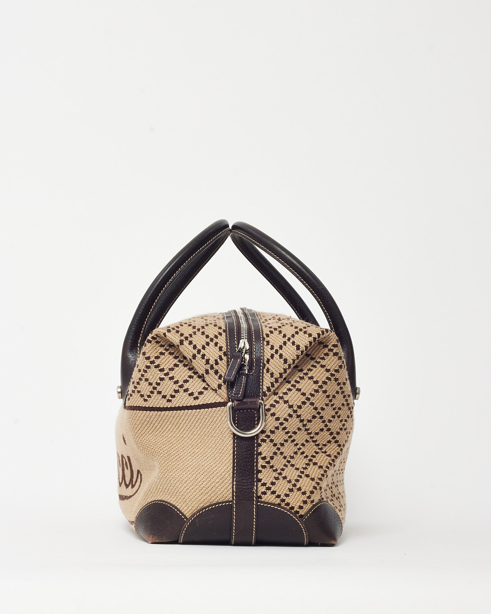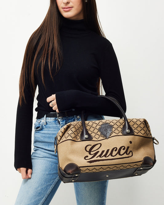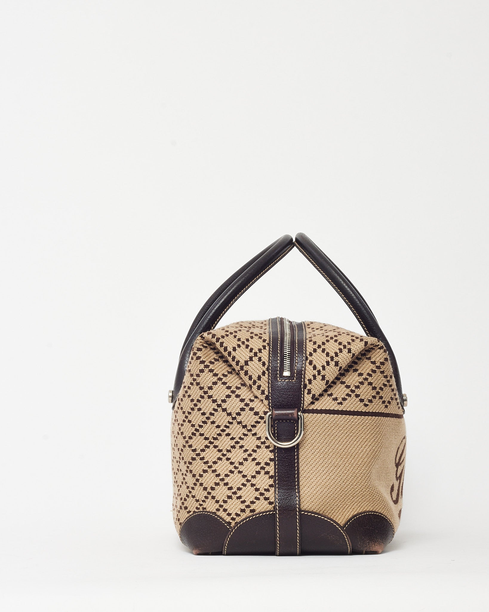 Add a bold and vintage-inspired touch to your wardrobe with this pre-loved authentic Gucci Beige Jacquard Diamante Canvas Logo Hysteria Large Boston Bag. Showcasing Gucci’s iconic diamante canvas with a rich brown leather trim, this roomy bag features the signature oversized Gucci script and crest medallion for unmistakable house branding. The structured silhouette, rolled handles, and protective corner hardware make it both stylish and travel-ready. Perfect for weekends away or elevated daily wear, this bag combines heritage craftsmanship with timeless Italian flair.