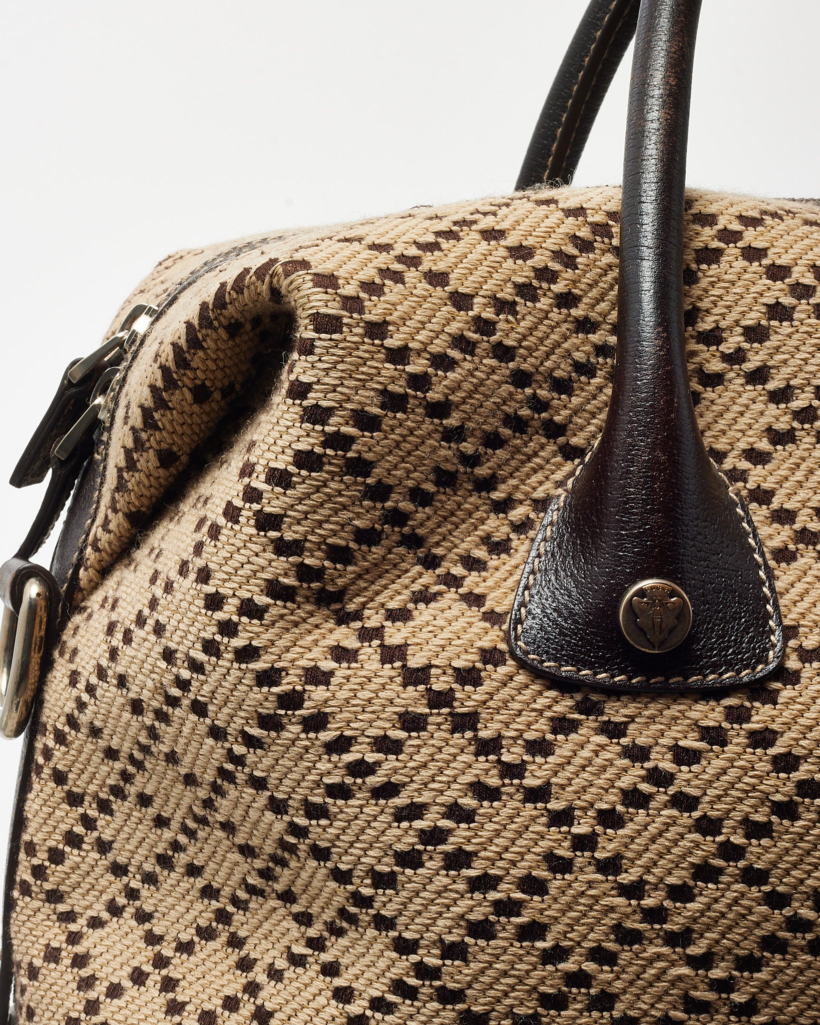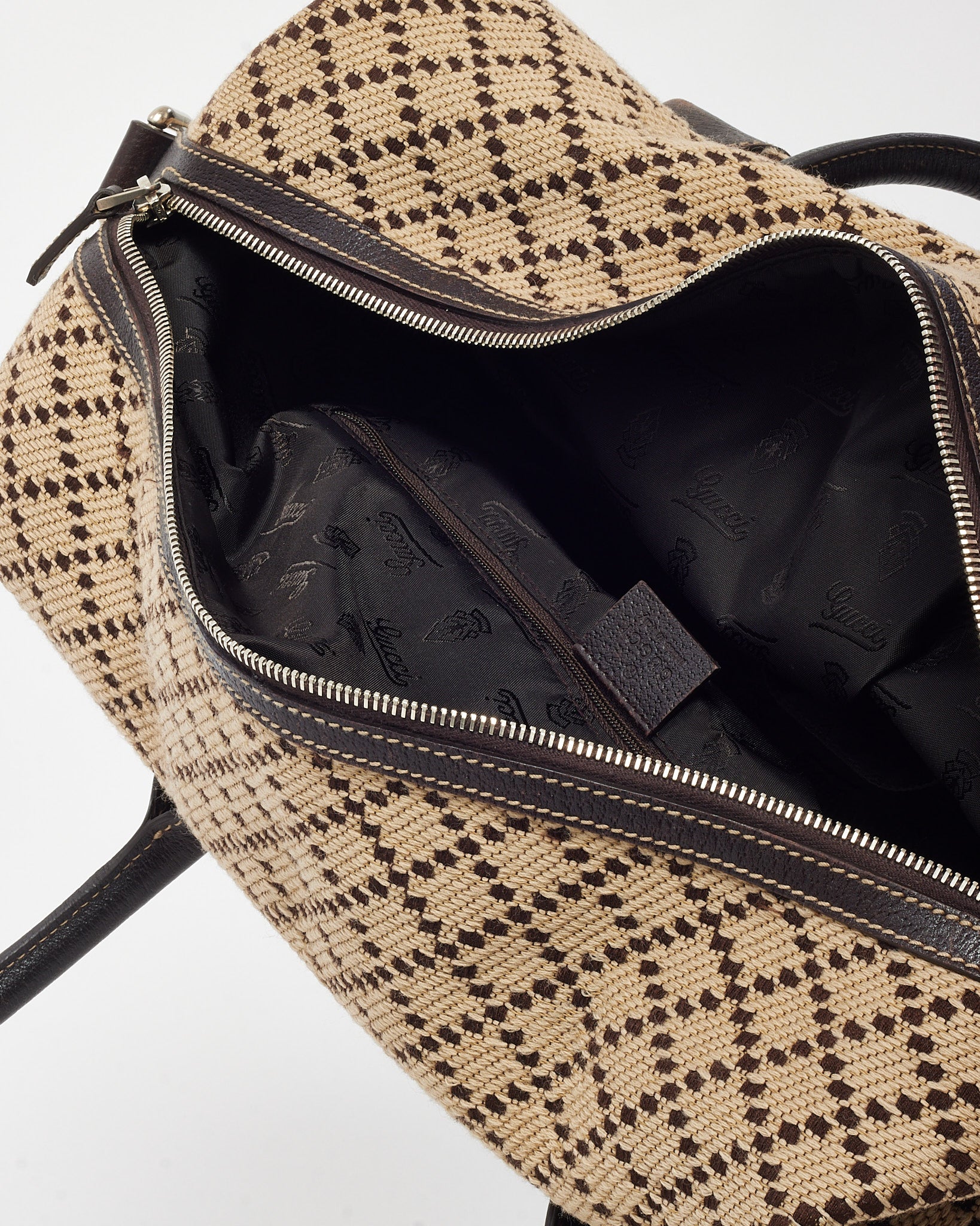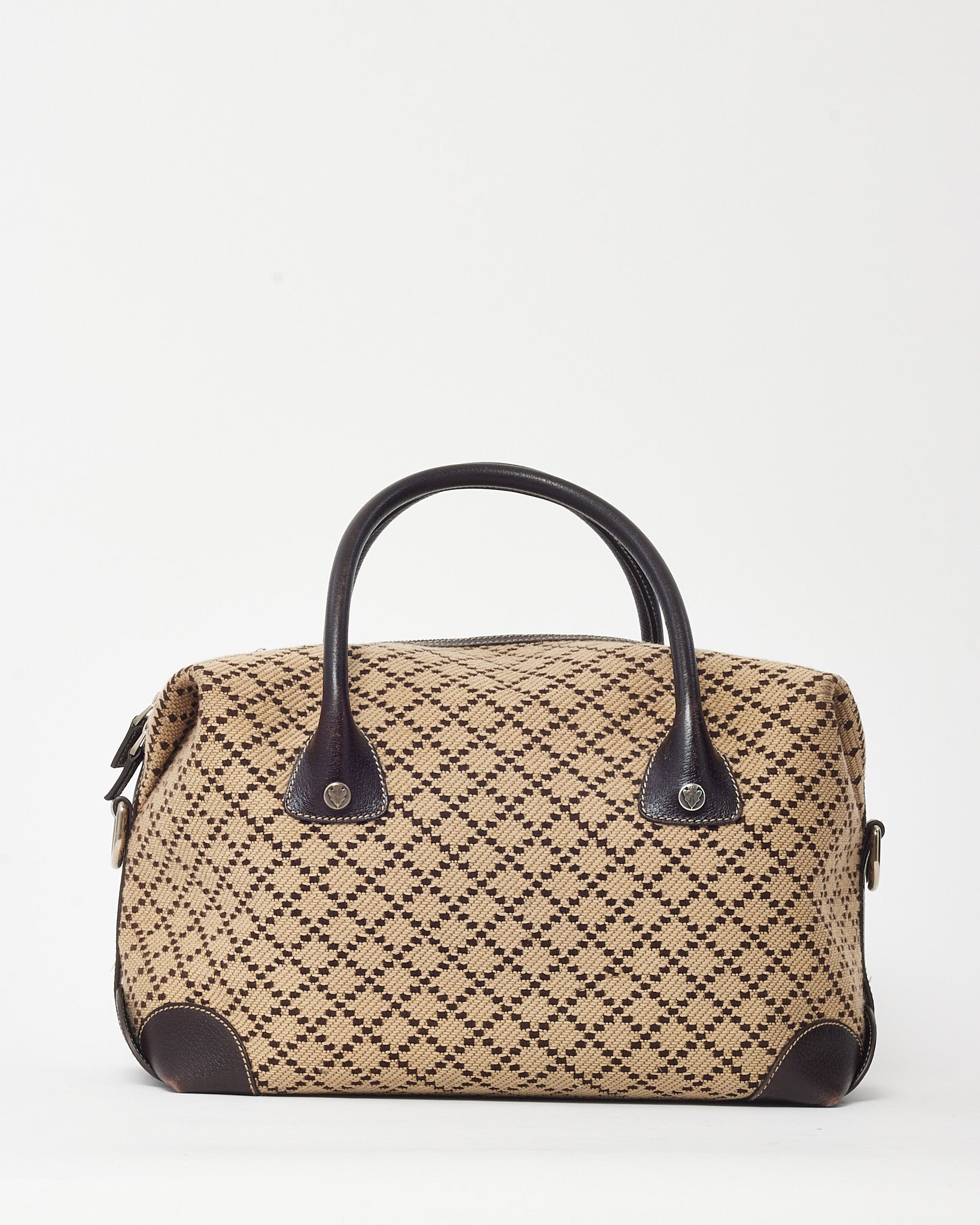 Add a bold and vintage-inspired touch to your wardrobe with this pre-loved authentic Gucci Beige Jacquard Diamante Canvas Logo Hysteria Large Boston Bag. Showcasing Gucci’s iconic diamante canvas with a rich brown leather trim, this roomy bag features the signature oversized Gucci script and crest medallion for unmistakable house branding. The structured silhouette, rolled handles, and protective corner hardware make it both stylish and travel-ready. Perfect for weekends away or elevated daily wear, this bag combines heritage craftsmanship with timeless Italian flair.
