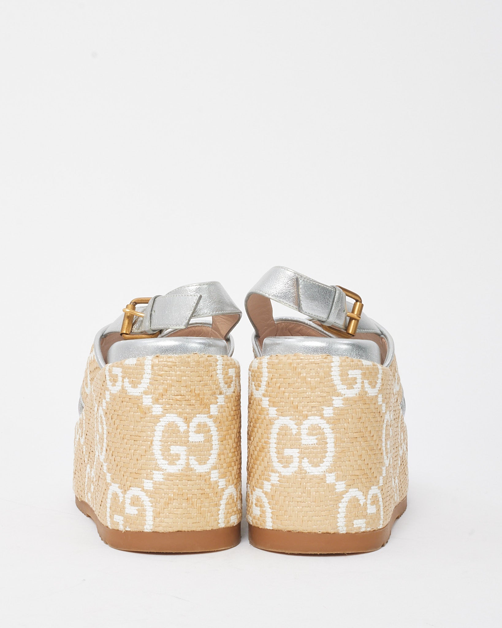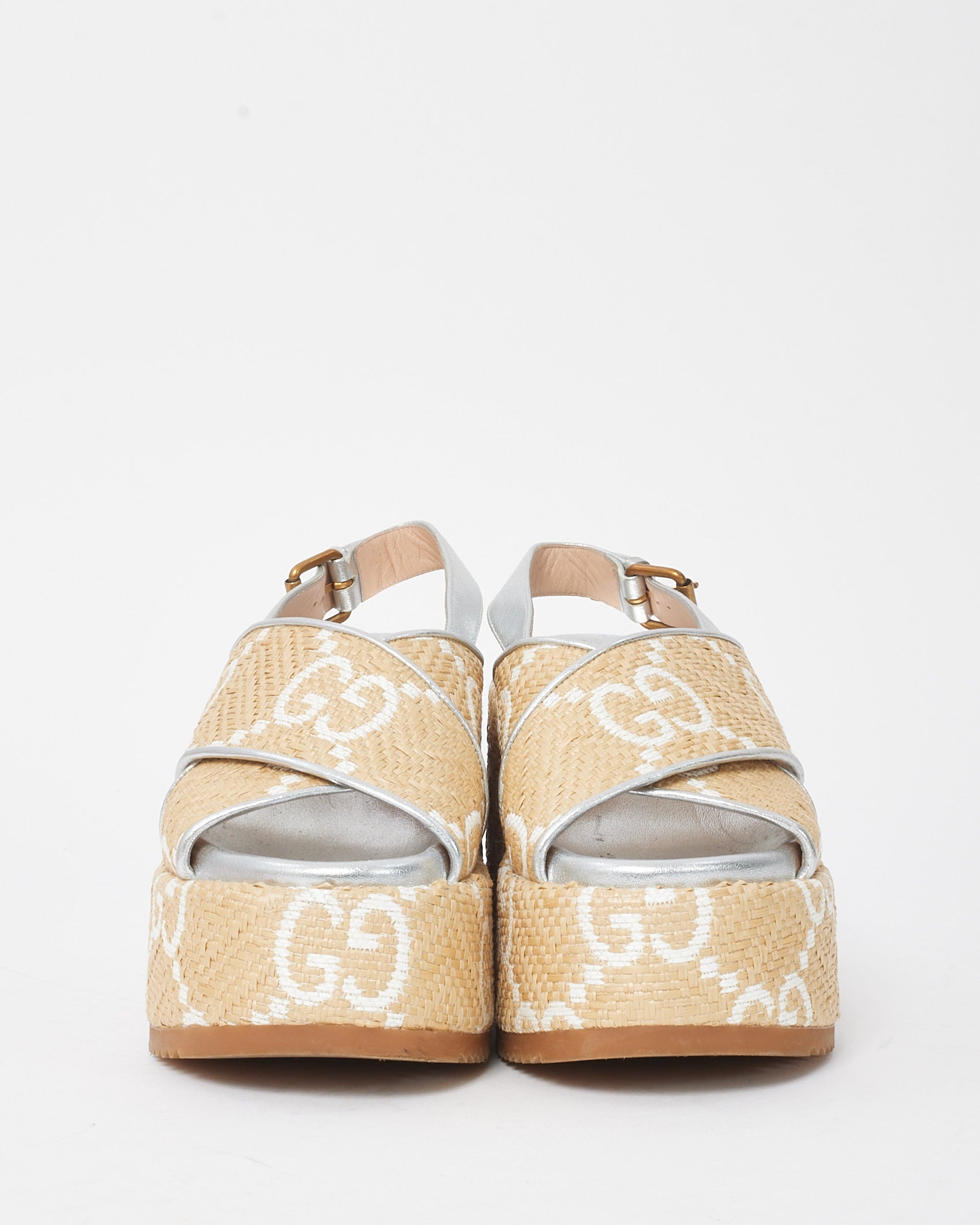 Beige Jumbo GG Logo Raffia and Leather Slingback Platform Sandals - 35.5