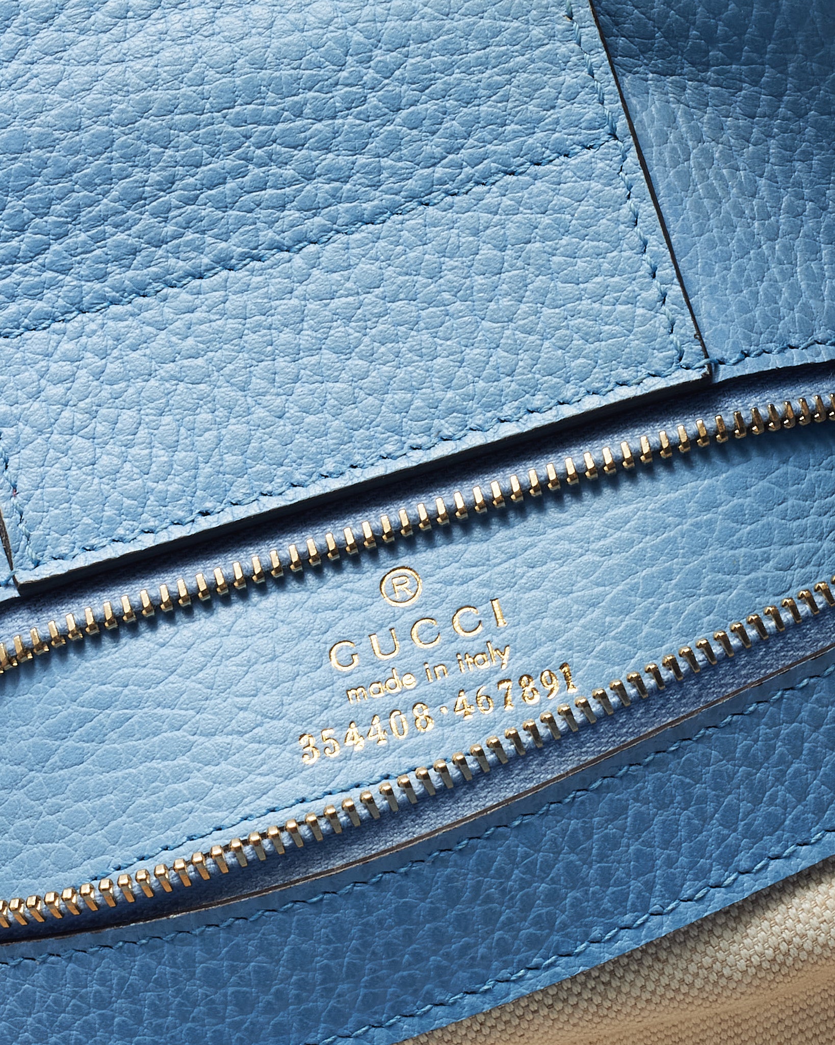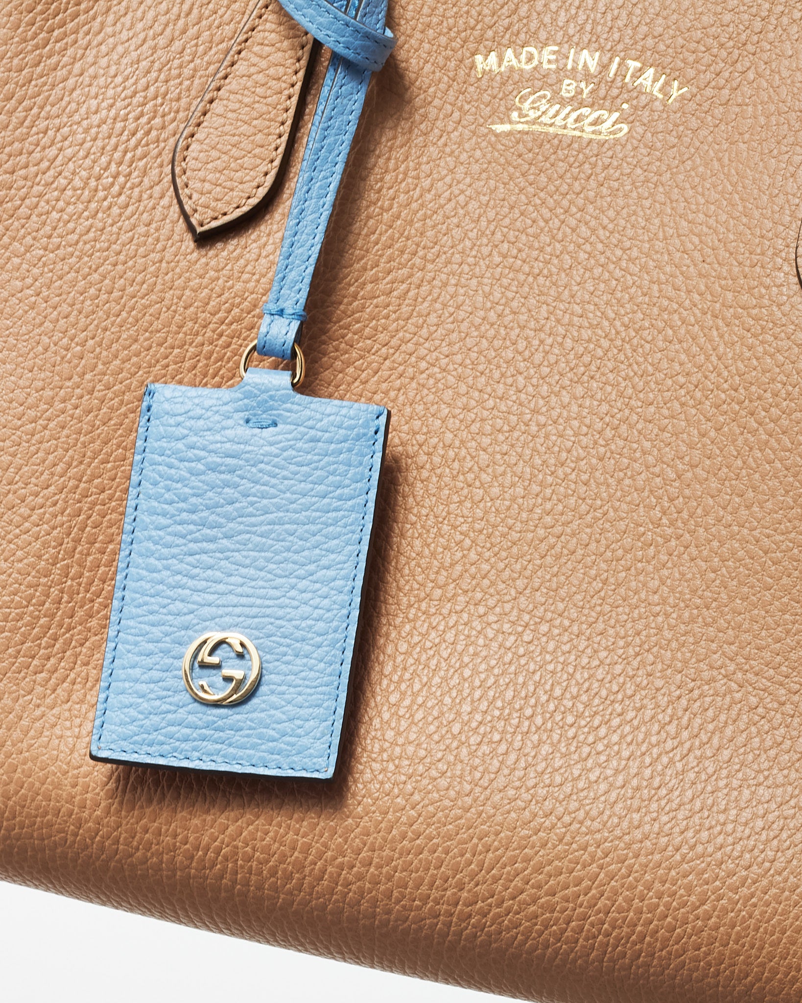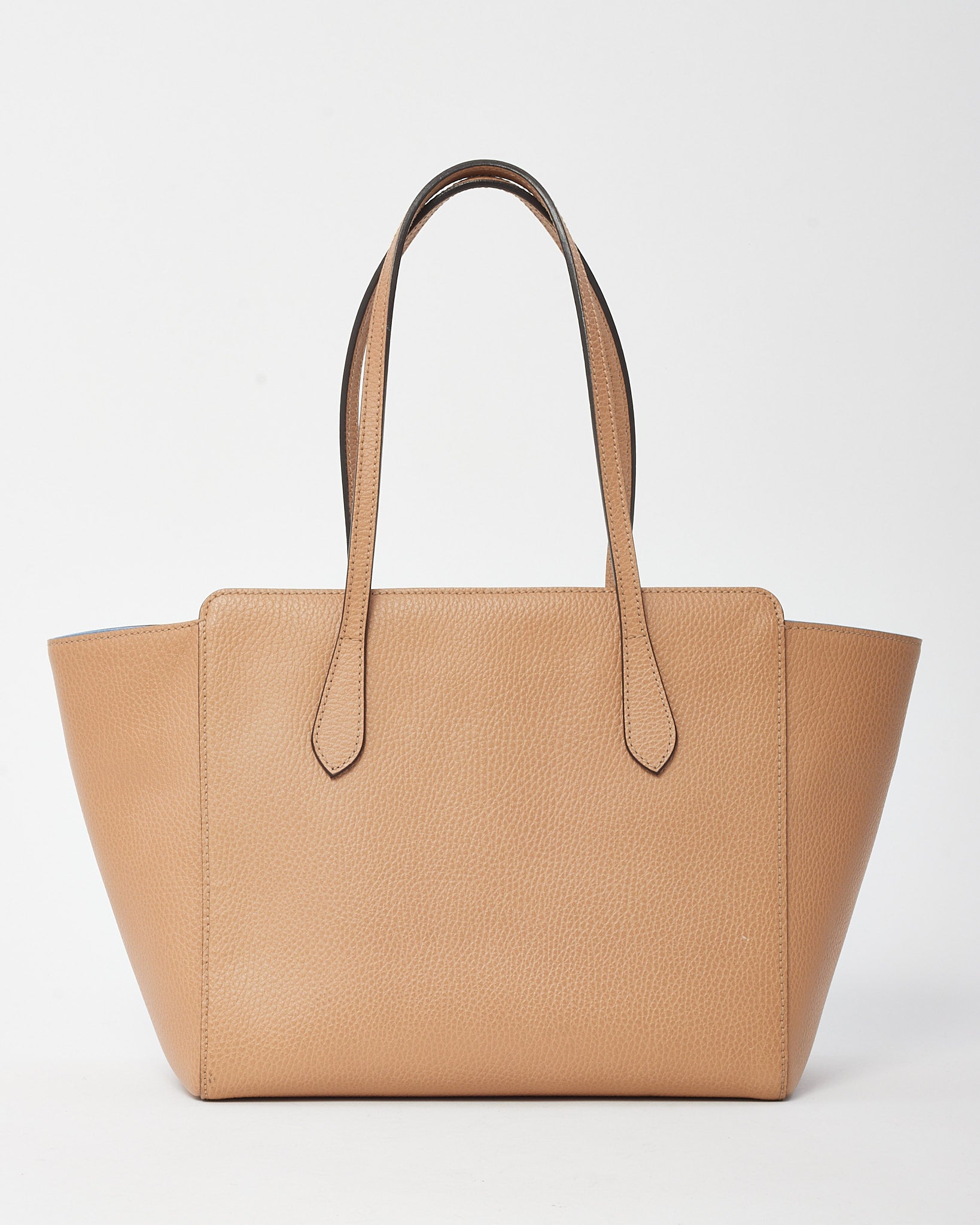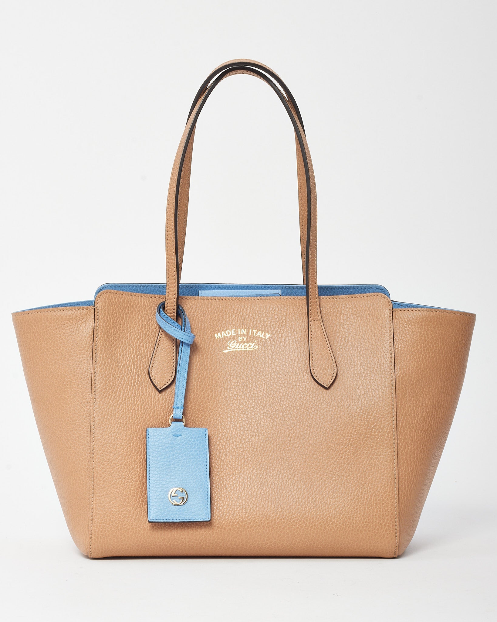 Add effortless sophistication to your everyday style with this pre-loved authentic Gucci Medium Swing Tote. Crafted from durable beige pebbled leather and accented with striking blue leather trim, this roomy tote offers a refined pop of color and classic structure. The open top design with side snap closures and a spacious interior make it ideal for work or daily errands, while the subtle gold Gucci logo stamp adds a touch of understated elegance. A versatile carryall that blends function and timeless Italian design.