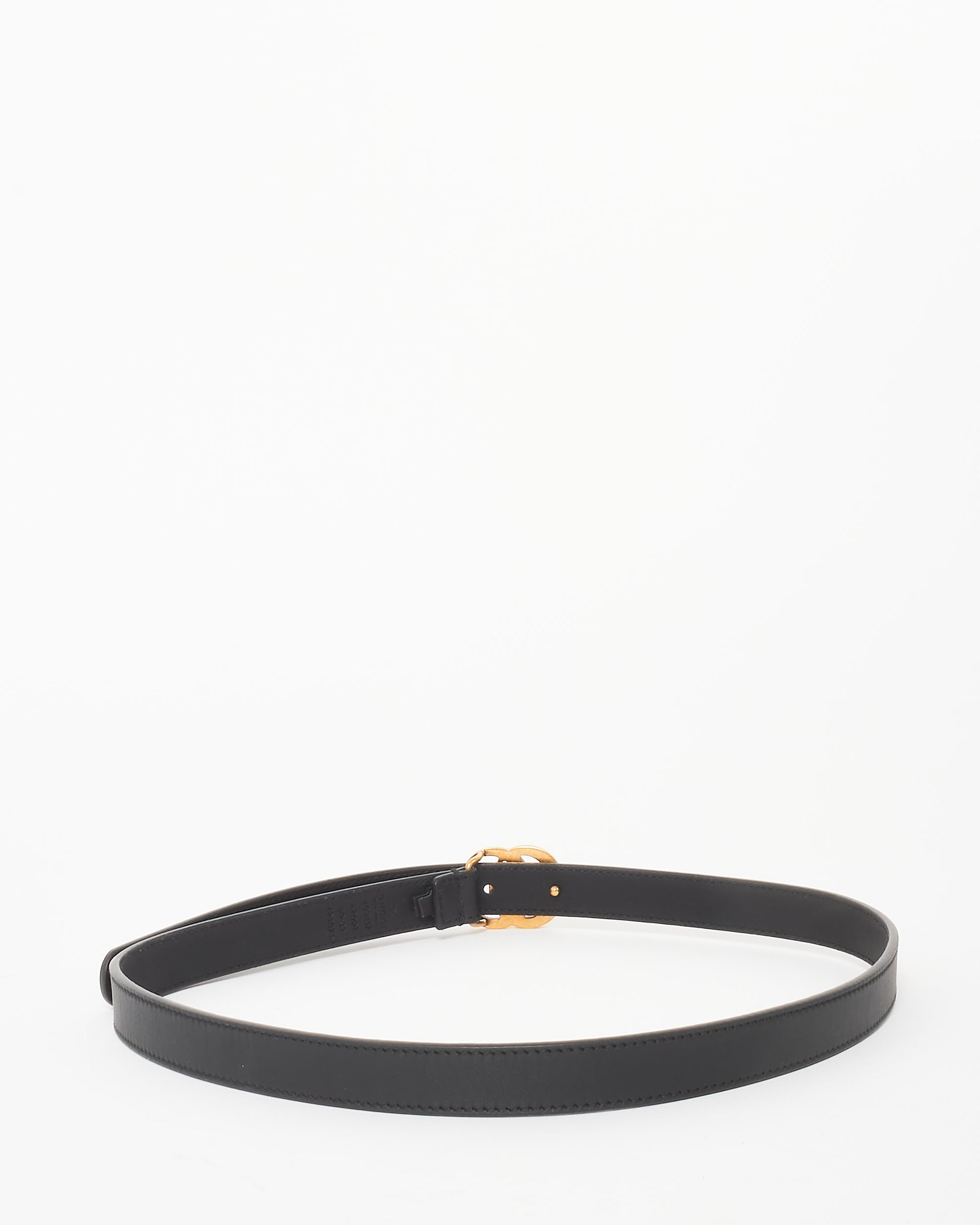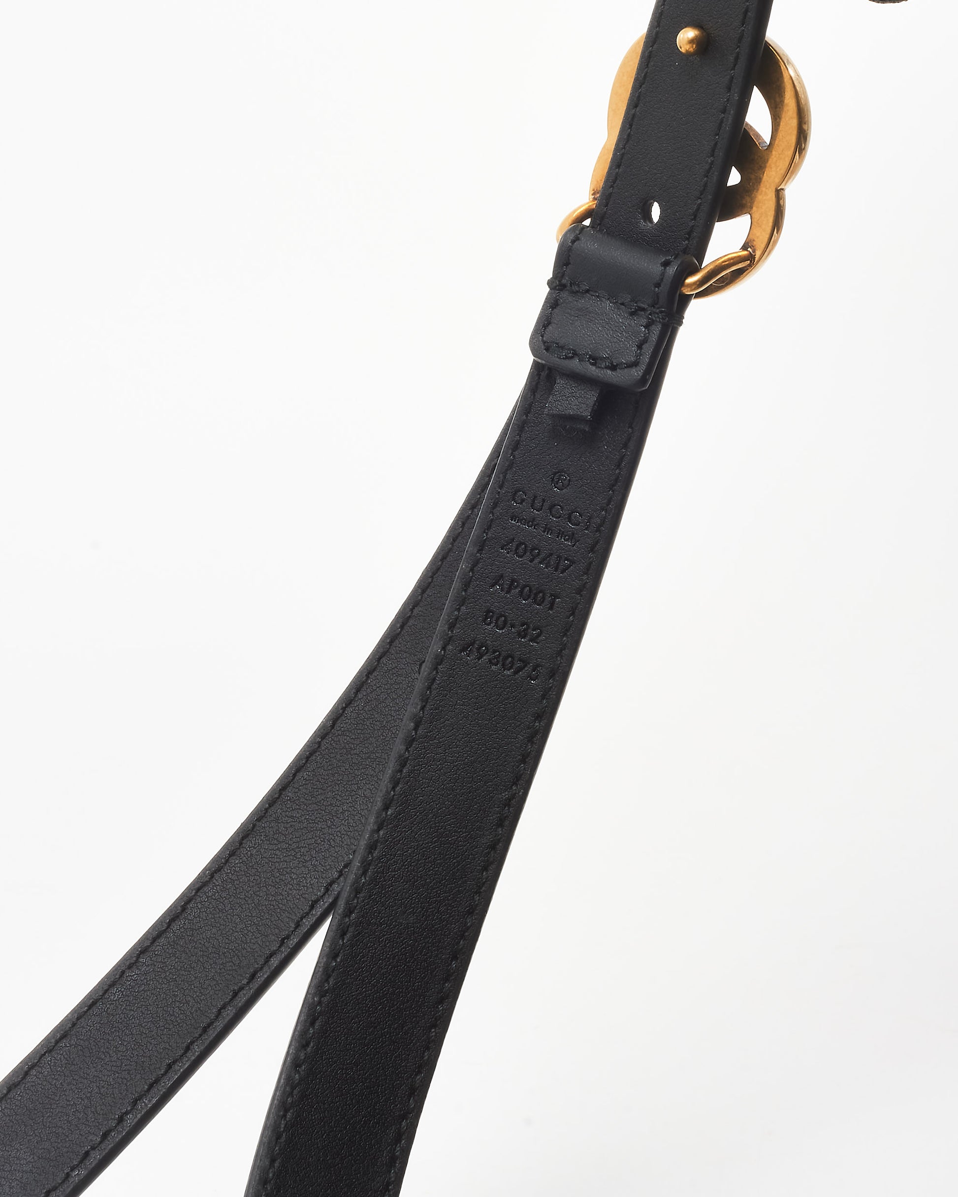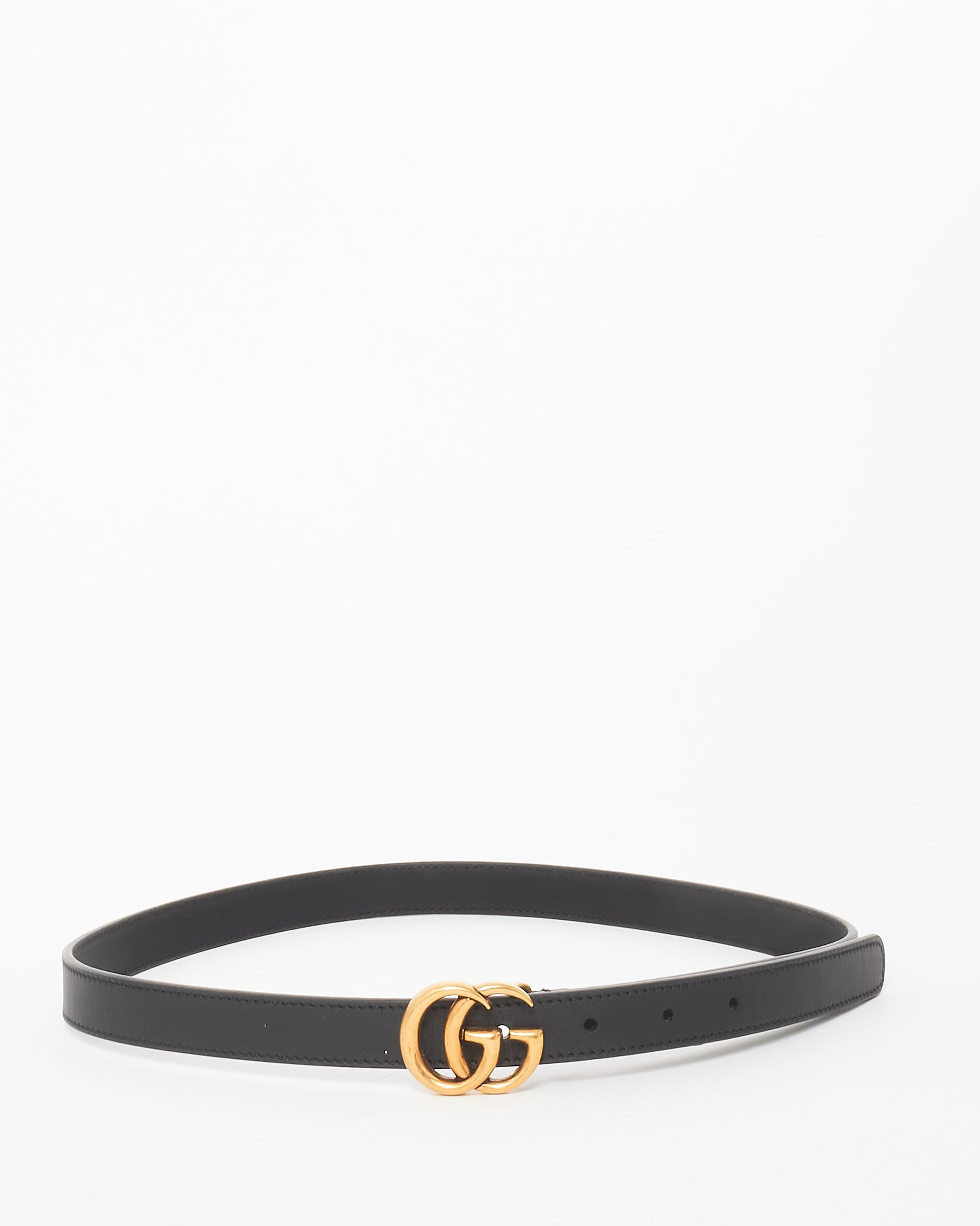 Refined and versatile, the authentic pre-owned Gucci Black Leather GG Marmont Slim Belt is a timeless accessory that effortlessly elevates any ensemble. Crafted from smooth black leather, this slim belt is adorned with the iconic GG Marmont buckle in polished gold-tone hardware, symbolizing Gucci’s legacy of luxury and sophistication.