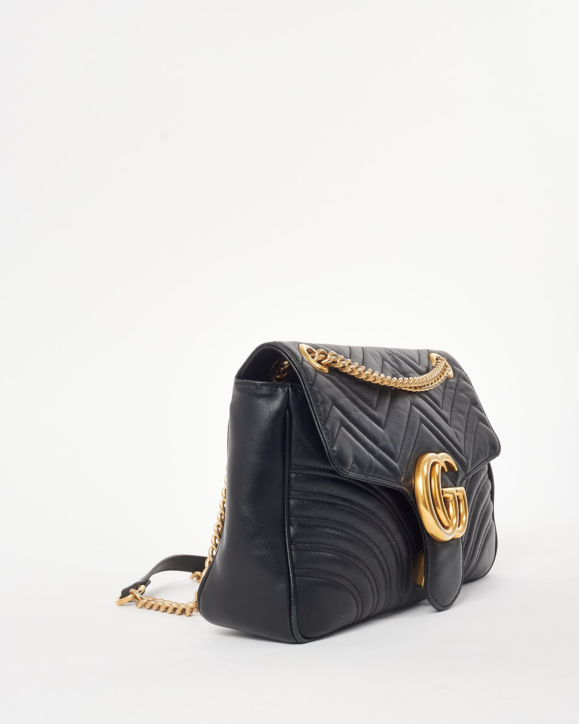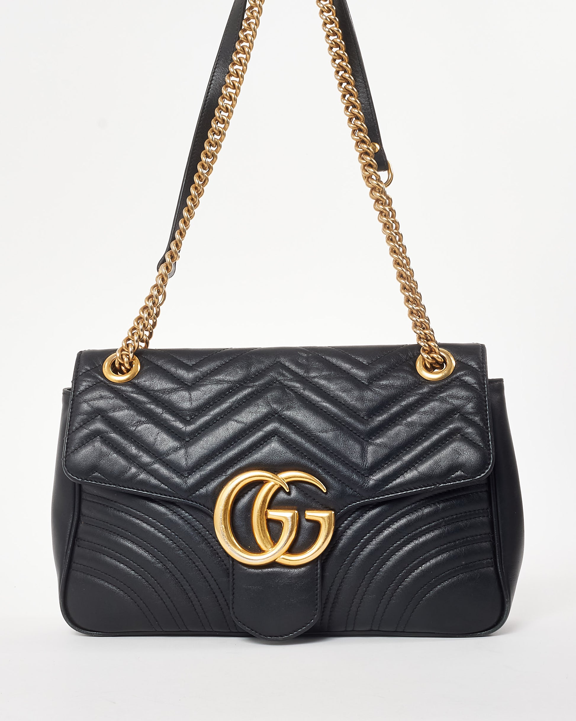 Shop this authentic pre-owned Gucci Black Matelassé Leather Medium Marmont Flap Shoulder Bag is a signature statement piece that embodies timeless luxury and modern design. Crafted from soft black matelassé chevron-quilted leather, this medium-sized shoulder bag features a structured yet elegant silhouette, offering versatility for both day and evening wear. The iconic double G logo in antique gold-tone hardware adorns the front flap. The sliding chain strap, with a leather shoulder pad, allows for flexible styling—wear it as a shoulder bag, crossbody, or tuck the strap for a chic clutch look. The secure flap closure opens to reveal a microfiber-lined interior with a suede-like finish and multiple compartments, perfect for organizing essentials like your phone, wallet, and keys. Shop pre-owned authentic Gucci bags at Retyche.