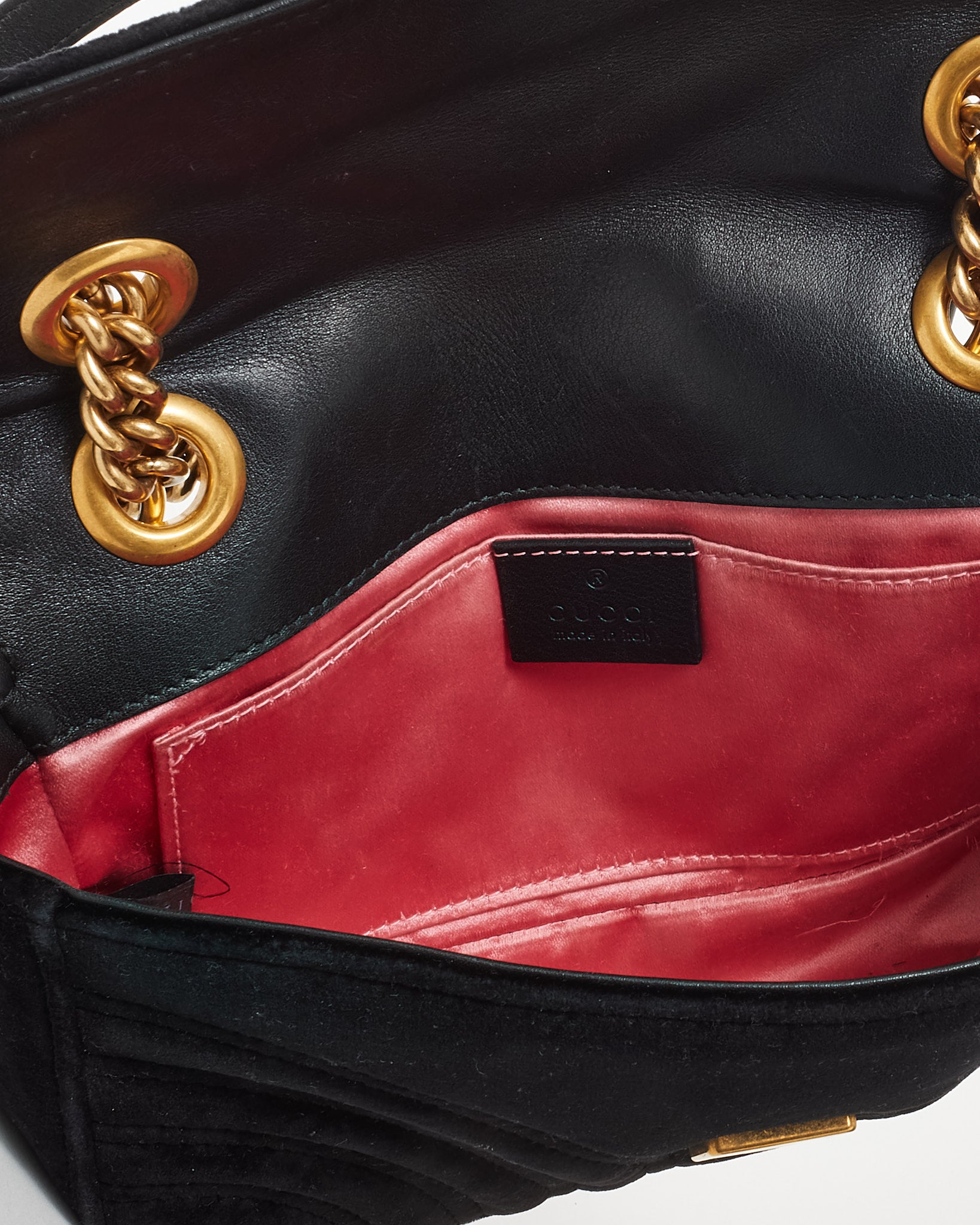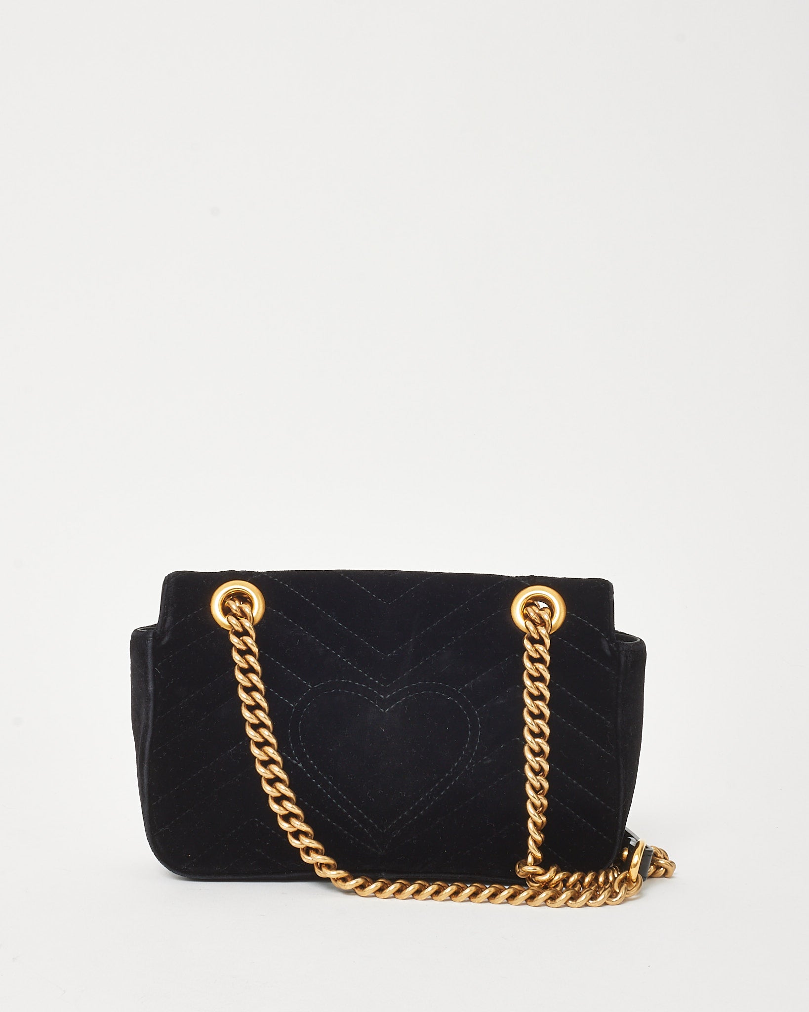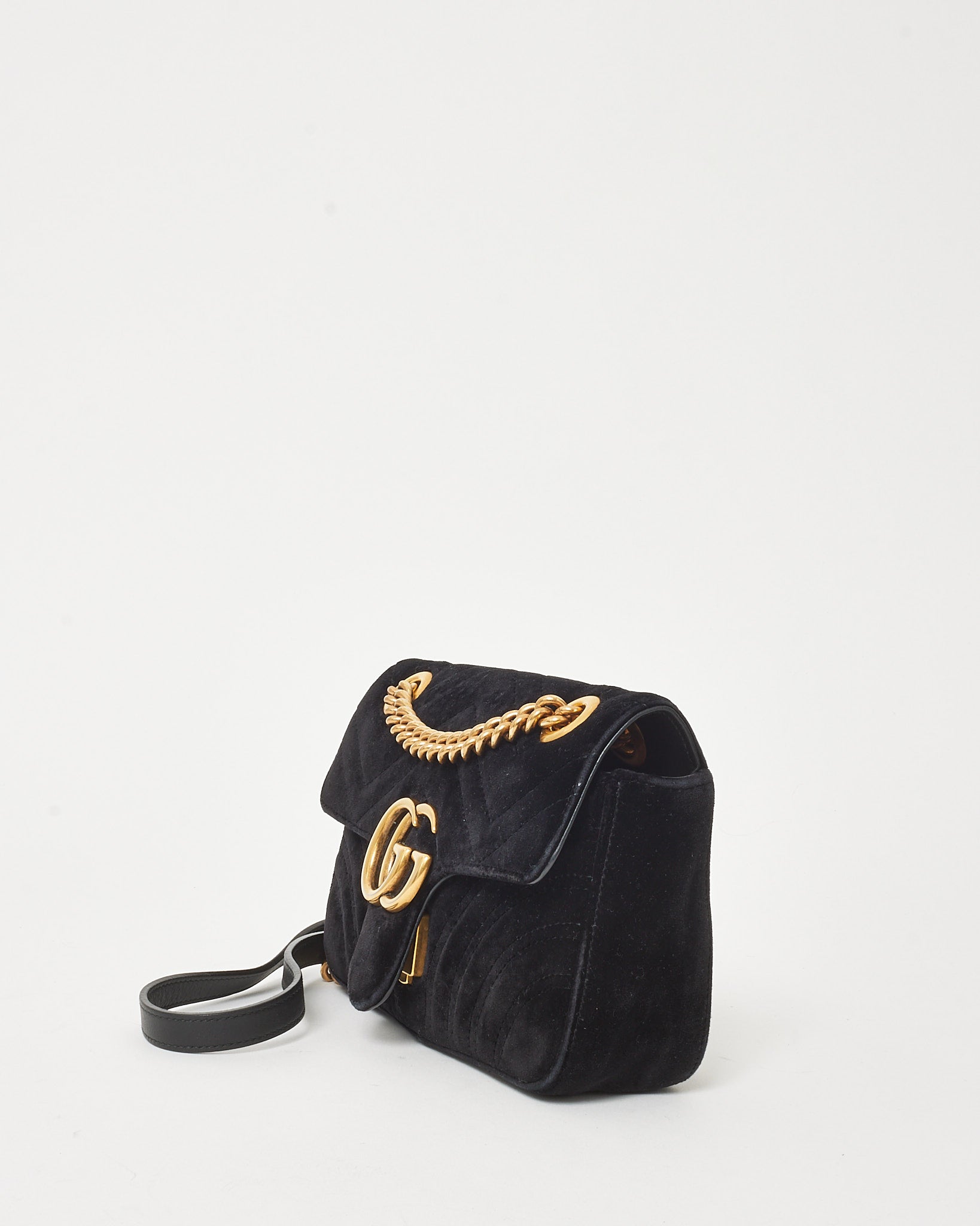 A refined classic with contemporary edge, this pre-loved authentic Gucci Small GG Marmont Shoulder Bag is rendered in plush black matelassé velvet with chevron stitching and the signature GG logo in antique gold-tone hardware. The softly structured silhouette features a front flap with push-lock closure, sliding chain strap for crossbody or shoulder wear, and a microfiber-lined interior with a convenient pocket. Iconic yet versatile, this compact luxury piece effortlessly transitions from day to evening.