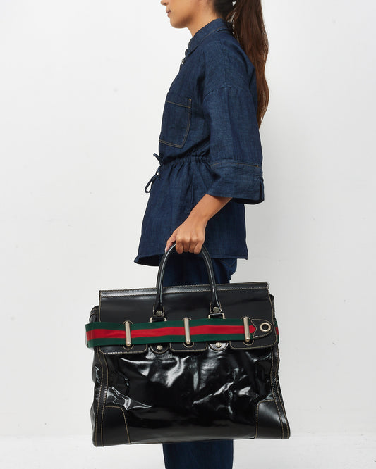 Structured and striking, this pre-owned authentic Gucci Doctor Tote is crafted from glossy black patent leather and detailed with the house’s iconic green and red web stripe. The spacious, vintage-inspired silhouette features top handles, gold-tone hardware, and a secure zip closure, with a roomy interior designed for effortless organization.
