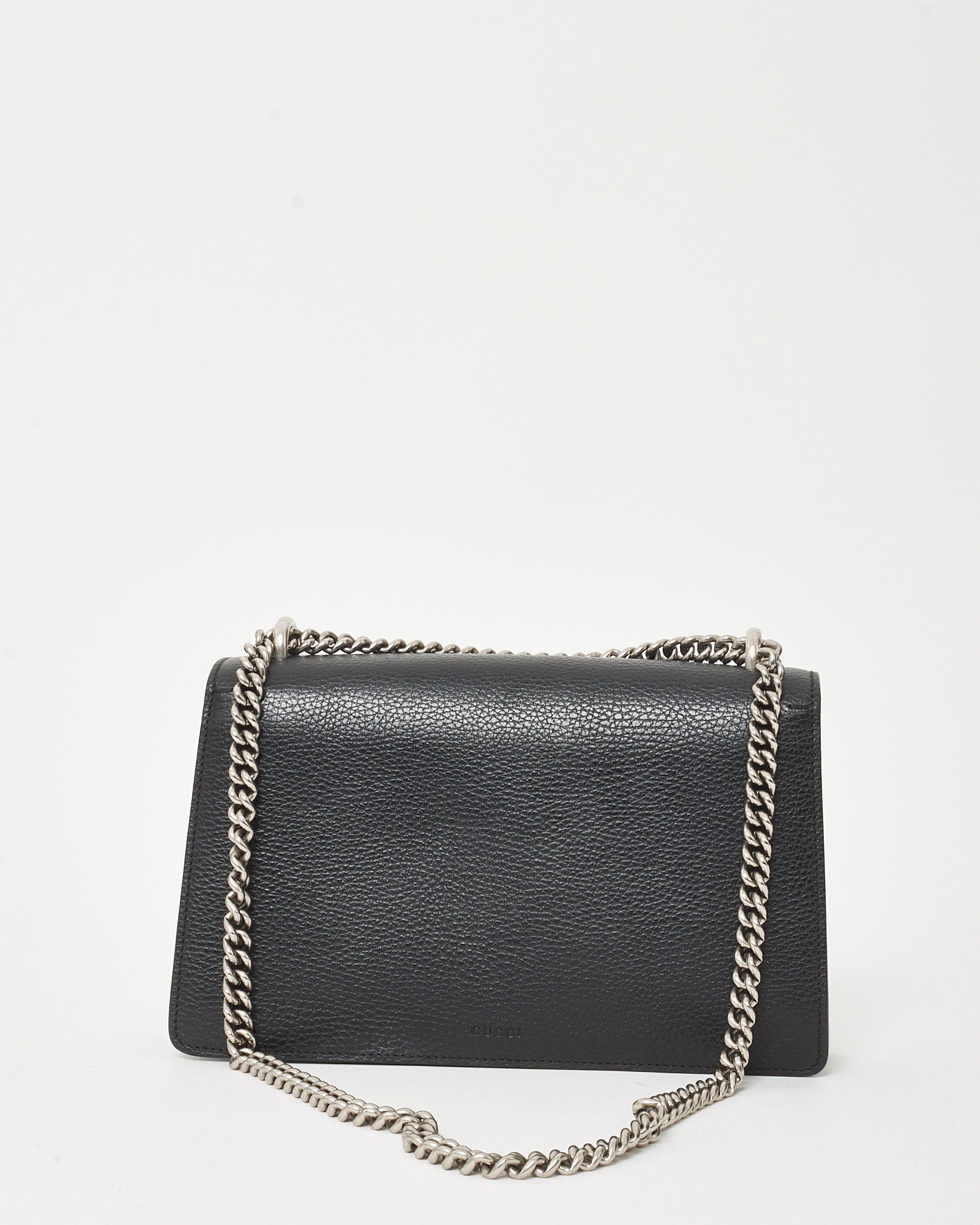 A symbol of bold elegance, this pre-loved authentic Gucci Small Dionysus Shoulder Bag is crafted in luxurious black pebbled calfskin leather. Featuring the iconic textured tiger head spur closure, this structured silhouette opens to a suede-lined interior with smart compartments for everyday essentials. The antique silver-tone chain strap offers versatility for shoulder or crossbody wear. Sophisticated yet edgy, this compact bag captures the essence of modern Gucci glamour.