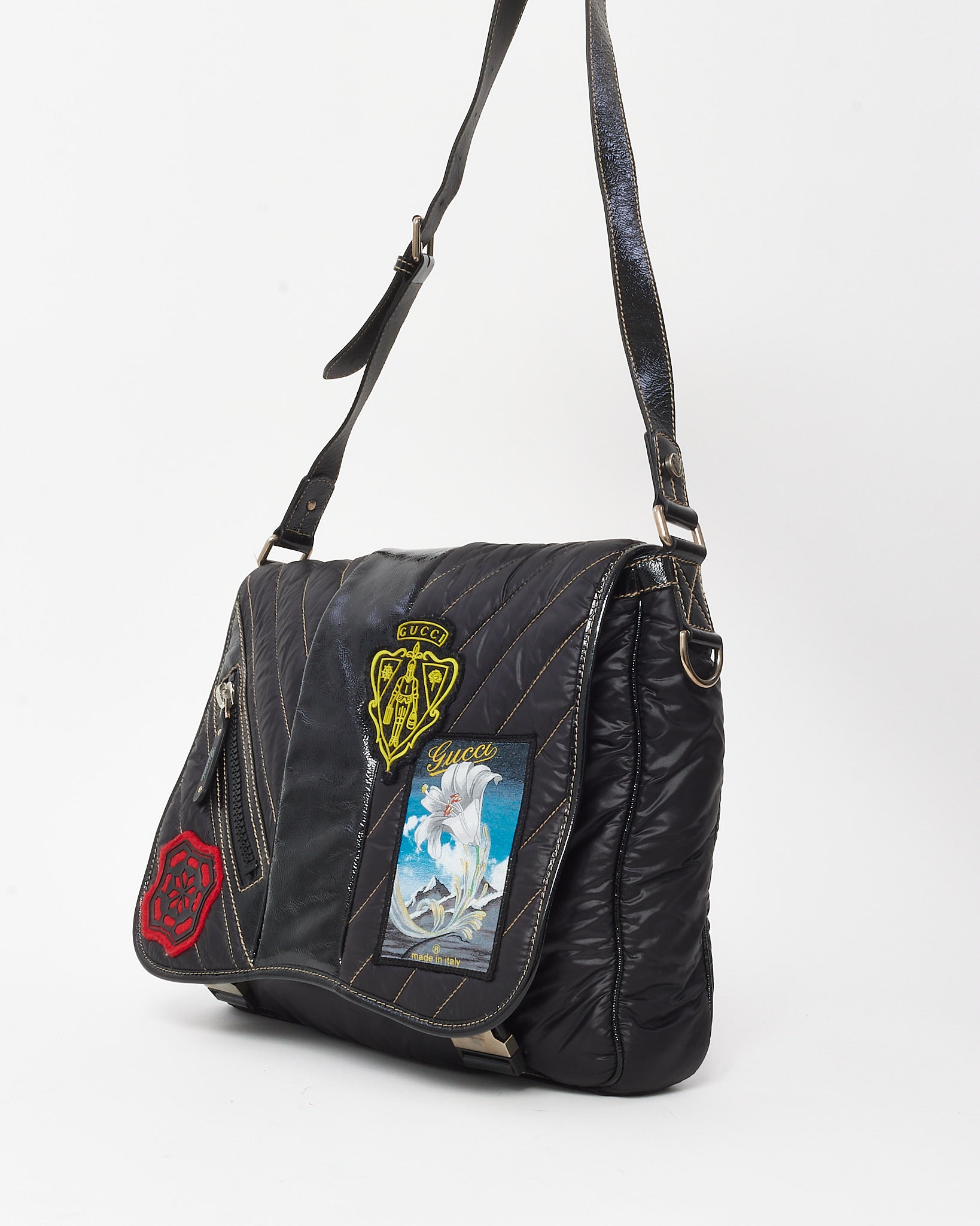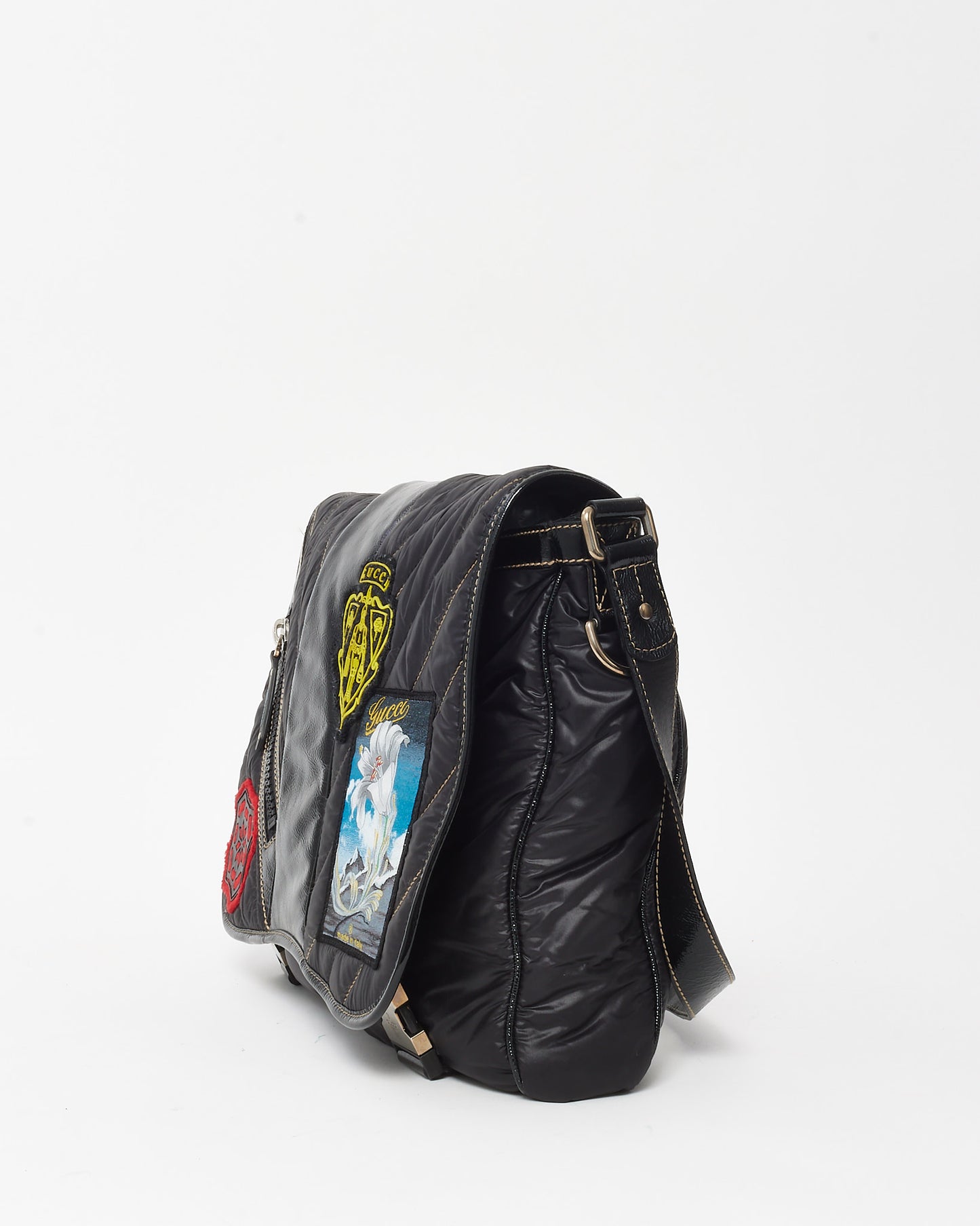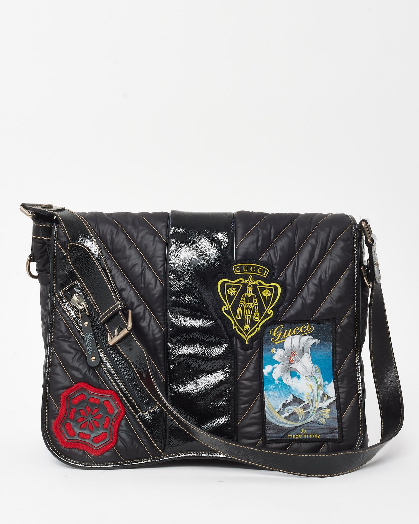 Edgy and elevated, this pre-loved authentic Gucci Black Quilted Coated Logo Patches Messenger Bag brings a modern twist to a classic silhouette. Crafted from quilted coated canvas with a subtle sheen, it’s adorned with bold logo patches that showcase Gucci’s playful, street-style aesthetic.