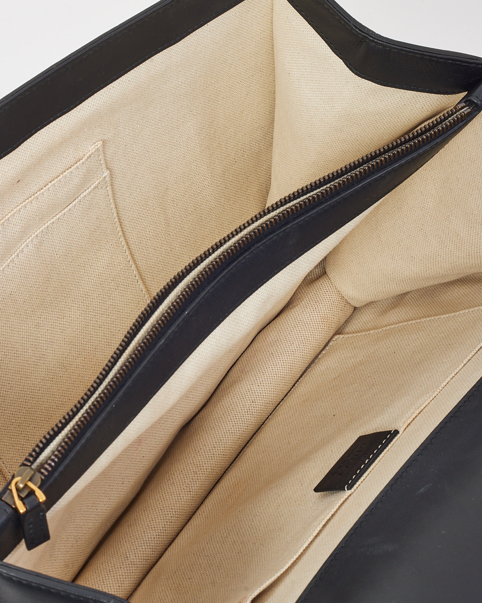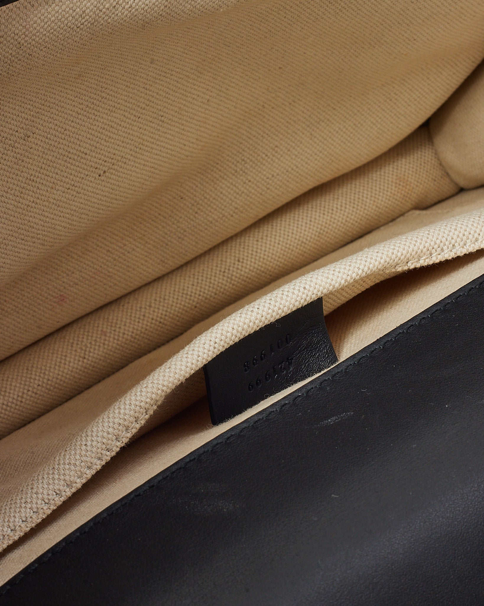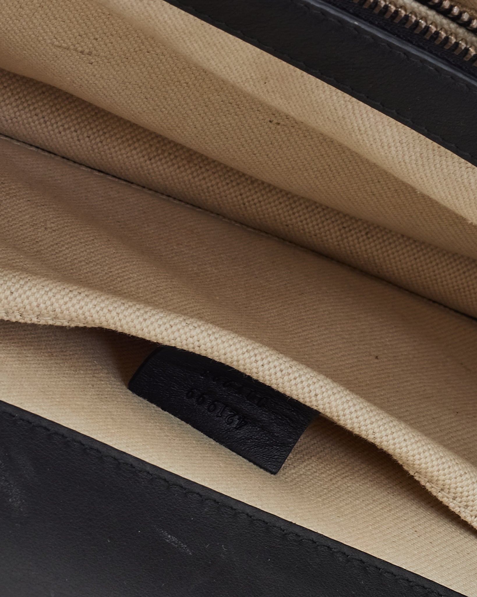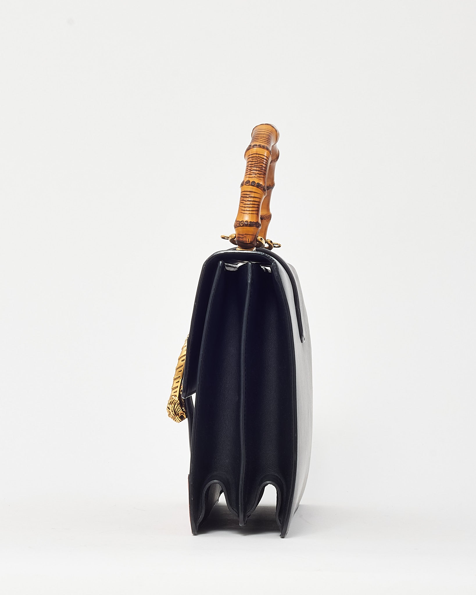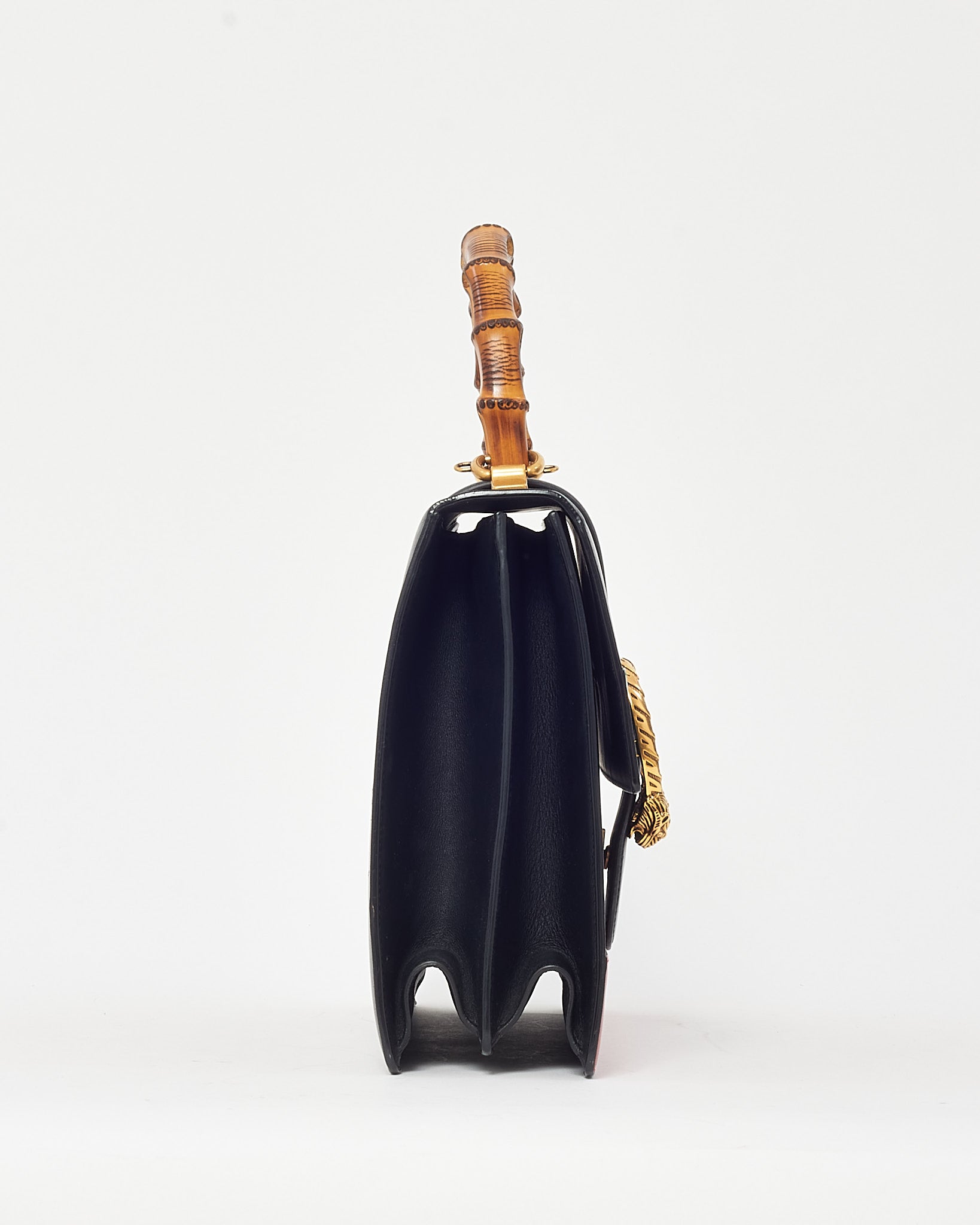 Make a powerful style statement with this pre-loved authentic Gucci Black/Red/Green Web Calfskin Leather Large Dionysus Bamboo Top Handle Bag. Crafted from luxurious black calfskin leather, this bold silhouette features the house’s iconic red and green Web stripe and a signature textured tiger head spur closure. The structured top handle is rendered in polished bamboo—a nod to Gucci’s heritage—while the detachable shoulder strap adds versatile carrying options. With a spacious suede-lined interior and refined gold-tone hardware, this bag blends classic elegance with modern edge.