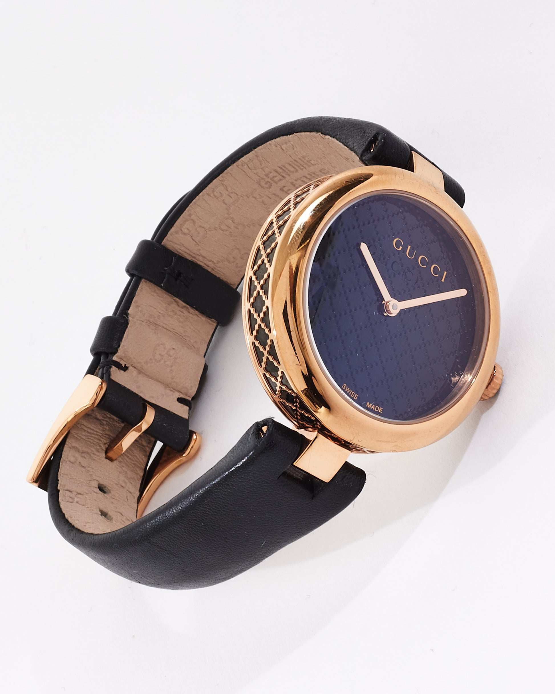 Explore Gucci's exquisite collection of watches, featuring this certified pre-owned Gucci Black Rose Gold Plated Stainless Steel Diamantissima Watch. Embodying timeless elegance and modern sustainability, each piece, including favorites like this, is authenticated by Retyche. Discover sustainable luxury — shop our current treasures or find inspiration for your next coveted find.