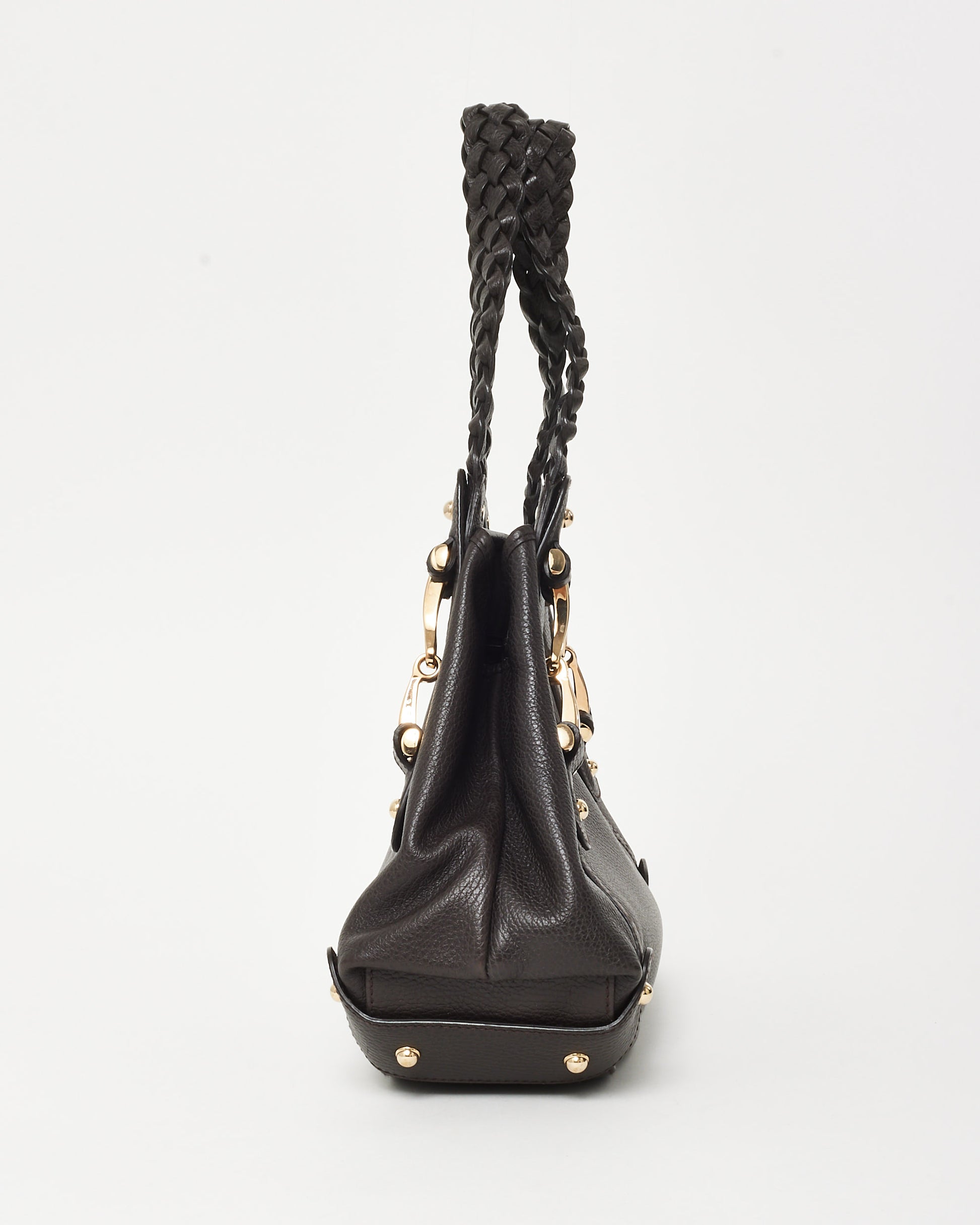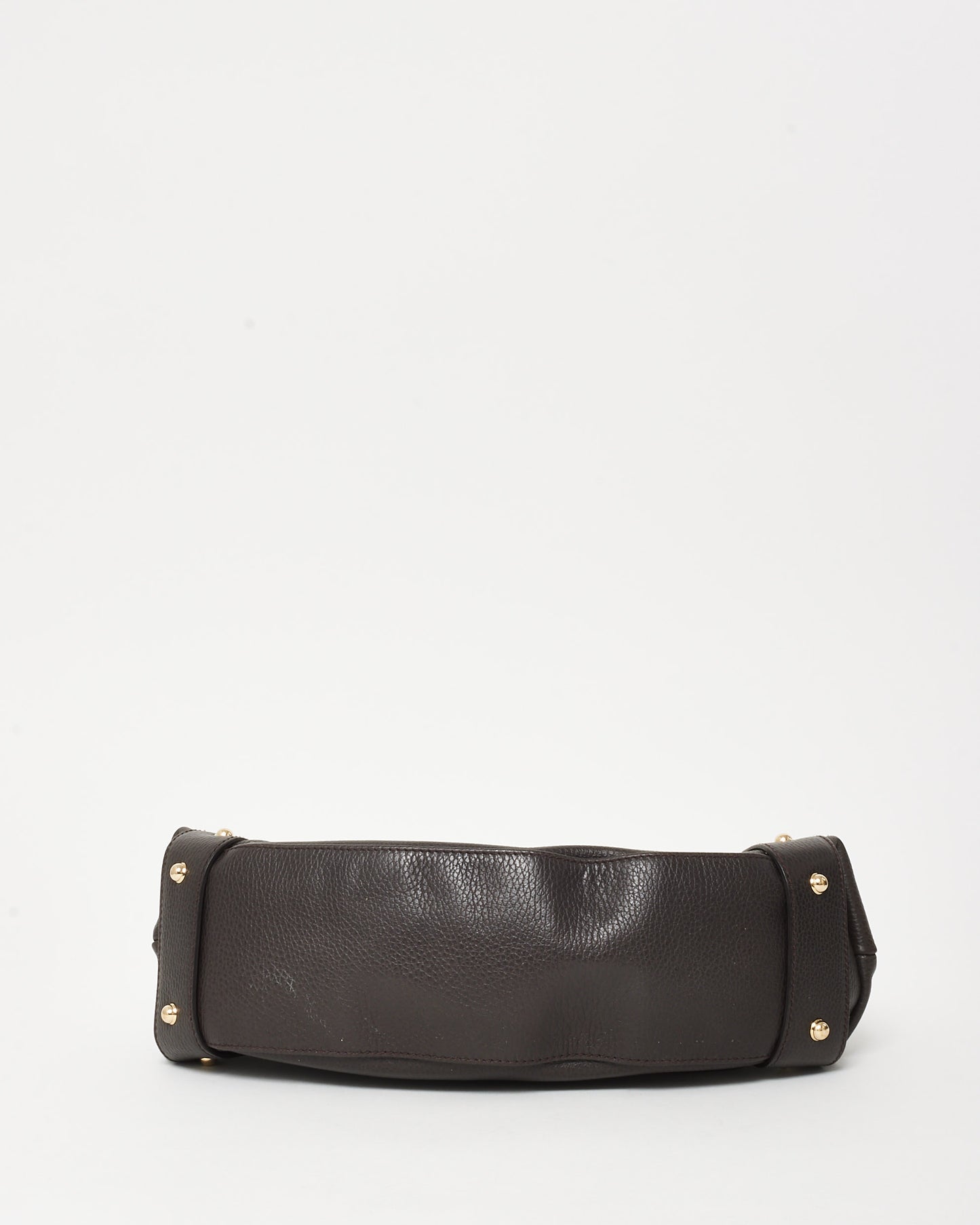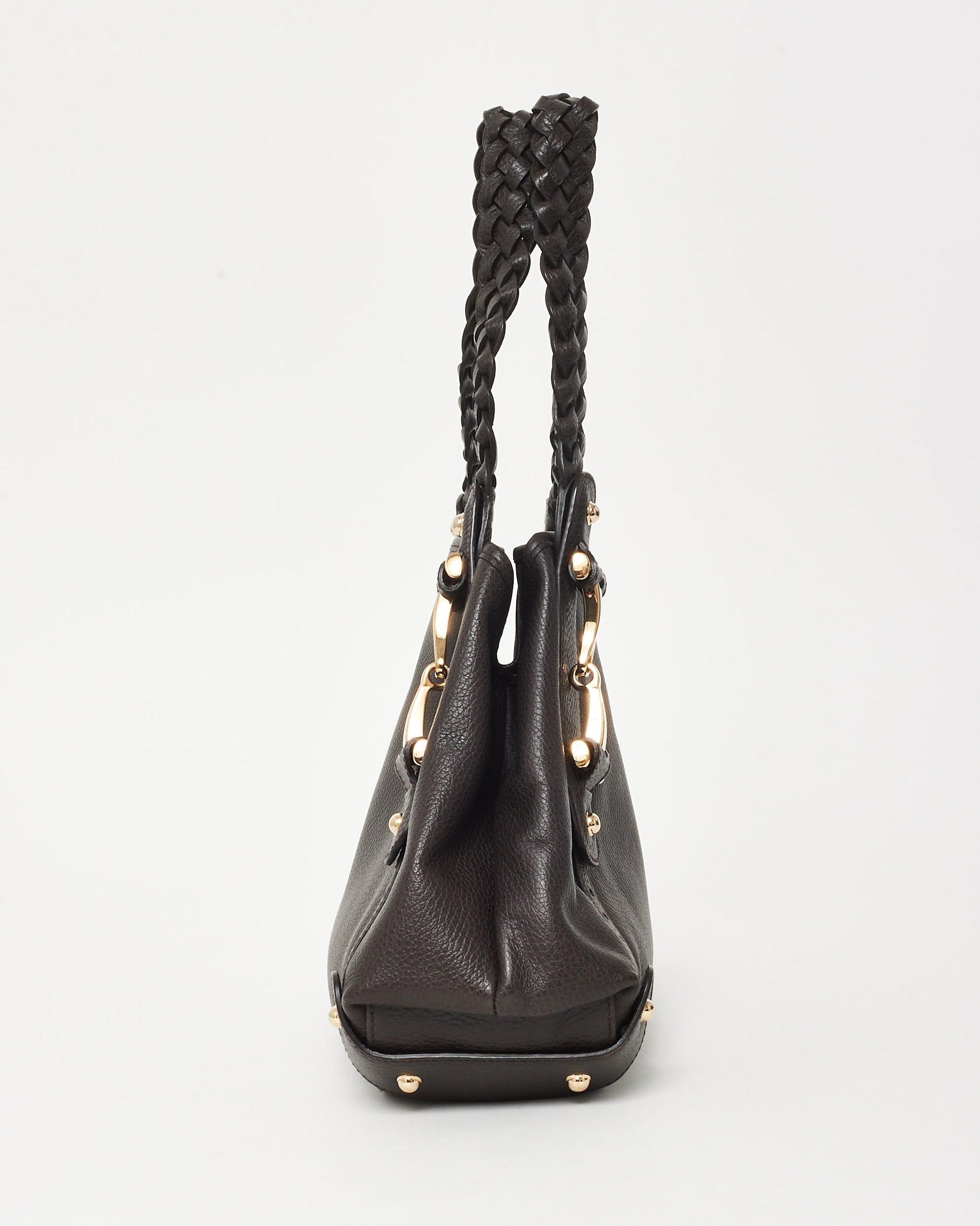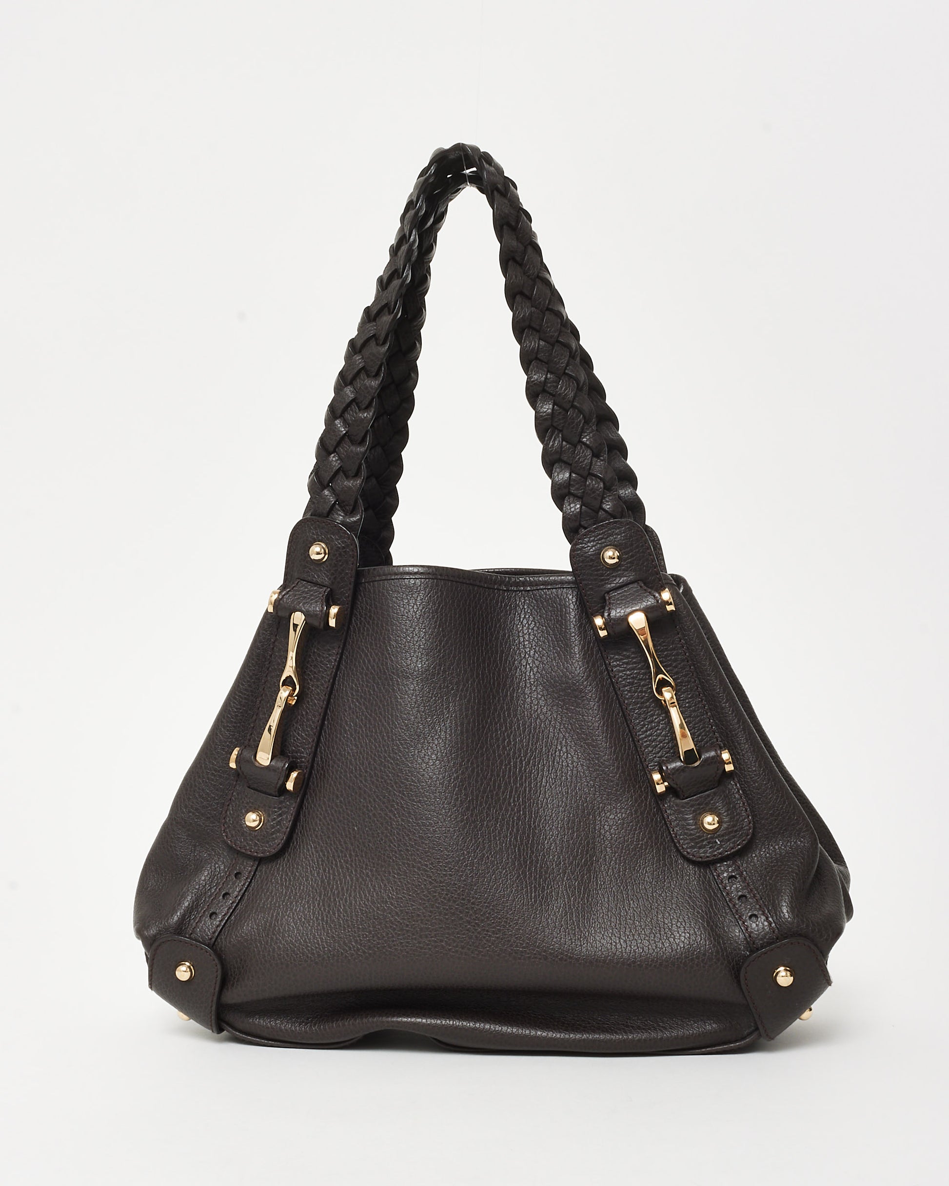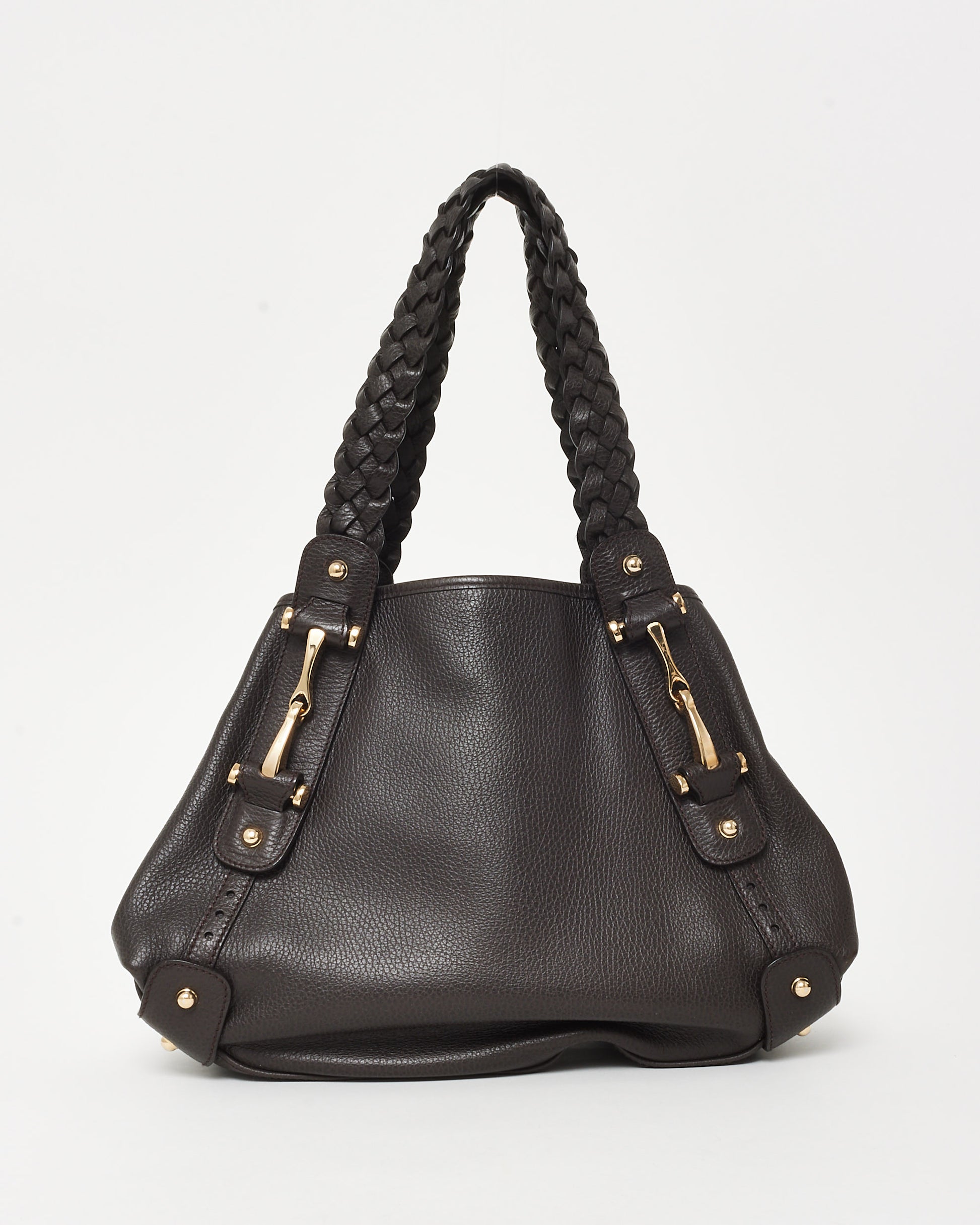 A rich blend of equestrian heritage and Italian craftsmanship, the pre-owned authentic Gucci Brown Pebbled Leather Horsebit Medium Pelham Shoulder Bag is a timeless statement of understated luxury. Crafted from supple, textured brown pebbled leather, this bag features Gucci’s iconic gold-tone horsebit hardware and braided leather handles, offering both structure and softness in one elegant silhouette.