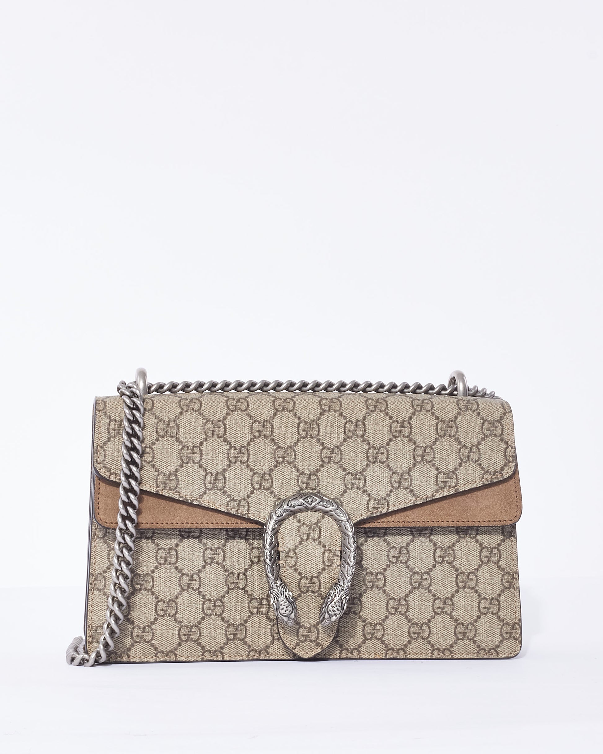 Explore Gucci's exquisite collection of handbags, featuring this certified pre-owned Beige Monogram GG Supreme Canvas Small Dionysus Bag. Embodying timeless elegance and modern sustainability, each piece, including favorites like this, is authenticated by Retyche. Discover sustainable luxury — shop our current treasures or find inspiration for your next coveted find.