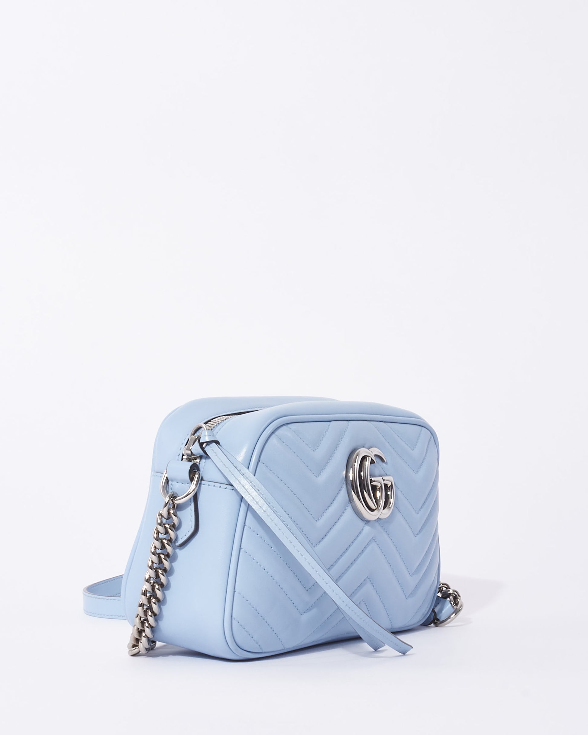 Explore Gucci's exquisite collection of handbags, featuring this certified pre-owned Light Blue Leather SHW Marmont Small Camera Bag. Embodying timeless elegance and modern sustainability, each piece, including favorites like this, is authenticated by Retyche. Discover sustainable luxury — shop our current treasures or find inspiration for your next coveted find.