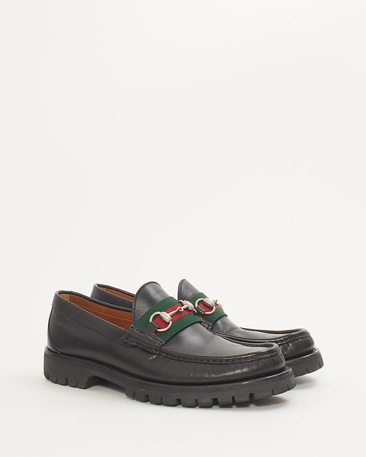 Men's Black Leather Web Horsebit Lug Sole Loafers - Men's 8