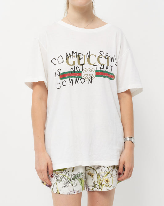 Bold and thought-provoking, this pre-owned authentic Gucci Men’s ‘Common Sense Is Not That Common’ T-Shirt is crafted from soft white cotton and features the brand’s iconic logo print overlaid with Coco Capitán’s handwritten slogan. The relaxed fit and lightly distressed finish add a casual, street-style edge.