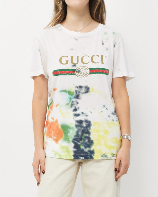 Playful and expressive, this pre-owned authentic Gucci Men’s T-Shirt is crafted from soft white cotton with a subtle tie-dye wash and features the iconic Gucci logo printed boldly across the front. The lightweight construction and classic crewneck silhouette offer effortless comfort and everyday ease.
