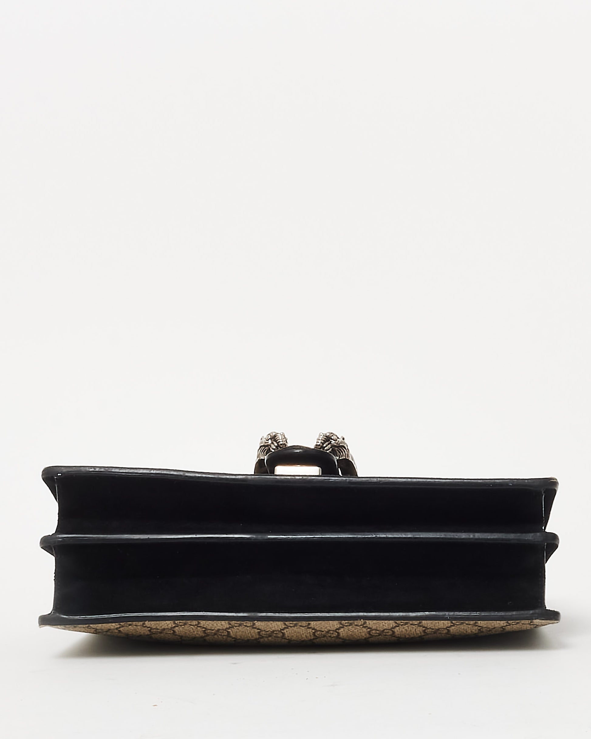 Sophistication meets bold elegance with this authentic pre-owned Gucci Monogram Coated Canvas & Black Suede Small Dionysus Shoulder Bag. This iconic design features Gucci’s signature monogram coated canvas, beautifully contrasted by plush black suede panels for a luxurious finish.