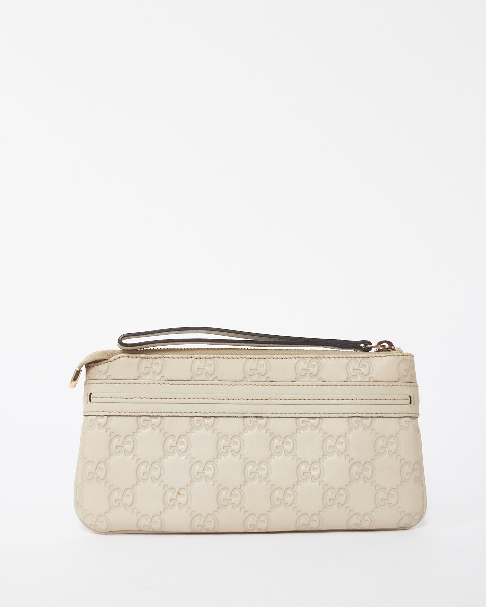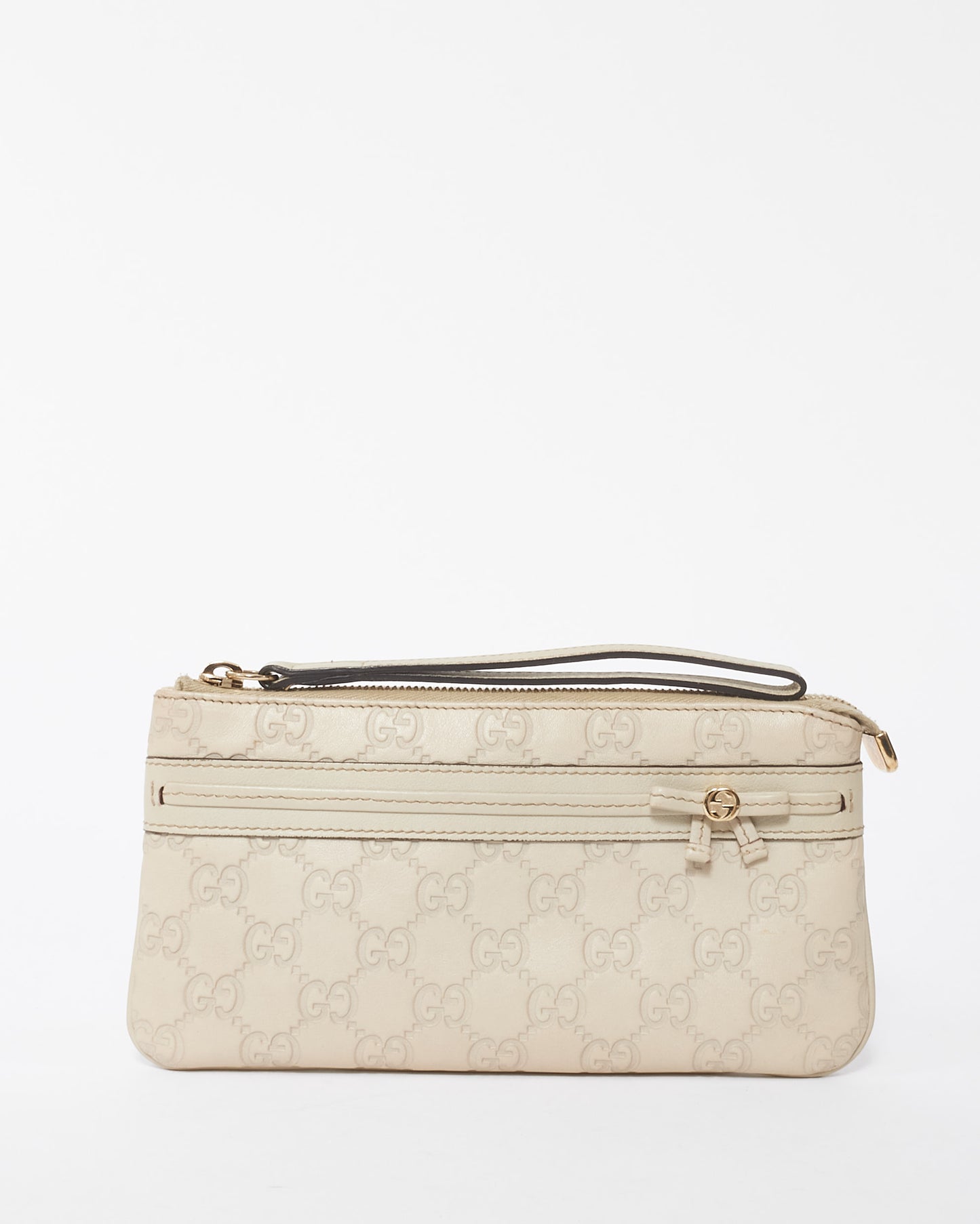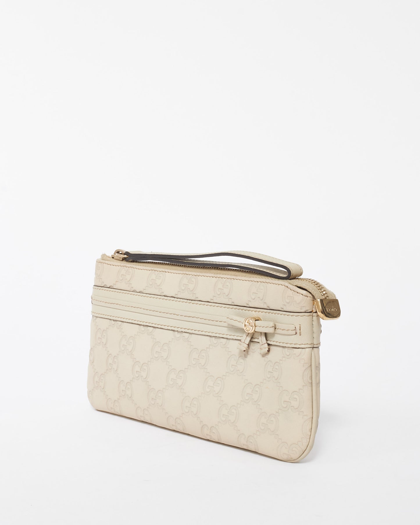 Explore Gucci's exquisite collection of Handbags, featuring this certified pre-owned Off-White Leather Guccisima Wrislet Clutch. Embodying timeless elegance and modern sustainability, each piece, including favorites like this, is authenticated by Retyche. Discover sustainable luxury — shop our current treasures or find inspiration for your next coveted find.