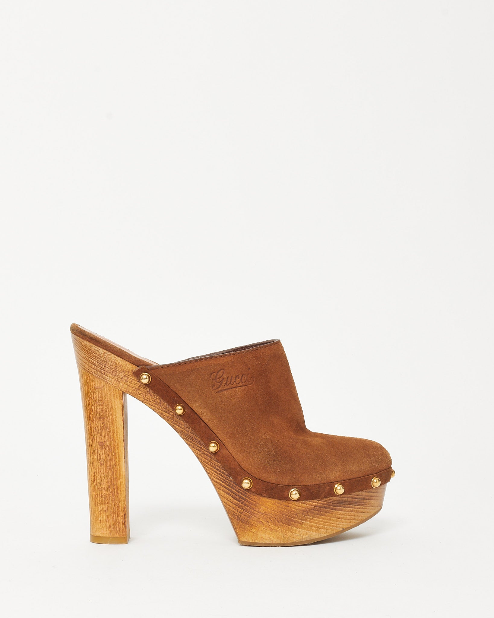A statement of vintage flair and modern edge, these pre-loved authentic Gucci Joplin Platform Clog Heels are crafted from rich tan suede and accented with gold-tone stud details along the wooden sole. The chunky platform and high block heel evoke a retro ’70s silhouette, while the branded hardware adds signature polish. A bold addition to any wardrobe, these clogs offer a confident lift with timeless Gucci sophistication.