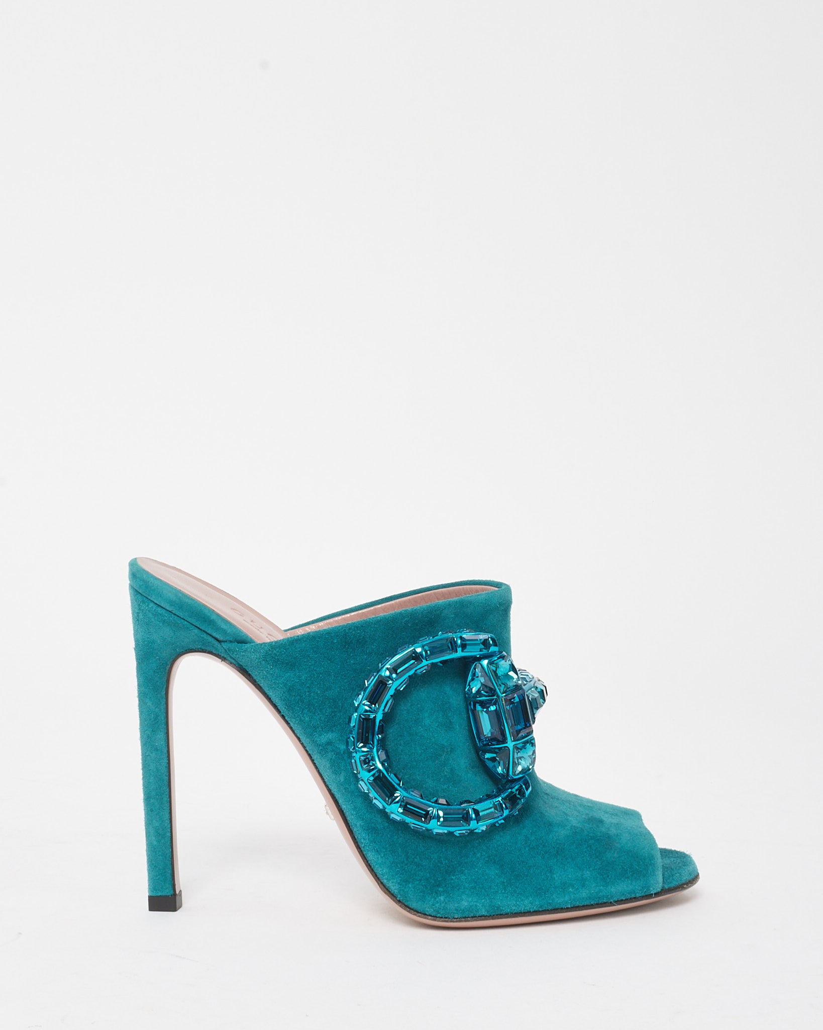 Turquoise Suede Maxime Crystal Horsebit Mule Heels - 35.5
