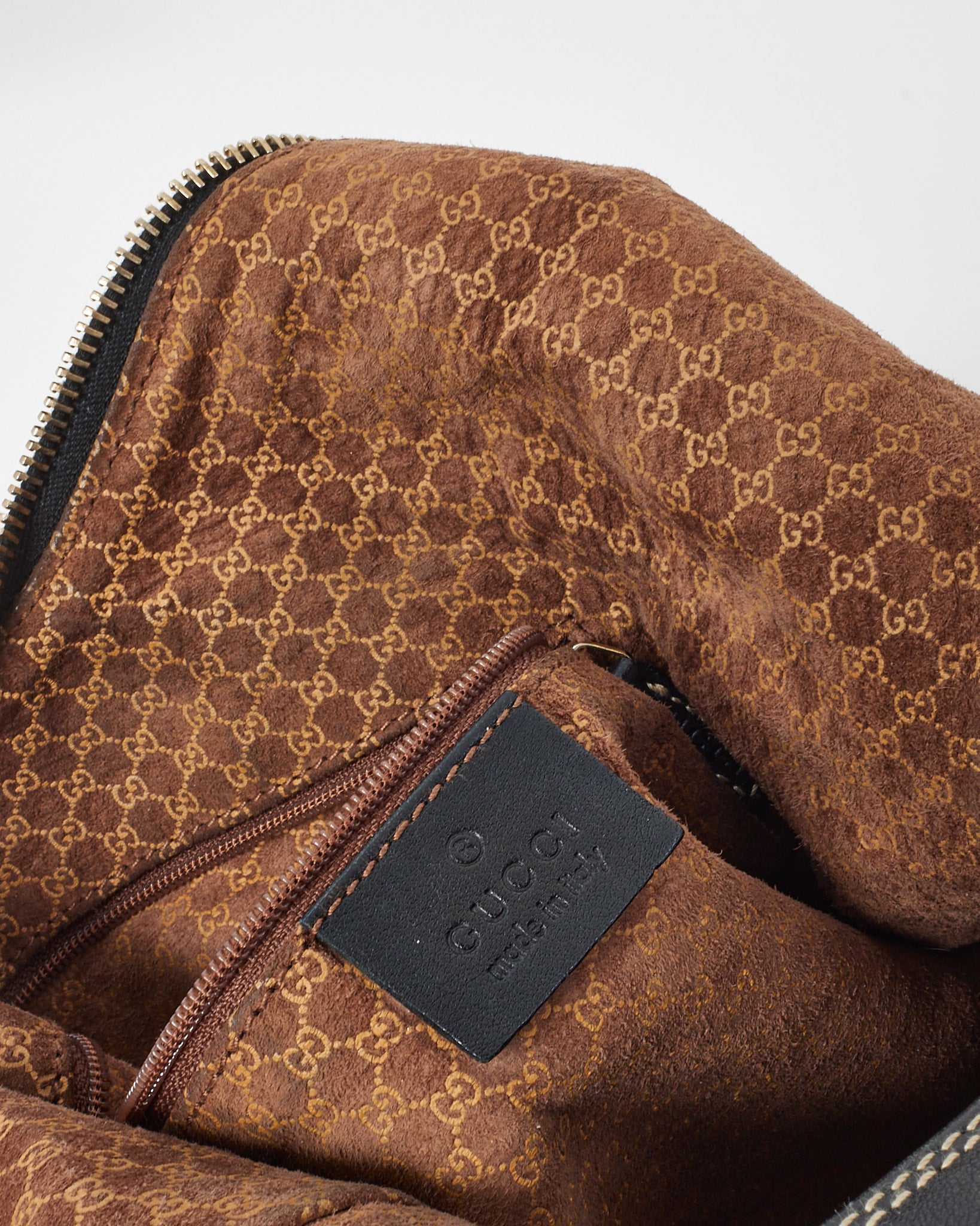 A refined staple from Gucci’s vintage collection, this pre-loved authentic hobo bag features a minimalist curved silhouette in classic black. Accented with gold-tone hardware and a top zip closure, the spacious interior offers everyday functionality with timeless appeal. The slim single strap fits comfortably over the shoulder, making it a sleek choice for elevated daily wear. A sophisticated carryall that embodies understated luxury.