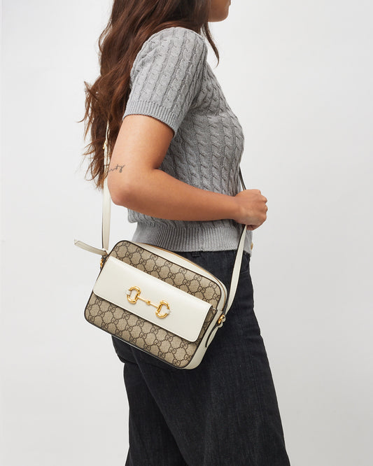 A modern take on archival elegance, this pre-owned authentic Gucci Horsebit 1955 Small Camera Bag is crafted from white GG Supreme coated canvas with tonal leather trim and gold-tone hardware. Featuring the iconic horsebit detail at the front and a compact, structured silhouette, it offers everyday versatility with timeless appeal.