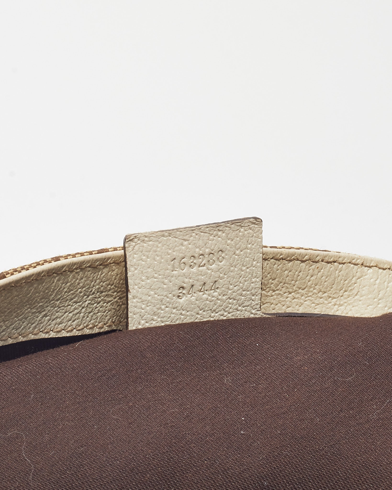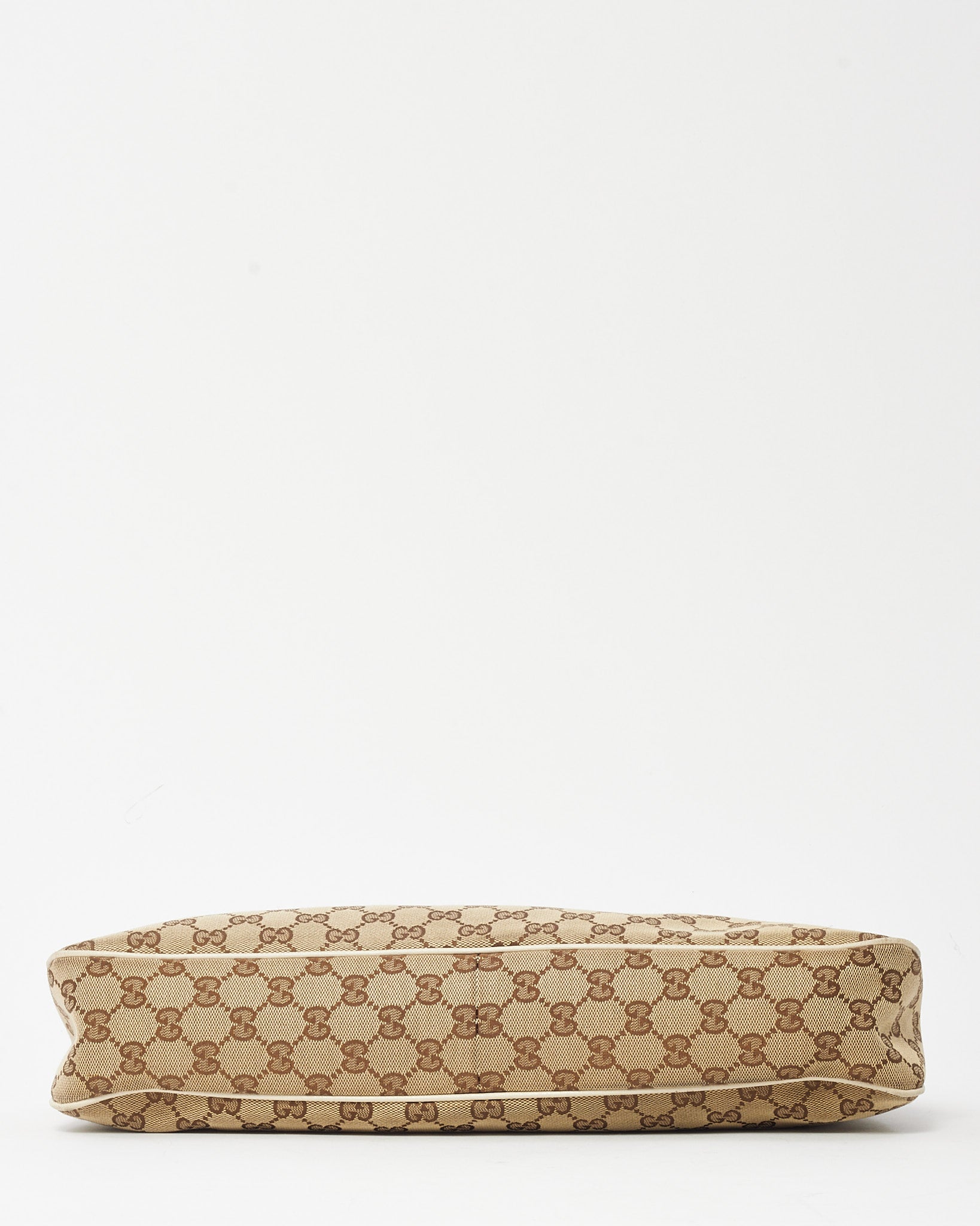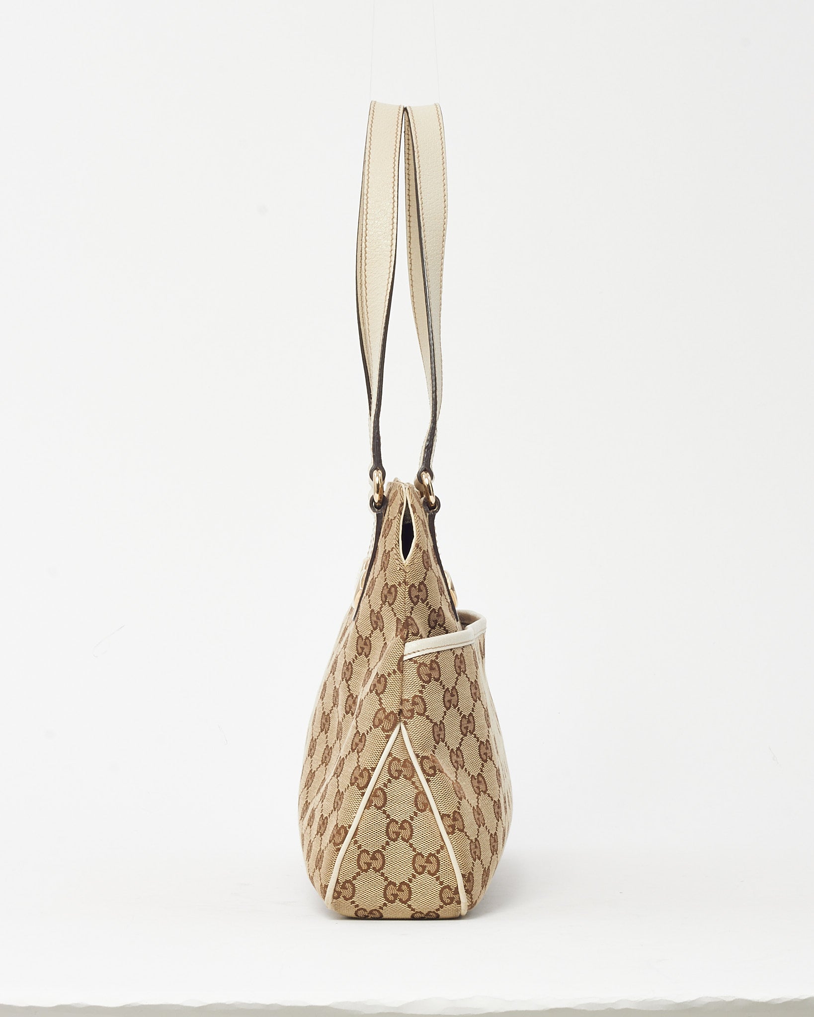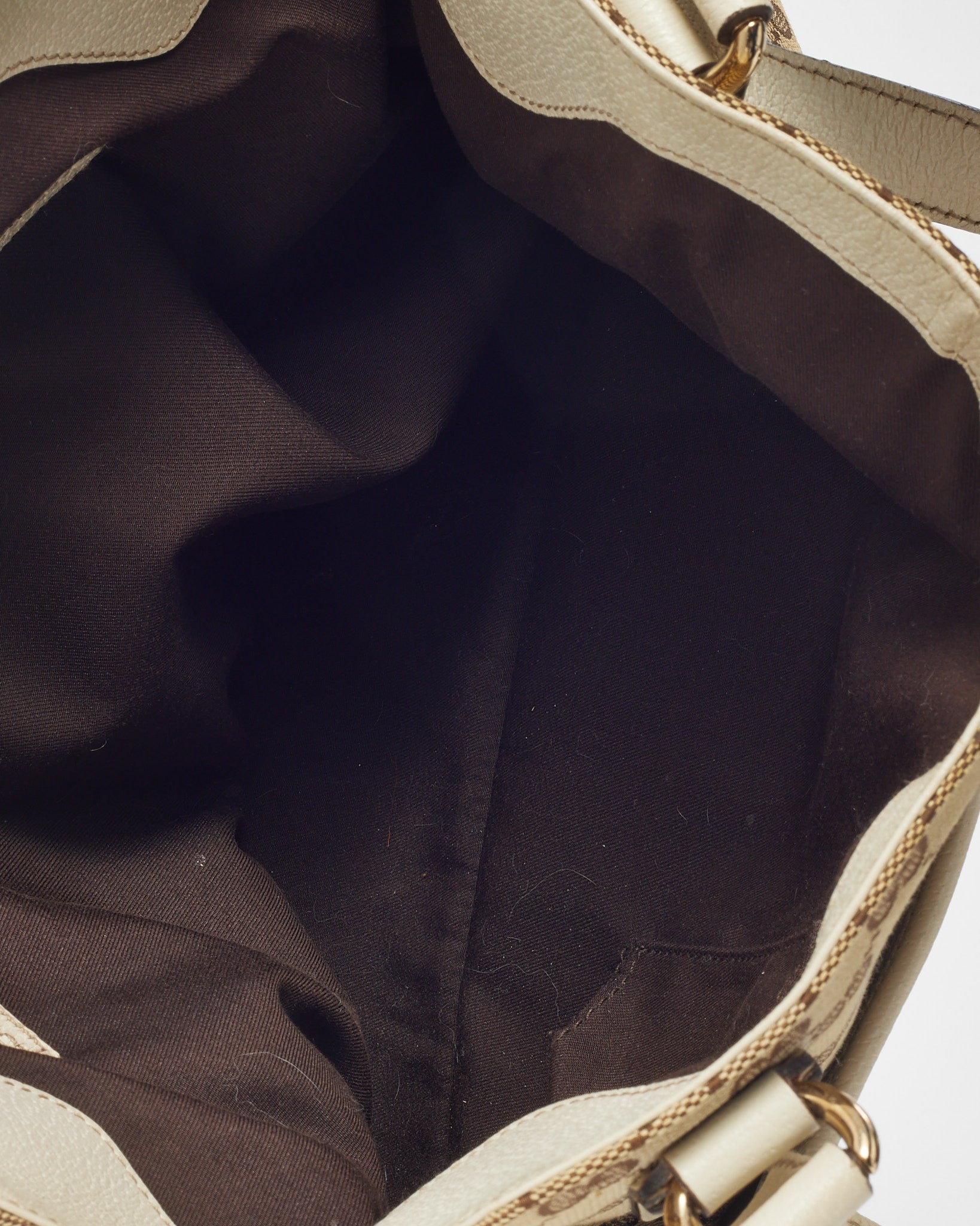 Elevate your everyday carry with this pre-loved authentic Gucci Charmy Shoulder Bag, blending timeless elegance with signature house codes. Crafted from soft white leather and the iconic beige and brown GG monogram canvas, this structured silhouette offers classic sophistication with a modern edge. Gold-tone hardware and an oversized leather tassel charm add distinctive flair, while the spacious interior makes it a practical choice for day-to-night styling.