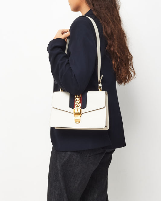 Chic and structured, this pre-owned authentic Gucci Sylvie Shoulder Bag is crafted from smooth white leather and accented with the house’s iconic navy and red Web stripe under a polished gold-tone chain detail. The petite silhouette features a top flap, buckle closure, and a leather shoulder strap for elegant carry.