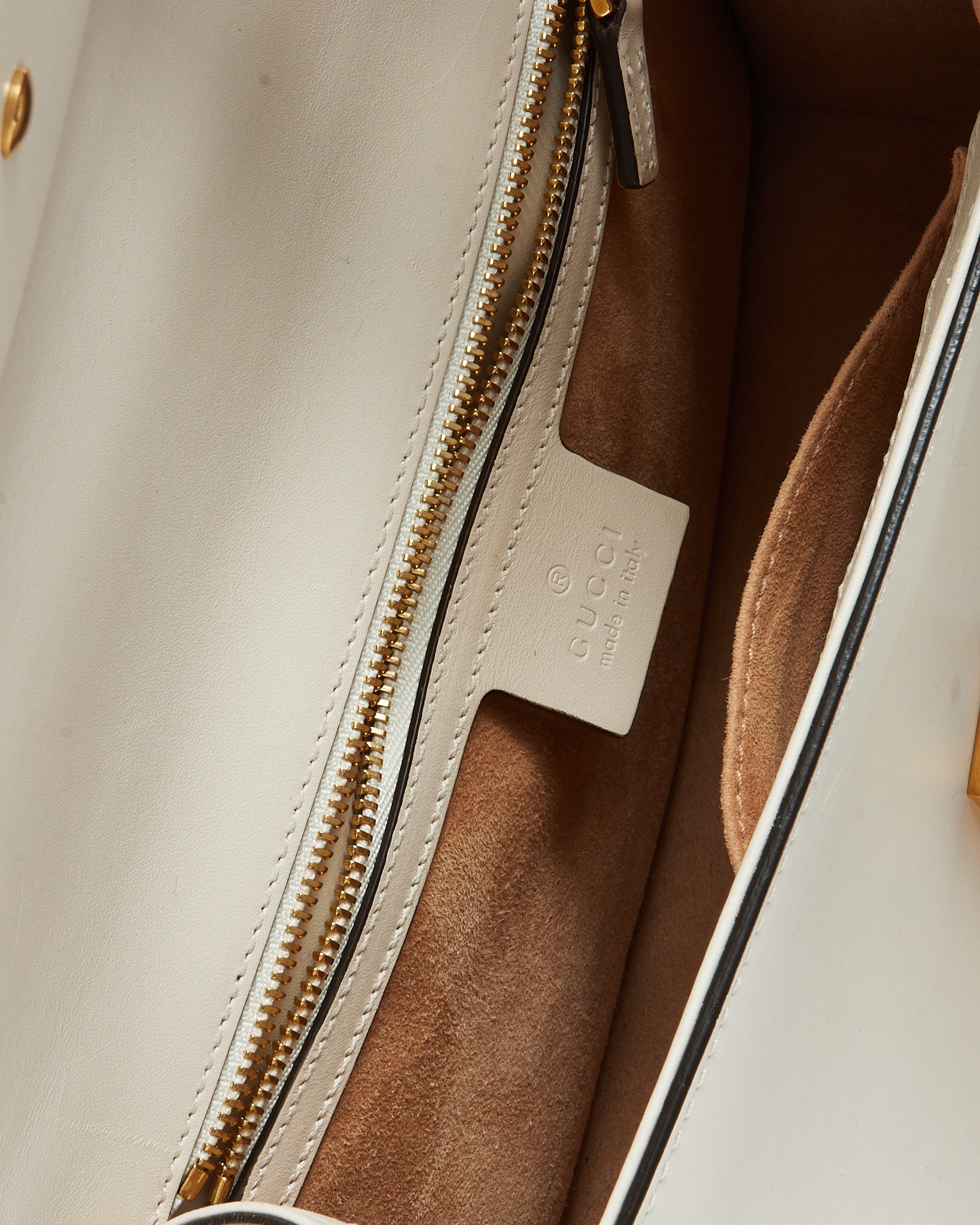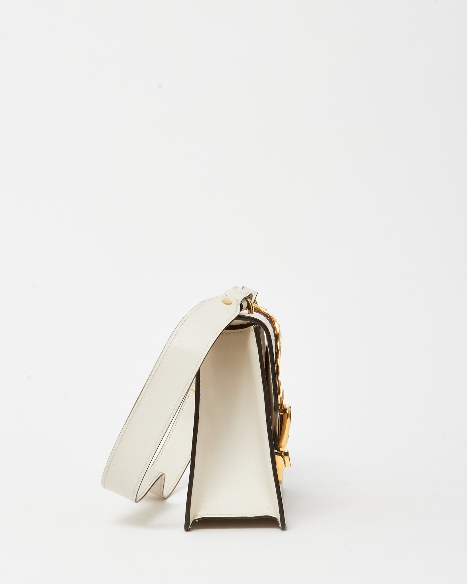 Add timeless elegance with a signature Gucci twist in this pre-loved authentic Gucci White Leather Small Web Sylvie Shoulder Bag, crafted in smooth white leather for a clean, polished finish. The structured Sylvie silhouette is defined by the iconic nylon Web stripe and gold-tone chain detail across the front, delivering unmistakable heritage appeal. Designed with a versatile strap for shoulder or crossbody wear and a compact yet functional interior for essentials, this Gucci bag blends classic sophistication with modern versatility. A refined designer piece that embodies Italian craftsmanship and iconic style.
