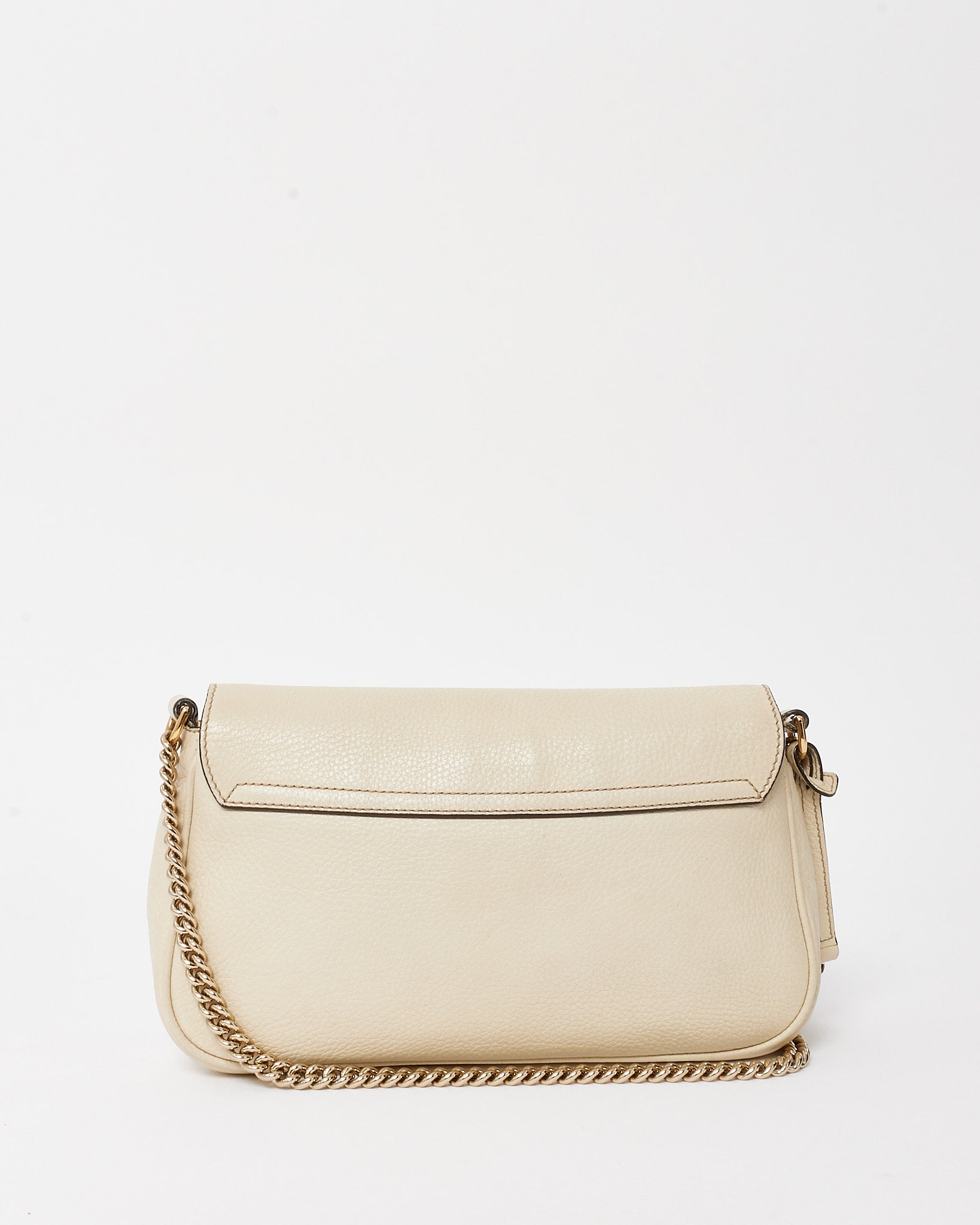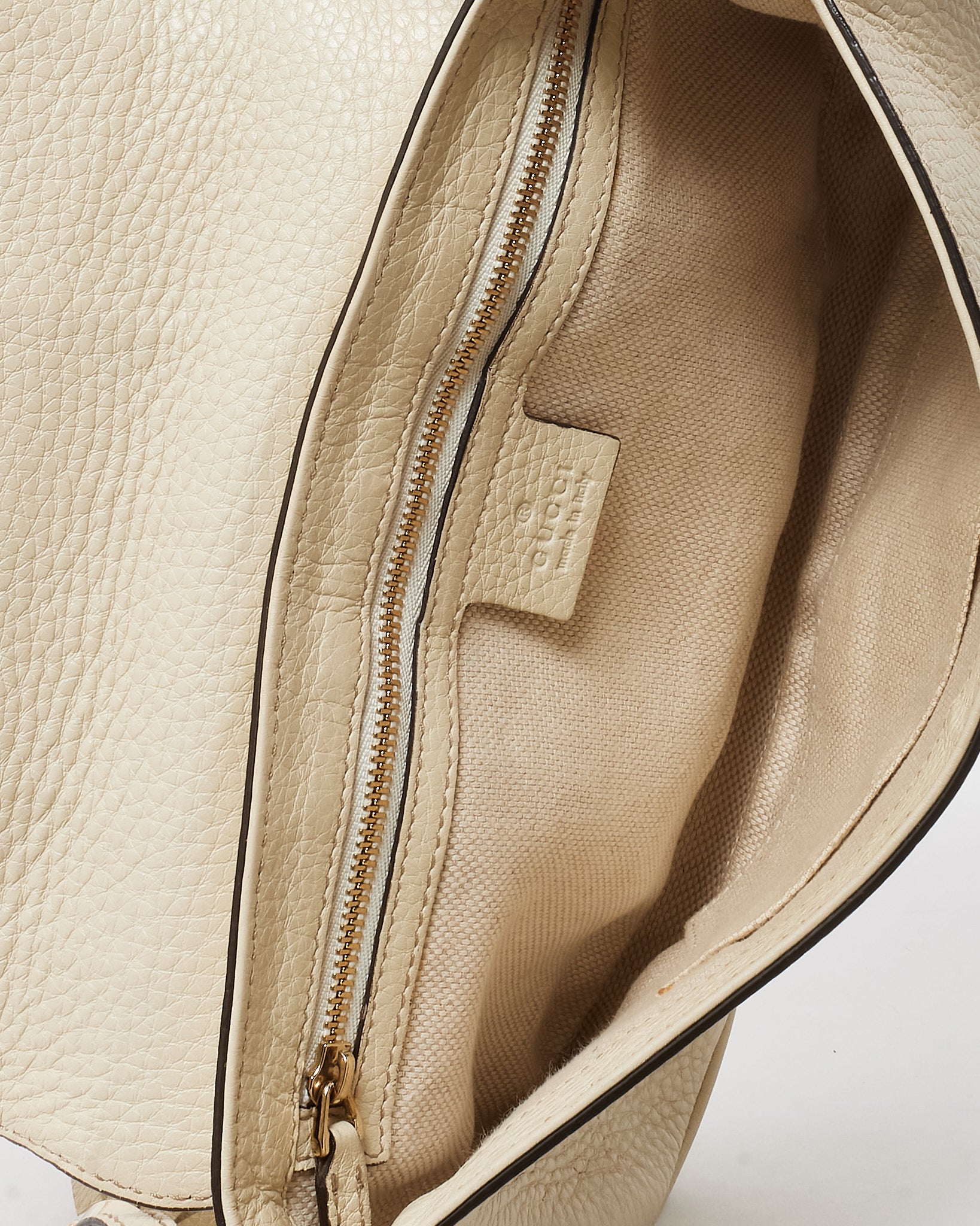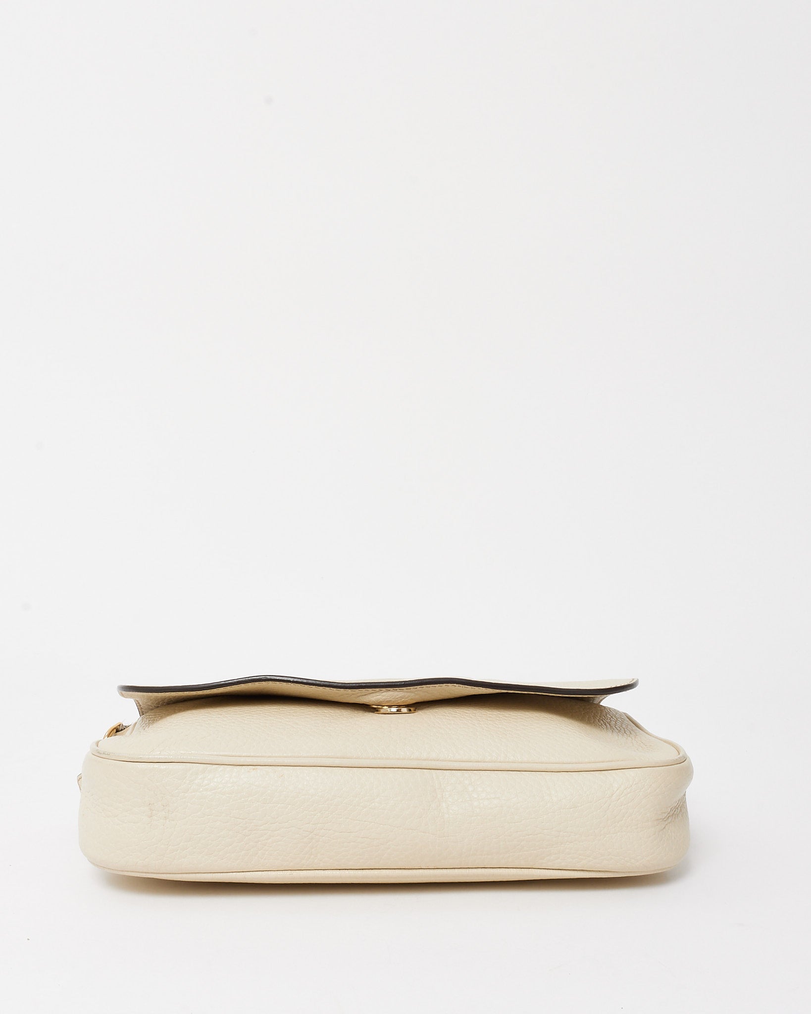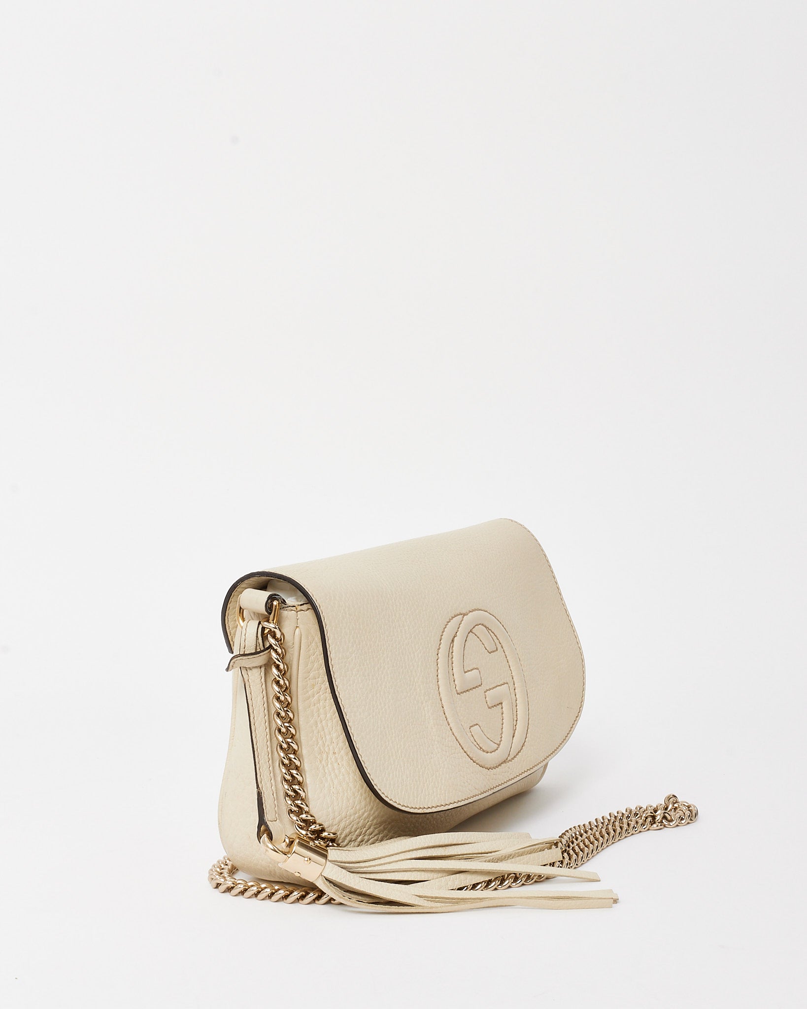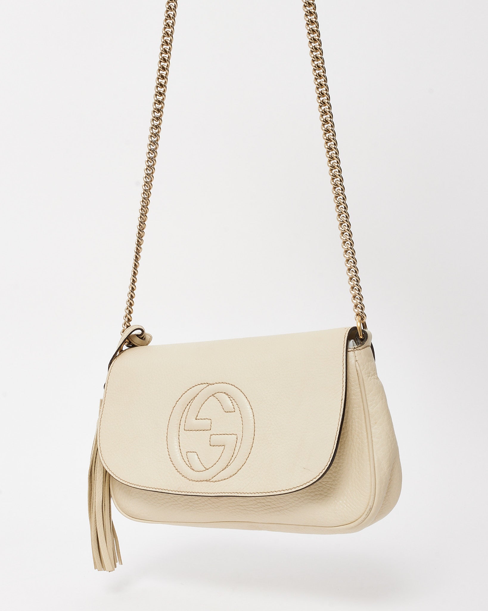Timeless and effortlessly chic, this pre-loved authentic Gucci Soho crossbody is crafted from supple white pebbled calfskin leather with a soft, grainy texture that exudes understated luxury. The medium-sized silhouette is adorned with the iconic interlocking GG logo stitched on the front flap, offering a signature finish. Inside, a spacious canvas-lined compartment accommodates your daily essentials, while the adjustable leather strap ensures comfortable crossbody or shoulder wear. Lightweight, refined, and easy to style, this Gucci Soho bag is a versatile wardrobe staple perfect for day-to-night sophistication.