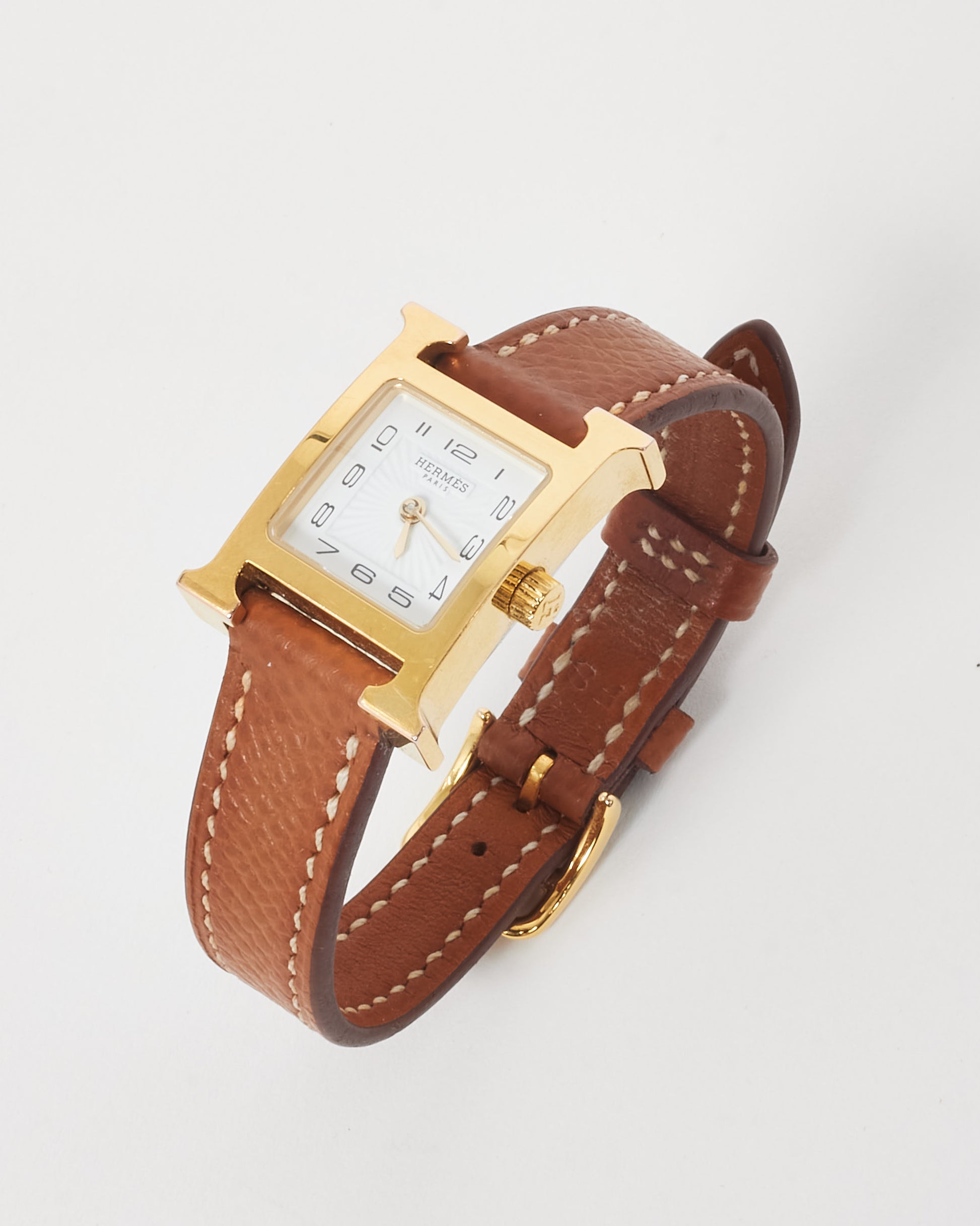 Timelessly sophisticated, the authentic pre-owned Hermès Gold Epsom Leather 18K Yellow Gold-Plated Heure H 21mm Watch (Mini Model) is a refined statement piece that blends luxury with everyday wearability. Featuring the signature “H” case plated in 18K yellow gold, this watch showcases Hermès’ dedication to impeccable craftsmanship and design.