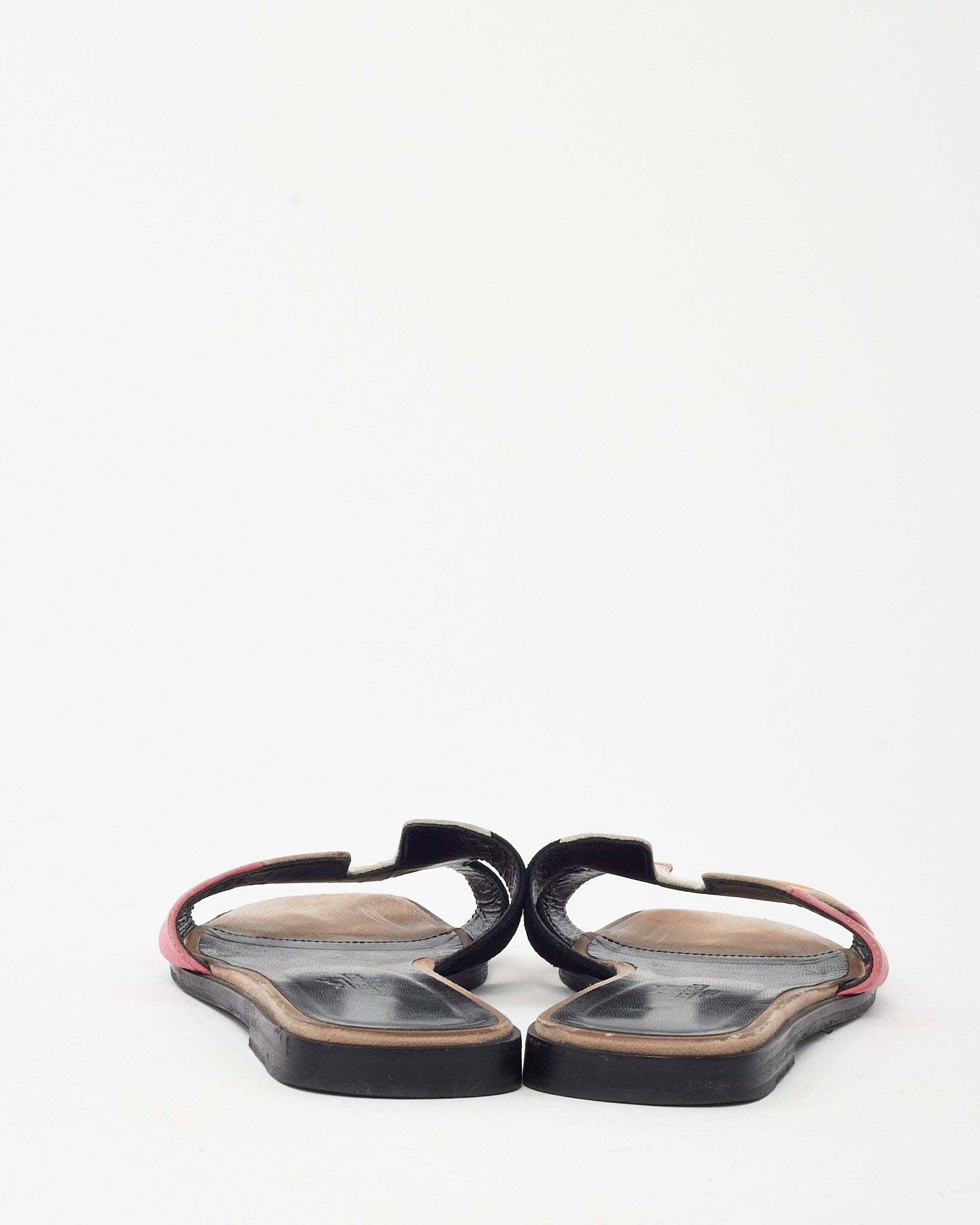 Step into signature style with these pre-loved authentic Hermès Oran H Sandals in size 36, crafted in a striking multicolor suede palette of beige, black, orange, and pink. Featuring the iconic “H” cut-out design, these sandals blend Parisian chic with standout craftsmanship. The plush suede upper and flat sole offer a comfortable yet elevated look, ideal for effortless daytime ensembles or resort-ready outfits. A vibrant twist on a timeless silhouette, these sandals add a refined pop of color to your summer wardrobe.