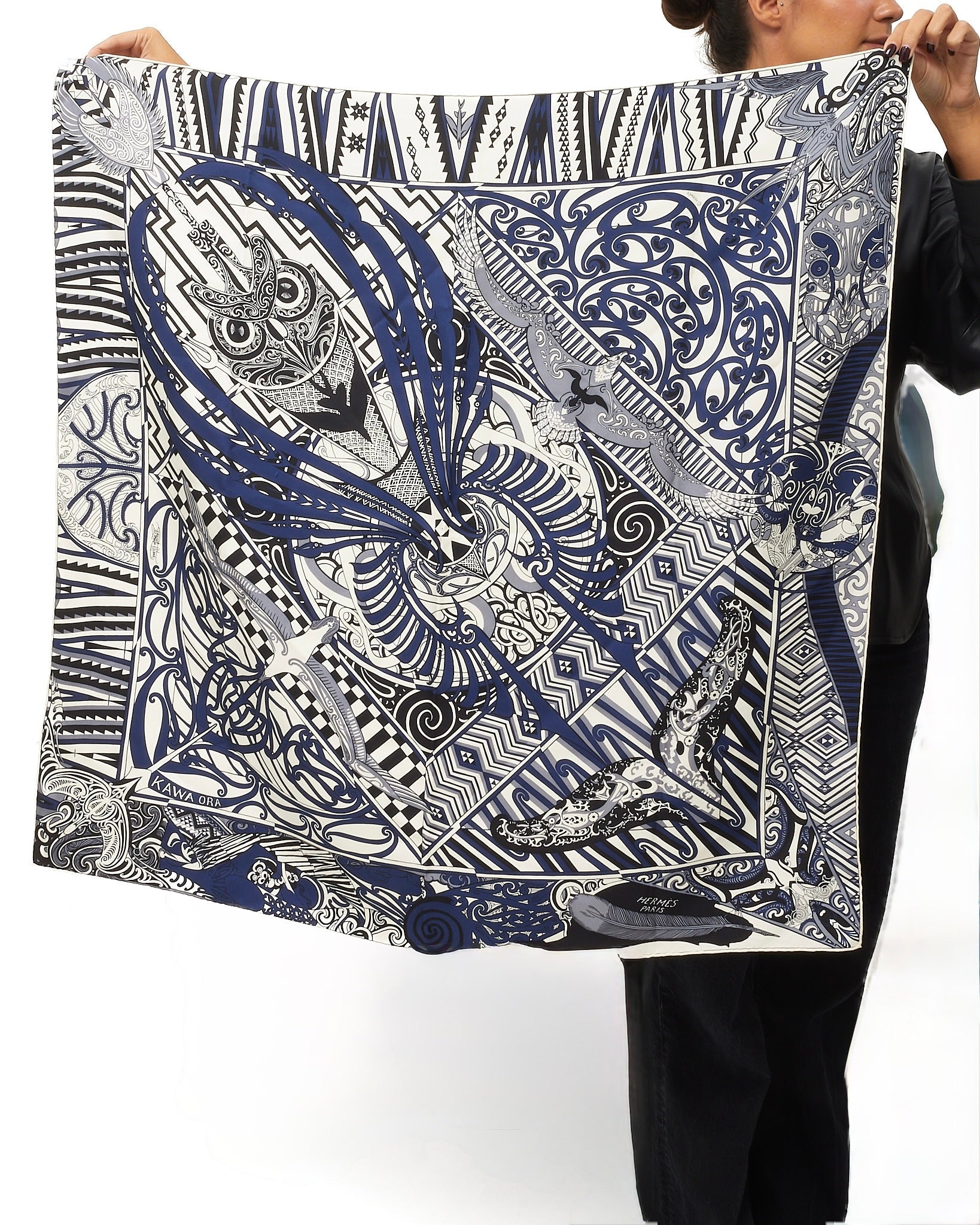 Rooted in rich cultural storytelling, this pre-loved authentic Hermès Kawa Ora Carre 90 scarf pays tribute to Māori heritage through symbolic artistry. Designed by New Zealand-based artist Joëlle de la Fontaine, the composition features bold masks and tribal motifs in a vivid palette of blue, white, navy, and multicolor. Crafted from luxurious silk twill and finished with signature hand-rolled edges, this 90cm scarf is a true wearable artwork. Whether styled around the neck, tied to a bag, or framed as decor, it evokes meaning, identity, and timeless Hermès sophistication.