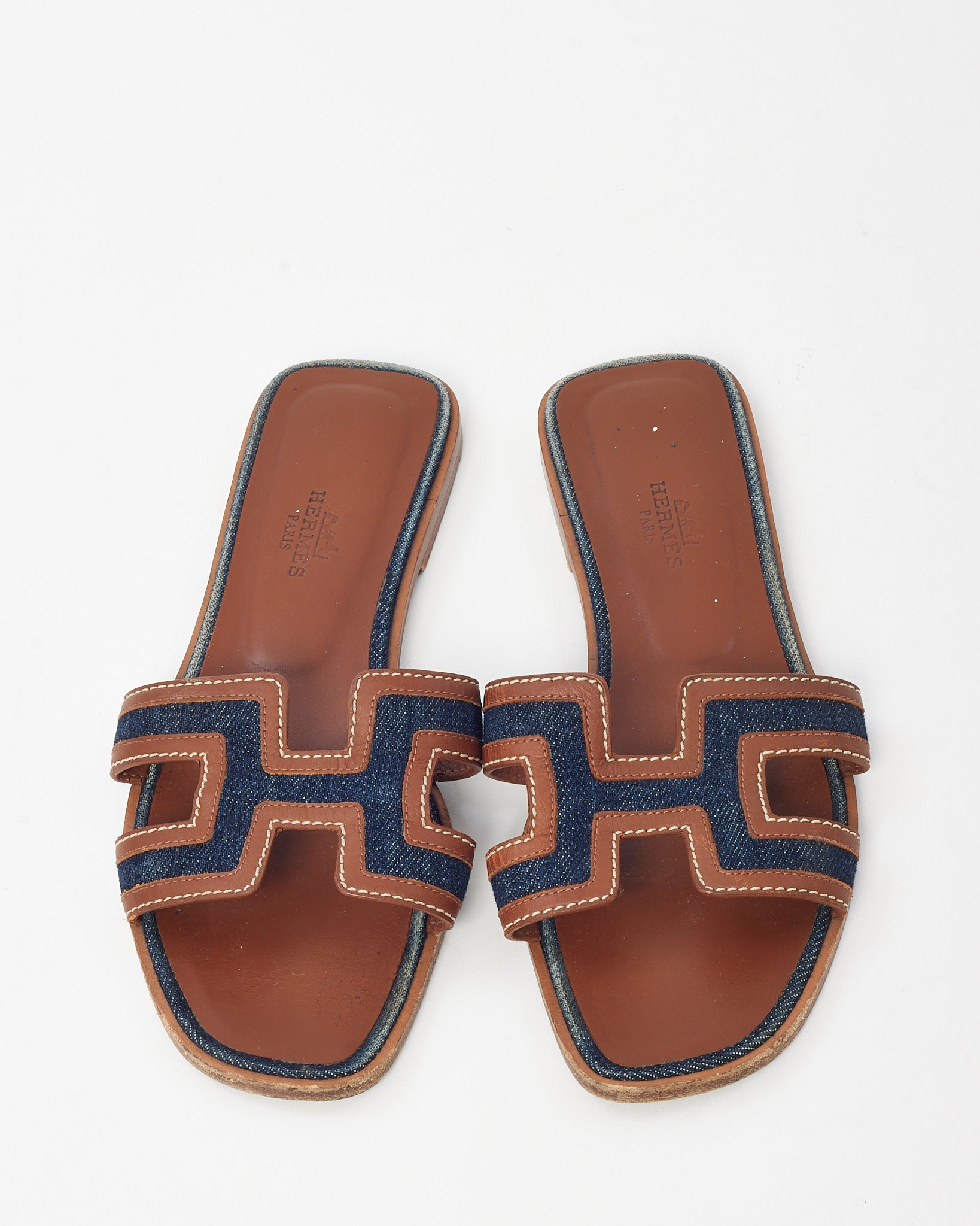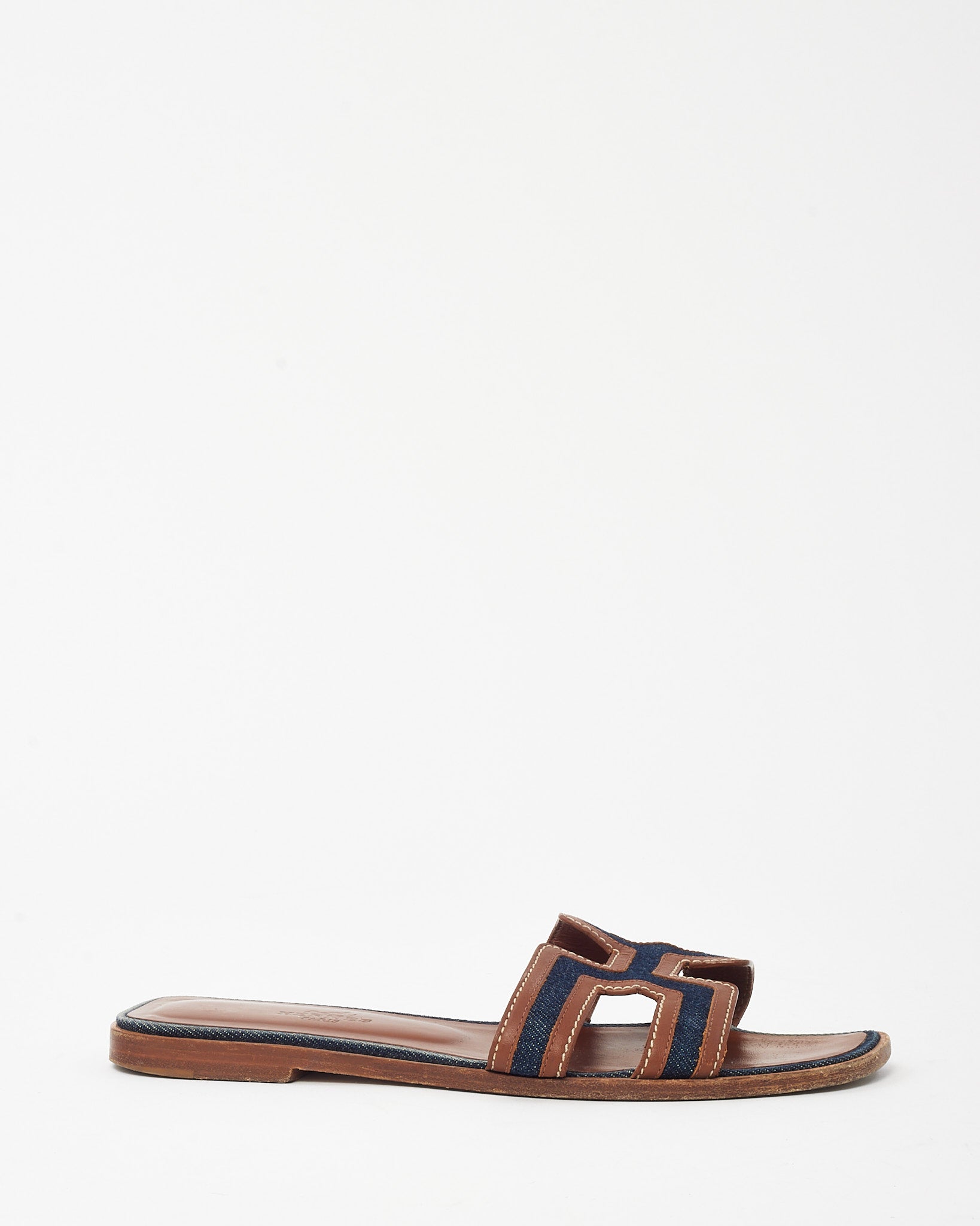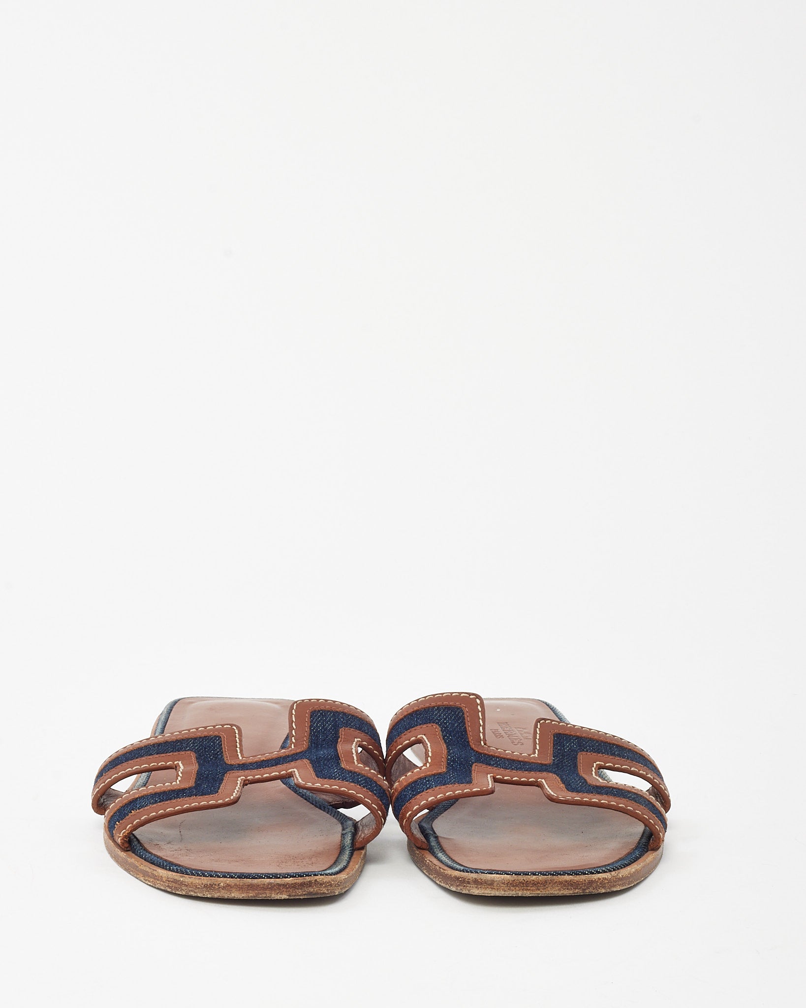 Hermès Brown Leather and Blue Denim Oran H Sandals - 36.5