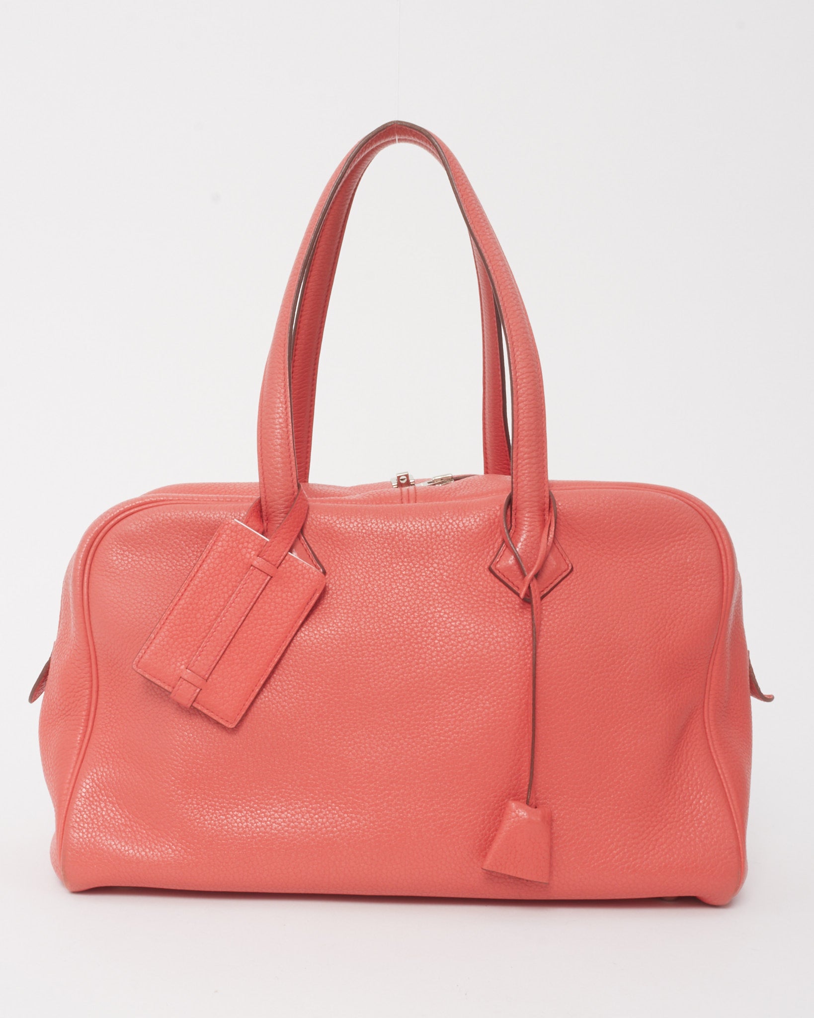 Understated yet refined, this pre-owned authentic Hermès Victoria 35 is crafted from supple Clemence leather in Rouge Pivoine, a vibrant coral red hue, and finished with palladium hardware. The streamlined silhouette features dual top handles, a double zip closure, and a spacious interior lined in soft canvas with ample room for daily essentials or travel.