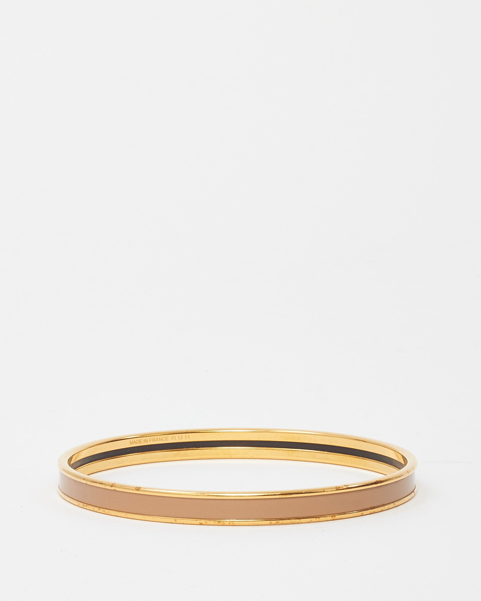 Elevate your accessories game with this pre-loved authentic Hermès Extra Narrow Bangle, crafted with a refined gold-tone finish and soft beige enamel. The sleek, minimalist design is accented by the signature Hermès Uni logo, offering a subtle nod to the iconic brand. Perfect for stacking or wearing solo, this lightweight bracelet adds an elegant touch to both casual and formal ensembles. A timeless piece that blends luxury with everyday versatility.