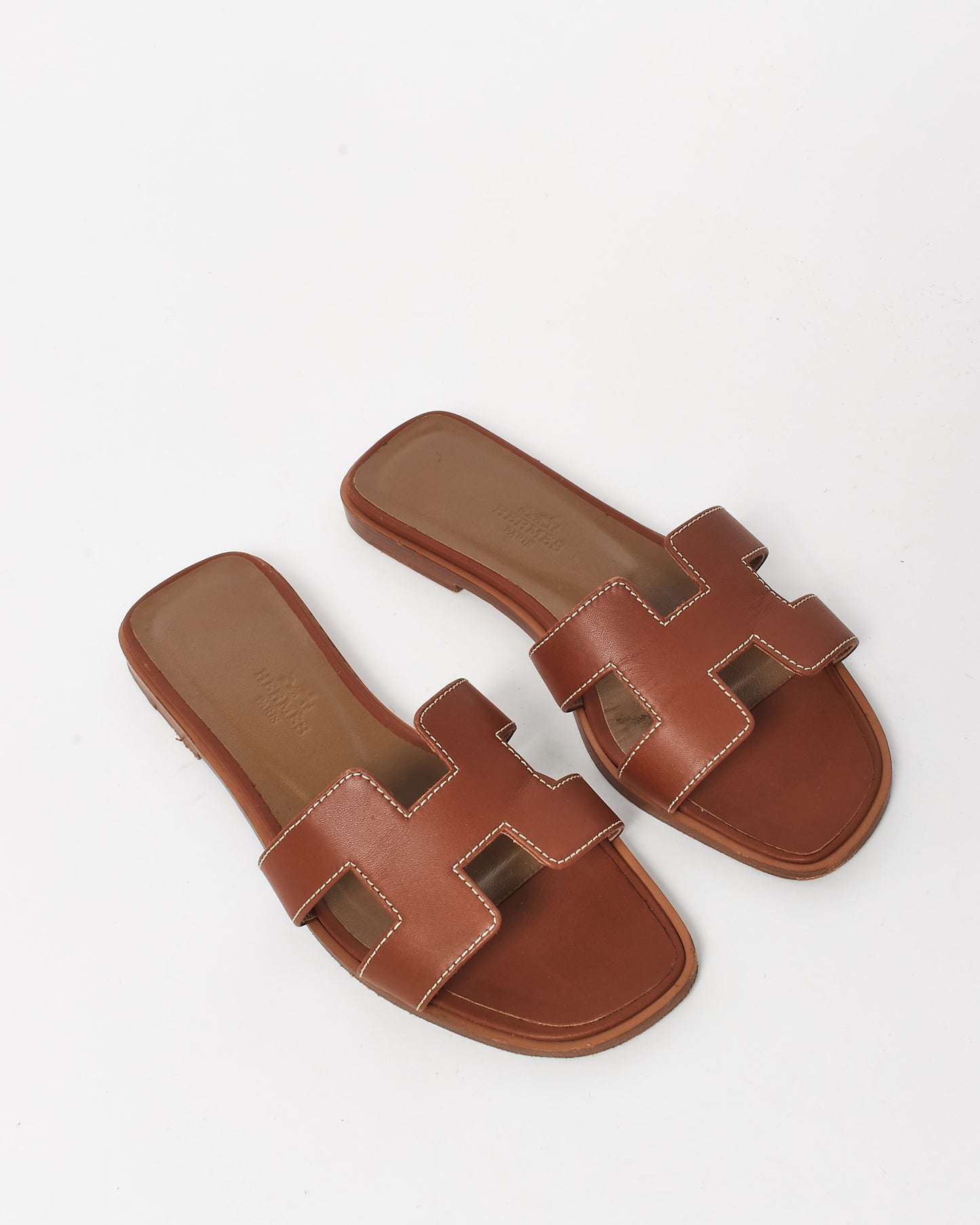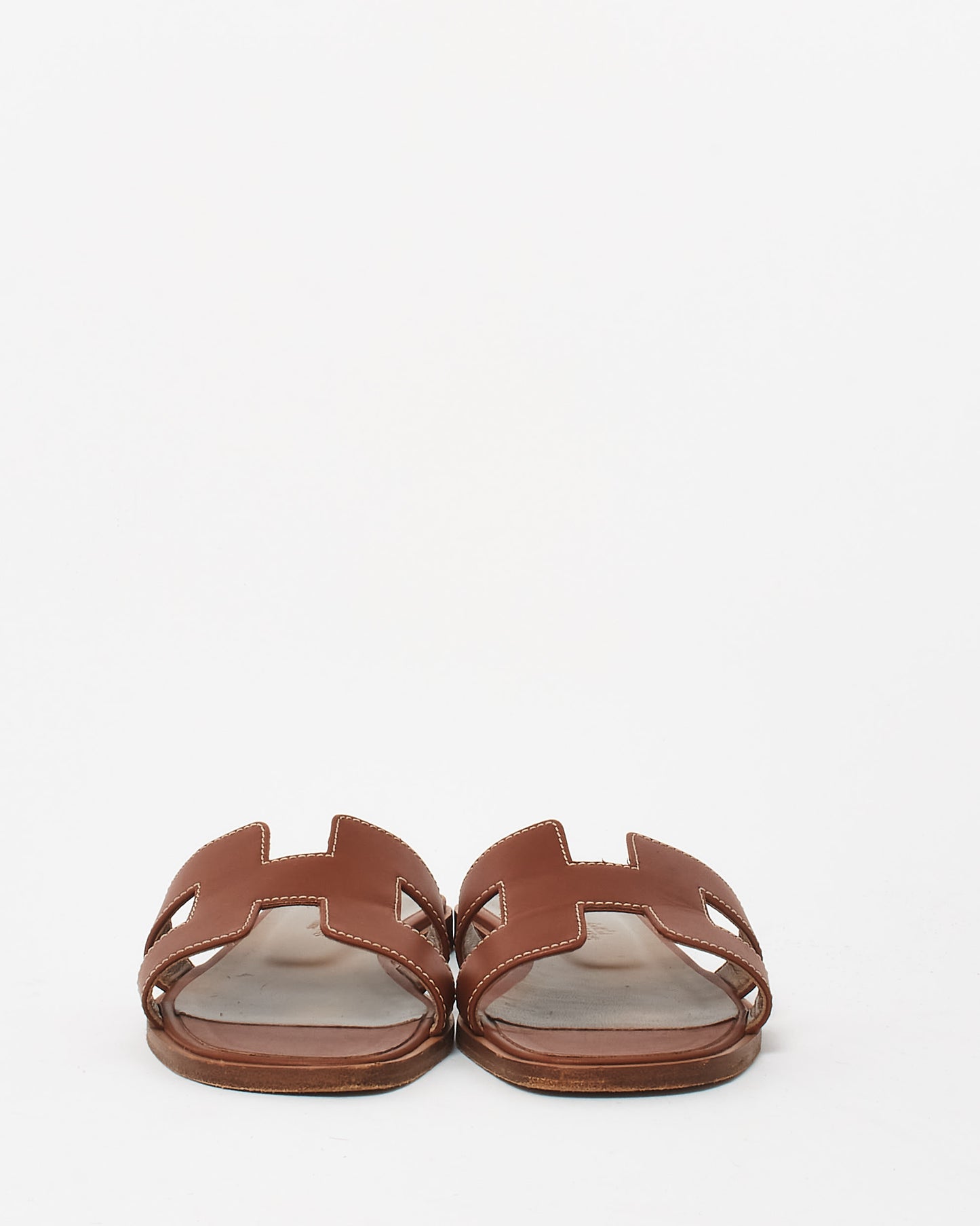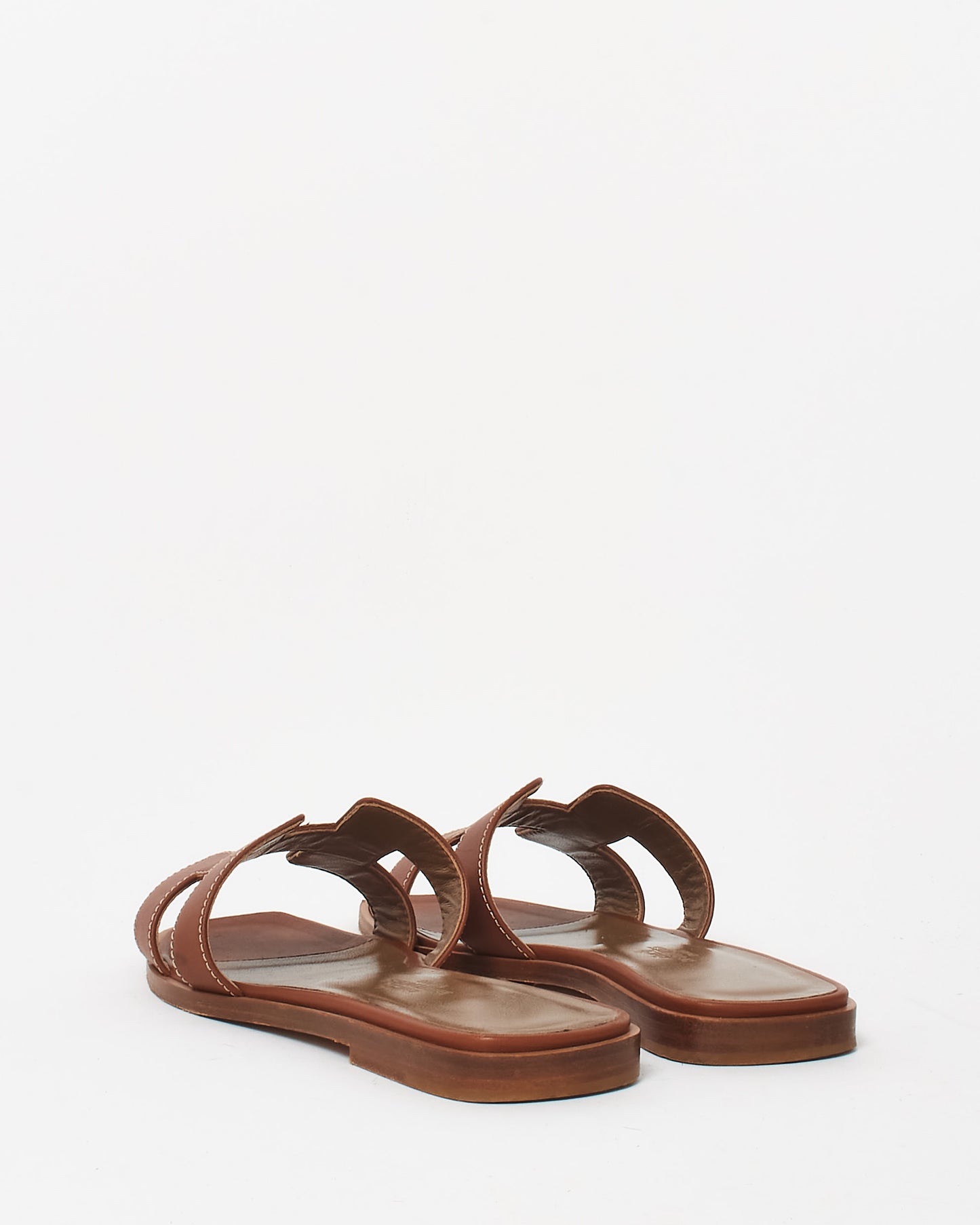 These authentic pre-owned Hermès Gold (Tan) Leather Oran Sandals are a classic icon of effortless sophistication. Crafted from premium leather in the brand’s signature “Gold” tan hue, these sandals feature the iconic “H” cut-out design and a sleek silhouette, making them the perfect addition to any warm-weather wardrobe. Gold (Tan) leather, open-toe slide with “H” cut-out detailing, leather sole. Shop pre-owned authentic Hermès sandals at Retyche.