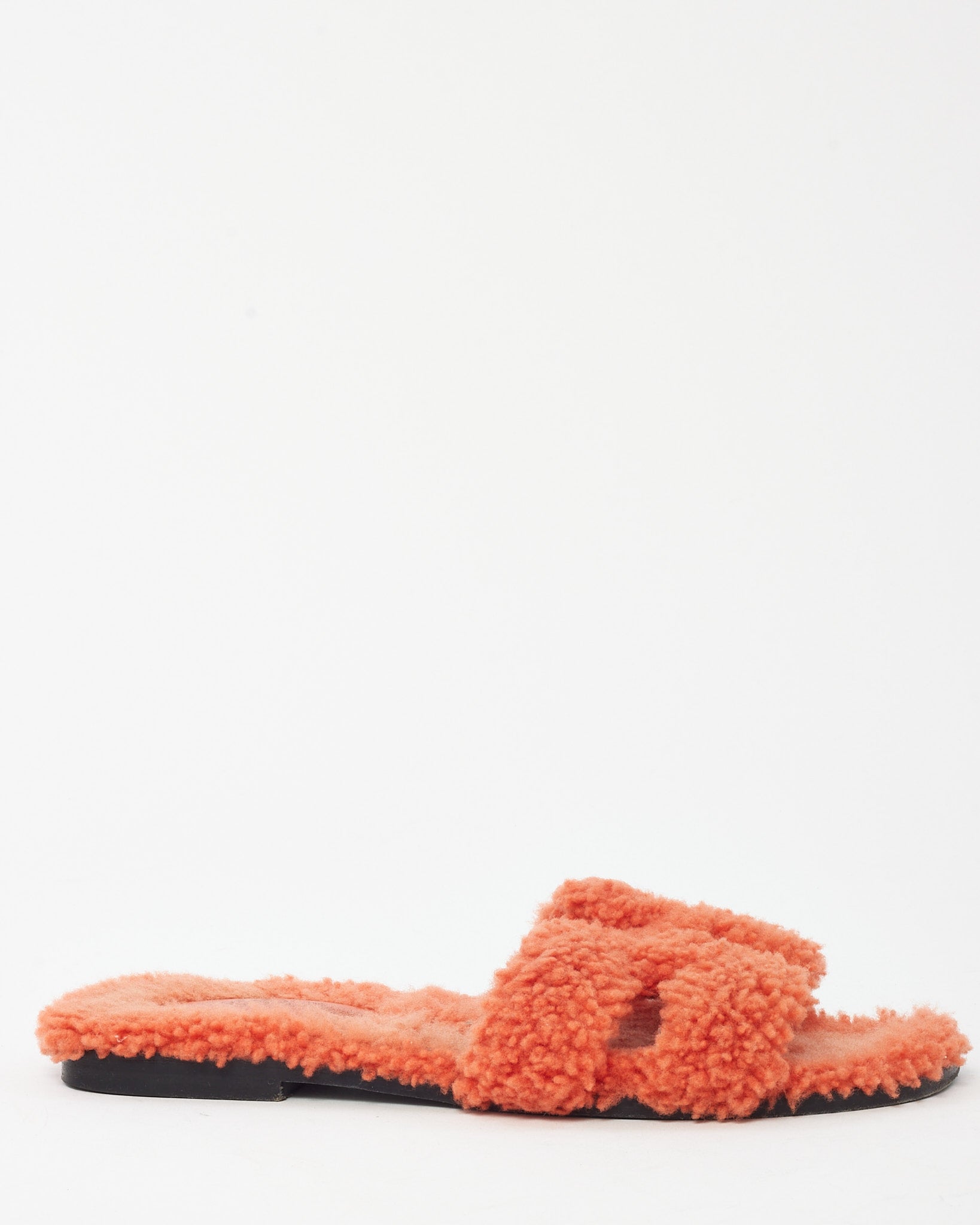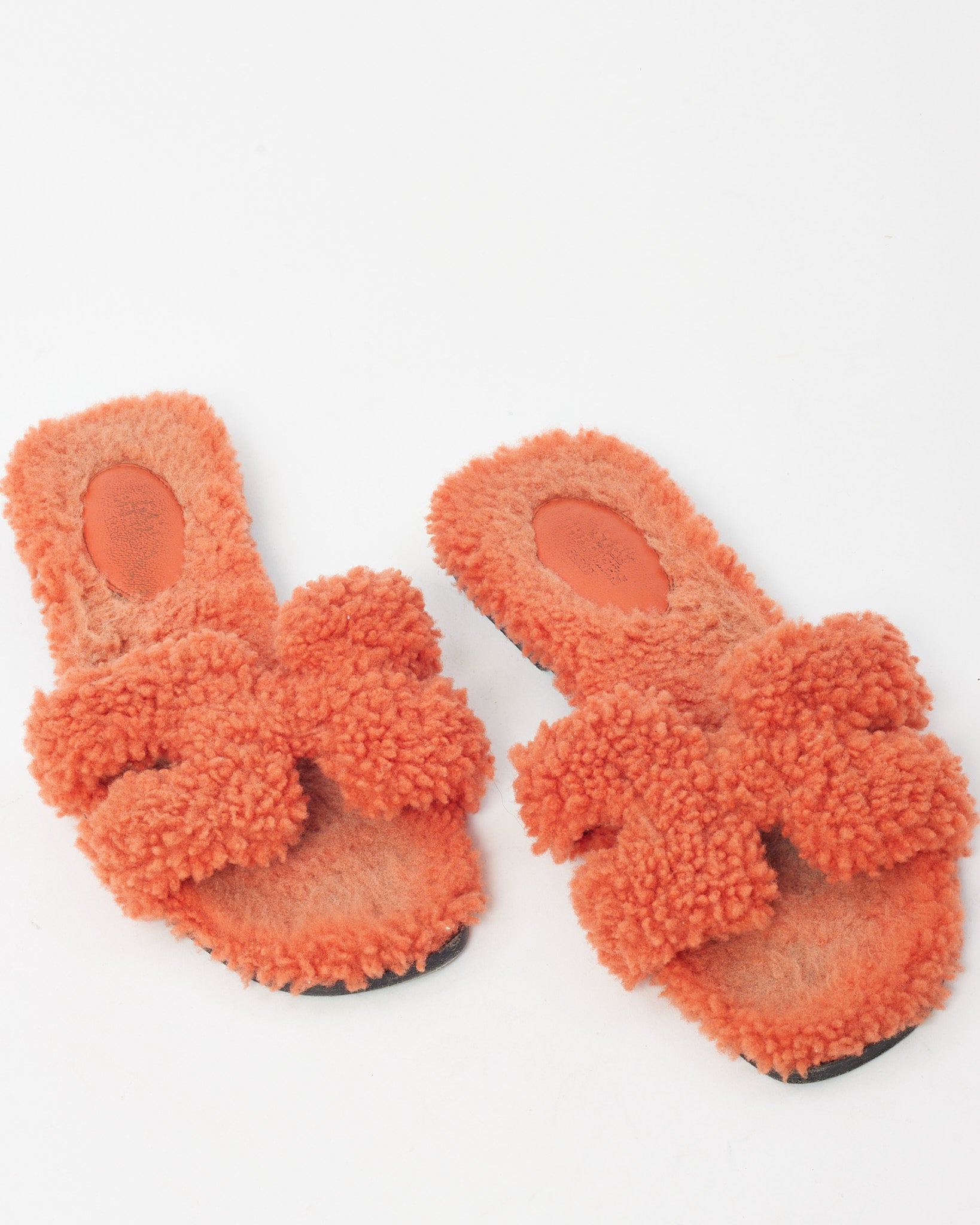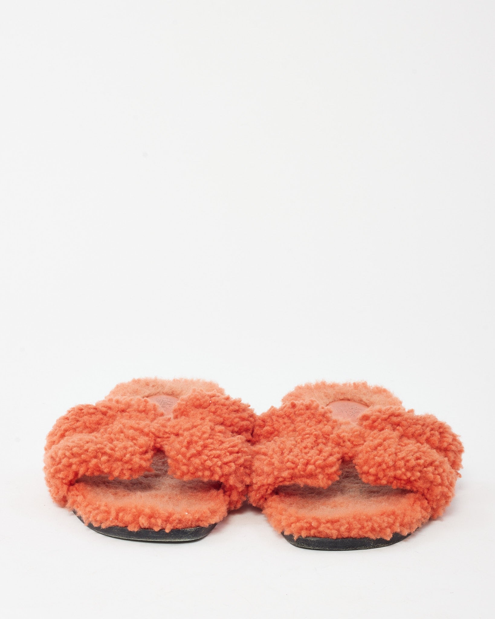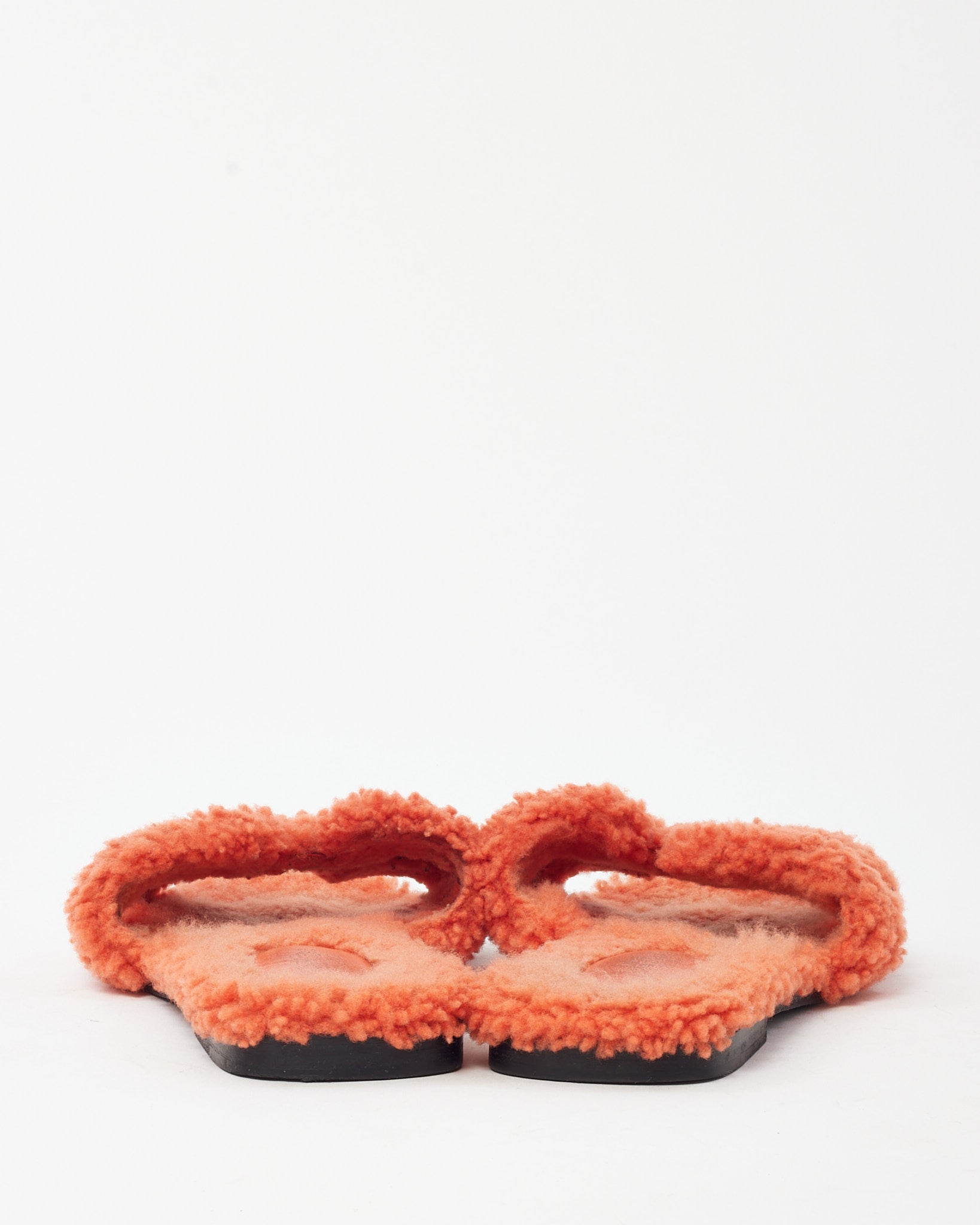 Slip into luxurious comfort with these pre-loved authentic Hermès Orange Coral Shearling Oran H Sandals in size 37. A bold twist on the iconic Oran silhouette, this pair is crafted from ultra-soft shearling in a vibrant coral hue, bringing cozy elegance to your off-duty wardrobe. The signature H cut-out upper adds a classic house touch, while the cushioned insole and leather sole ensure ease with every step. Ideal for lounging or adding a pop of color to casual looks year-round.