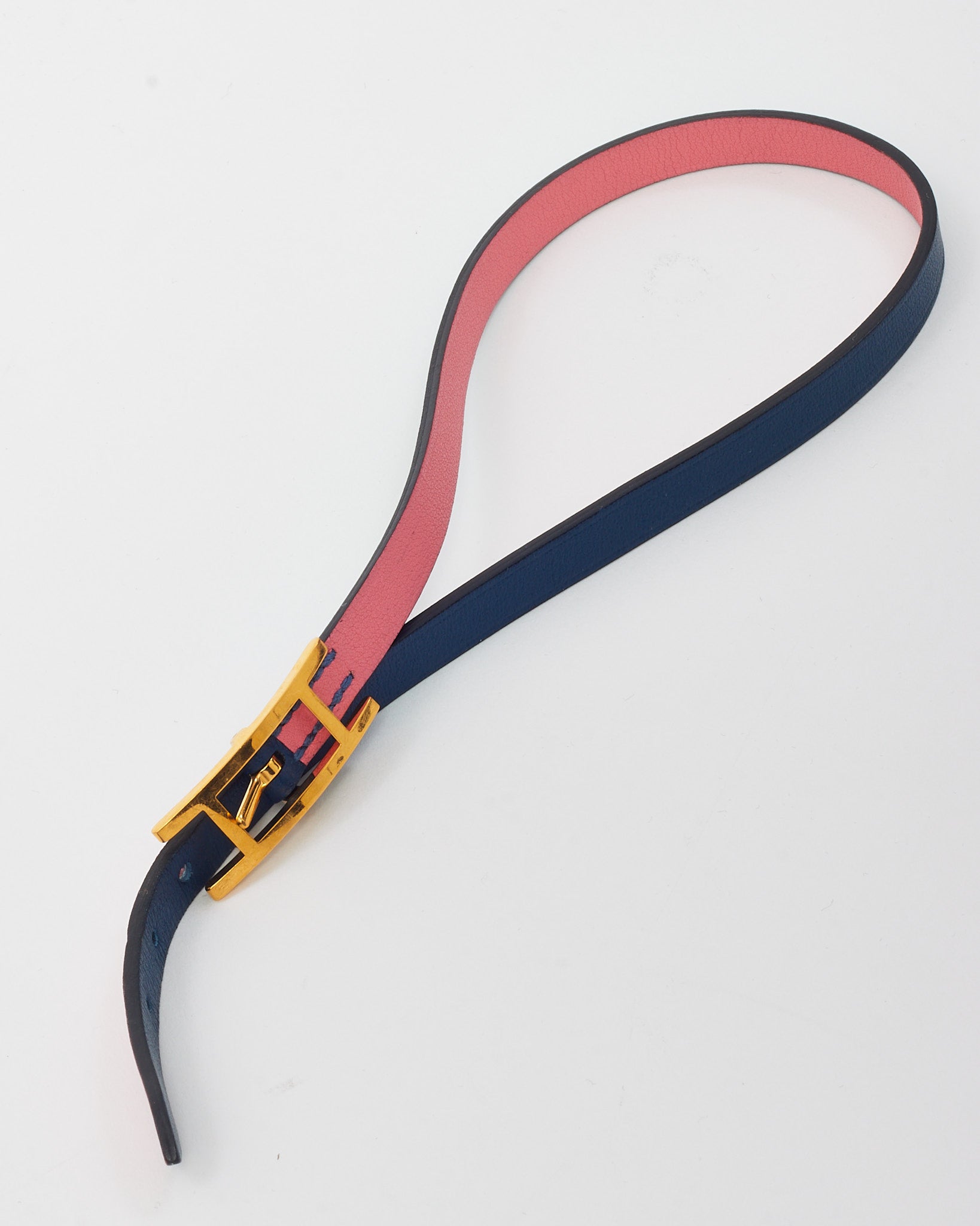 Add a refined pop of color to your wrist stack with this pre-loved authentic Hermès Behapi Double Tour Bracelet. Designed in a sleek pink and navy leather combination, it wraps the wrist twice for a chic, layered look. The gold-plated H clasp adds a luxurious signature touch, while the slim profile keeps it effortlessly wearable. Perfect for stacking or wearing solo, this timeless piece is crafted in size T2/S and embodies understated Parisian elegance.