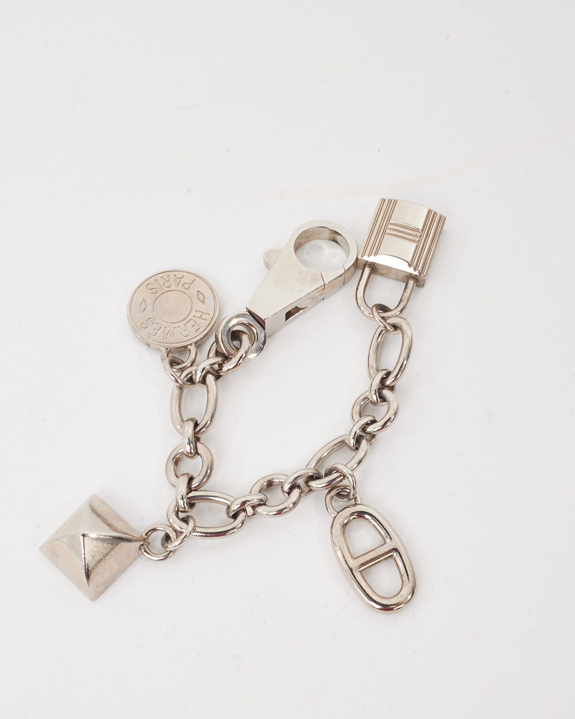 A refined and whimsical accessory, the pre-owned authentic Hermès Silver Palladium Olga 4 Amulet Bag Charm is the perfect finishing touch for any luxury handbag. Crafted from polished palladium-plated metal, this charm features four signature Hermès amulets, including the iconic padlock, key, and other house motifs, adding a playful yet elegant touch.