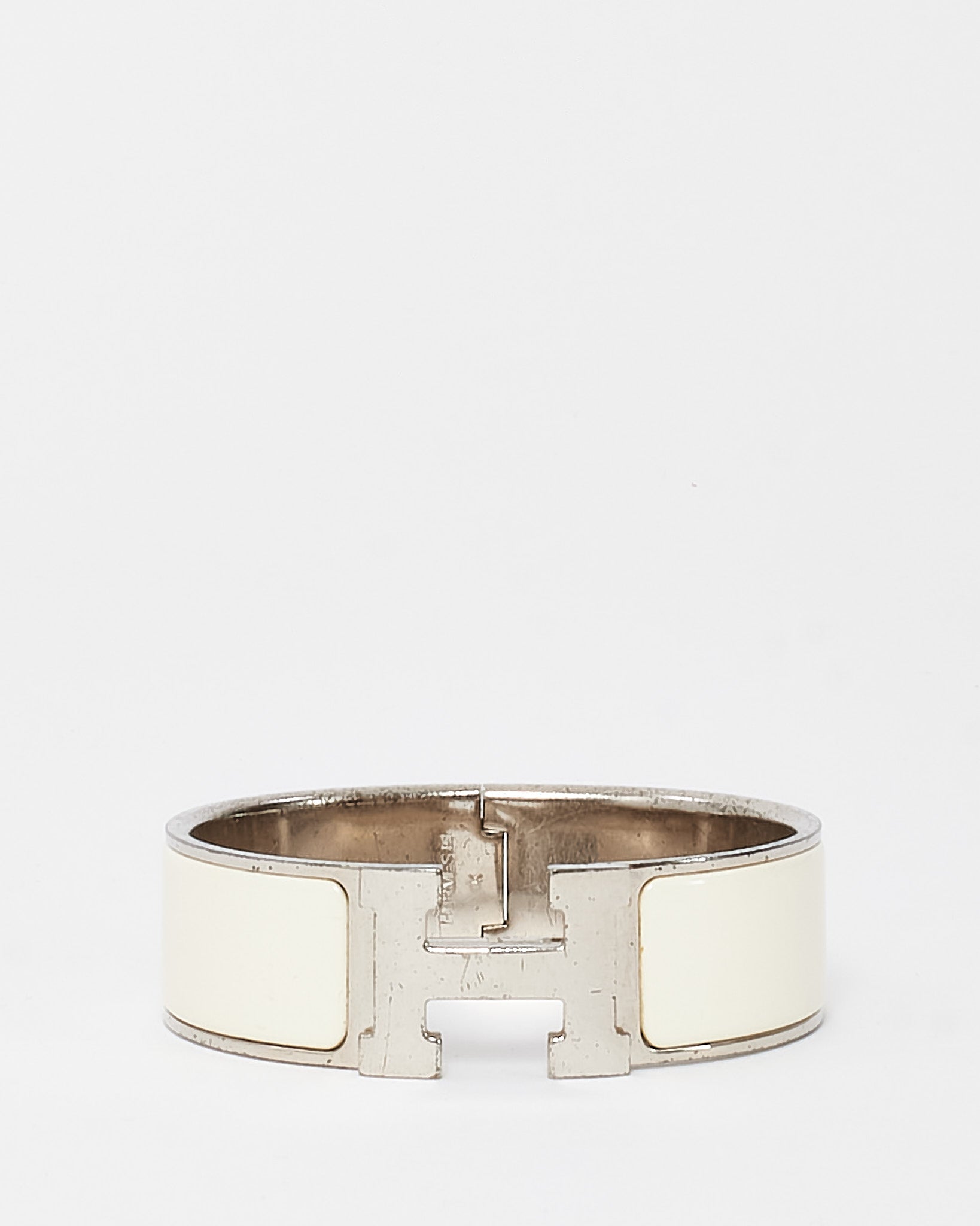 Timelessly elegant and instantly recognizable, this pre-loved authentic Hermès Clic Clac H Bracelet in the GM (Grand Modèle) size is a refined statement accessory. Crafted with sleek white enamel and polished silver-plated hardware, it features the iconic “H” clasp that opens with a discreet swivel mechanism. The wide silhouette offers bold sophistication, whether worn alone or stacked. Perfect for elevating everyday ensembles or completing a polished evening look, this bracelet embodies classic Hermès luxury with modern appeal.