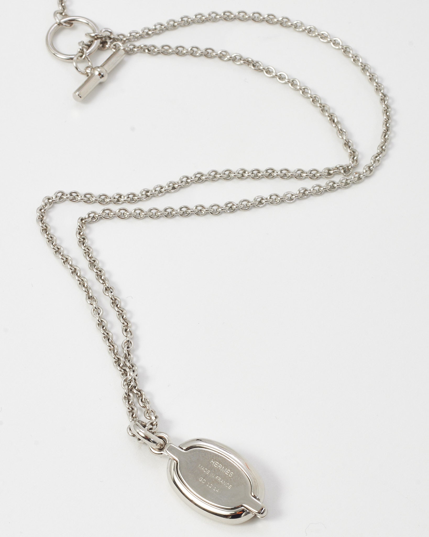 Refined and minimalist, this pre-loved authentic Hermès Mini Maillon Pendant Necklace is a subtle nod to timeless Parisian elegance. Crafted in sterling silver, it features the signature chain-link “Maillon” motif with a touch of crisp white enamel, suspended from a delicate silver chain. The sleek silhouette is ideal for layering or wearing alone as an understated everyday statement. With its clean lines and subtle branding, this piece embodies the quiet luxury Hermès is known for—making it a versatile addition to any modern jewelry collection.